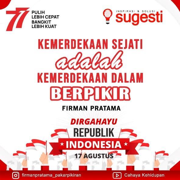 Saatnya di peringatan 77 tahun kemerdekaan Indonesia, maka kita benar benar menjadikan diri kita sendiri untuk merdeka berpikir, untuk berani bebas berpikir, untuk benar benar lepas dan penjajahan pikiran. Kalau para pejuang dulu sudah beranibebasberpikiruntukmembebaskannegeri ini dari penjajahan fisik dan wilayah maka saatnya kita “memproklamasikan” diri untuk berani menggunakanPikiranseutuhnya,untukberanibebas dalam mengatur Pikiran kita, sehingga ujungnya bebasmenentukankehidupankita.