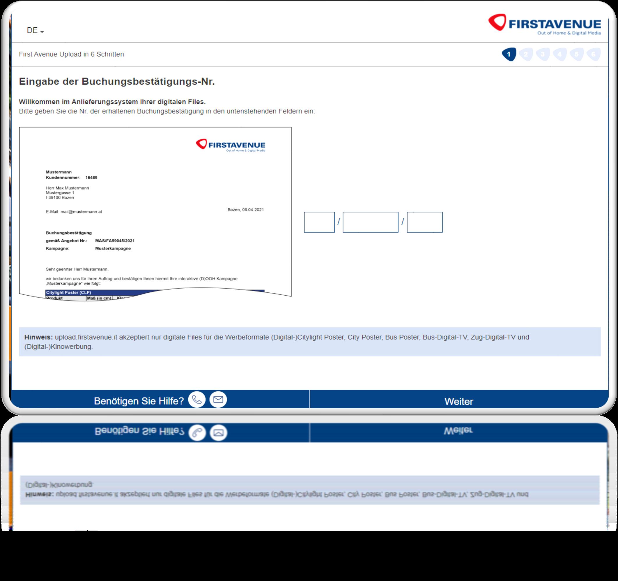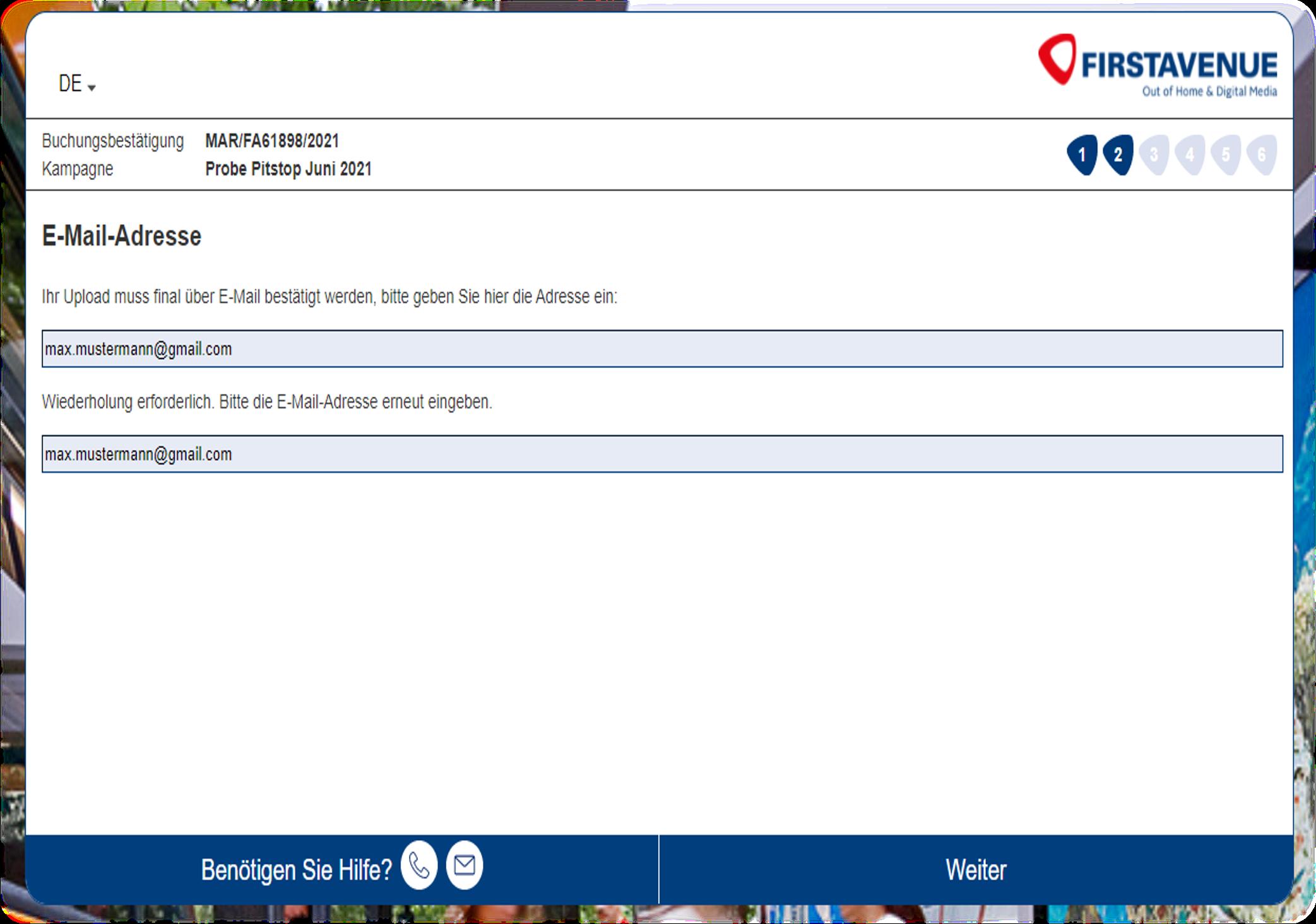 1. Eingabe E Mail Adresse. Diese muss gültig sein und wiederholt werden um dann fortzufahren. Bitte beachten Sie, dass der finale Upload über diese E Mail Adresse bestätigt werden muss.