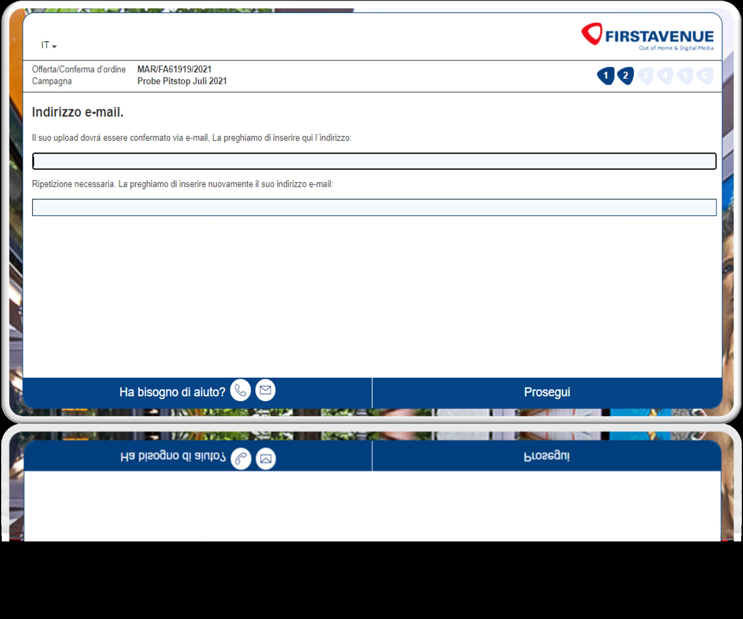 1. Inserimento indirizzo mail. Per procedere questo dovrá essere ripetuto. La preghiamo di considerare che upload finale dovrá essere confermato attraverso questo indirizzo mail.
