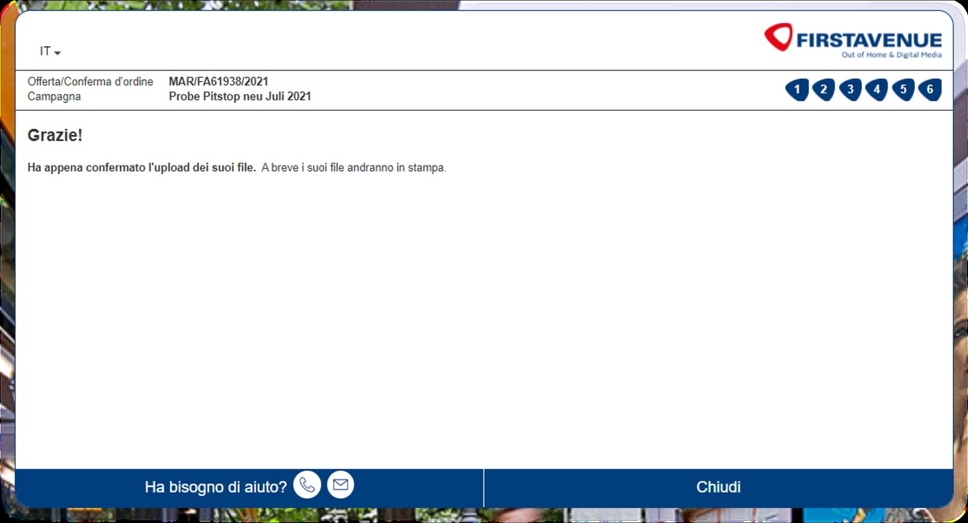 1. Inserimento numero della conferma ordine. à questo lo puó trovare nel documento di conferma della sua campagna. È formato da 3 campi: p.es. MAR/FA61898/2021