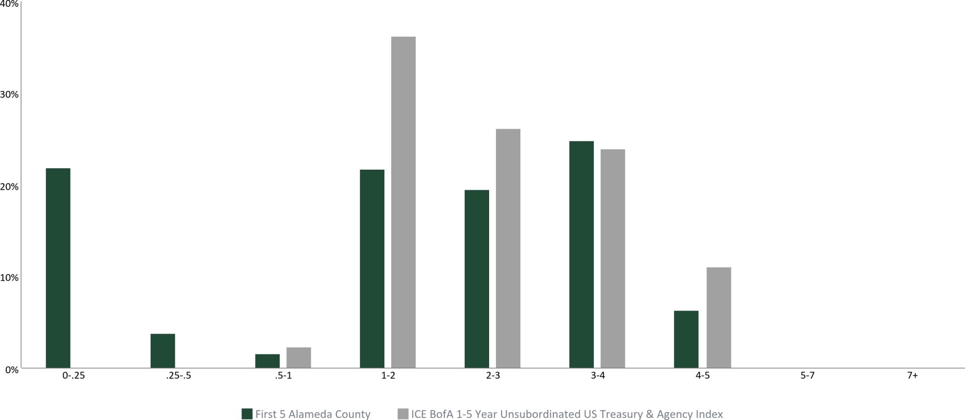 The performance objective of the First 5 Alameda County Agency portfolio is to earn a total rate of return that exceeds the total rate of return on a market benchmark index of 1-5 Year Government securities.