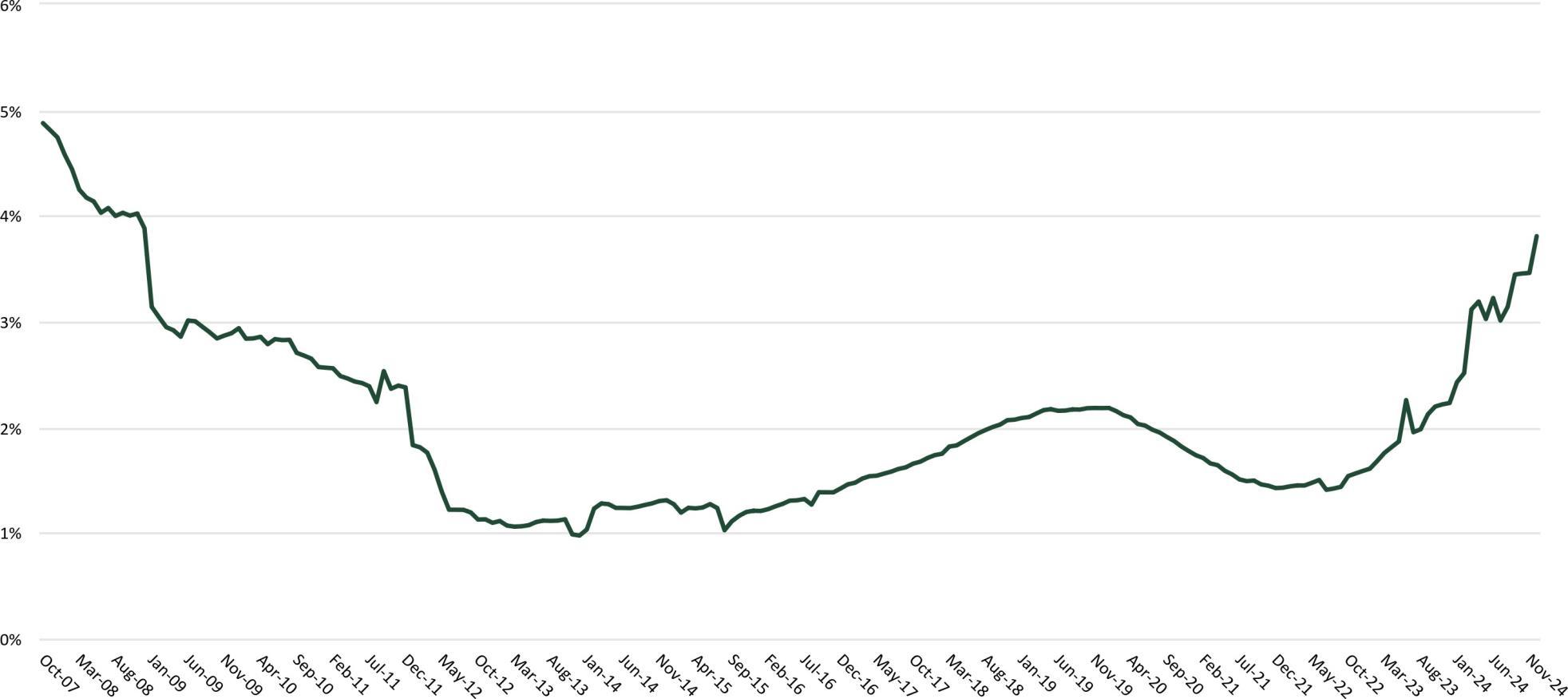 Housingstartssurged by 15.8% in December to 1.5millionunitsafterdeclining in thepriorthreemonths.Totalstartsaredown4.4% compared to December 2023. Thesupply of existinghomes is graduallybecomingmoreabundantaftertheperiod of scarcity as homeownersheldontotheirlowmortgagerates.TheFreddieMac30-yearfixedratemortgageaveragedapproximately6.7% in December.According to theCase-Shiller20-CityHomePriceIndex,housingpricesrose4.2%year-over-year in October,deceleratingfrom 4.6%reported in thepreviousmonth.Withmoreinventoryenteringthemarketthetrend is graduallyimproving;howeverhighermortgage rates continue to impact affordability.