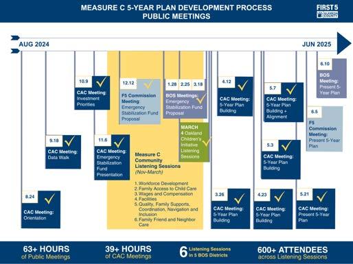 The Children's Health and Child Care Initiative for Alameda County (Measure C), a countywide measure, was passed by voters in March 2020 and names First 5 Alameda County as the administrator of the Child Care, Preschool, and Early Education portion of the revenue. Upheld by the courts in 2024, the Children's Health and Child Care Initiative for Alameda County is expected to raise approximately $150M annually for early care and education. In FY 2024-2025, First 5 Alameda County began implementation by staffing a Community Advisory Council and facilitating a series of Community Listening Sessions with community, providers, families, and early childhood partners to guide the development of the initial five-year program plan and budget. The Measure C 5-Year Program Plan and Executive Summary* will be presented to the First 5 Alameda County Commission and the Alameda County Board of Supervisors for approval in June 2025.