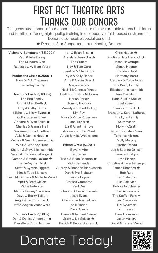 First Act Theatre Arts would like to extend special thanks to the following organizations and individuals for their generous contributions to this show.