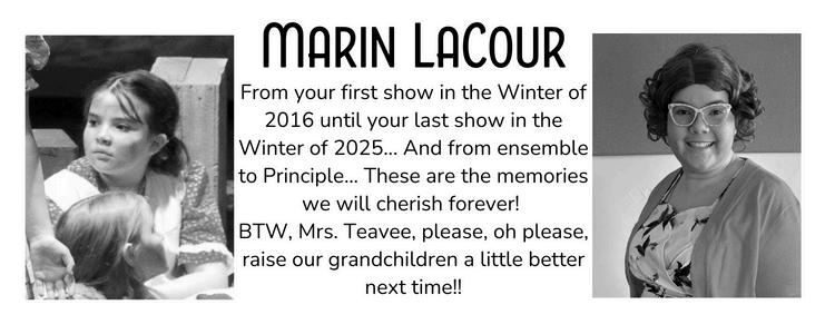Marin is 18 years old and a senior at Lee’s Summit North High School. This is her 25th show with First Act Theatre Arts. Marin’s favorite show she’s performed in is Descendants the Musical. Off stage, Marin enjoys reading, writing, drawing, and singing. Marin would like to thank her parents, friends, directors, and every person who has made a difference in her theater career!