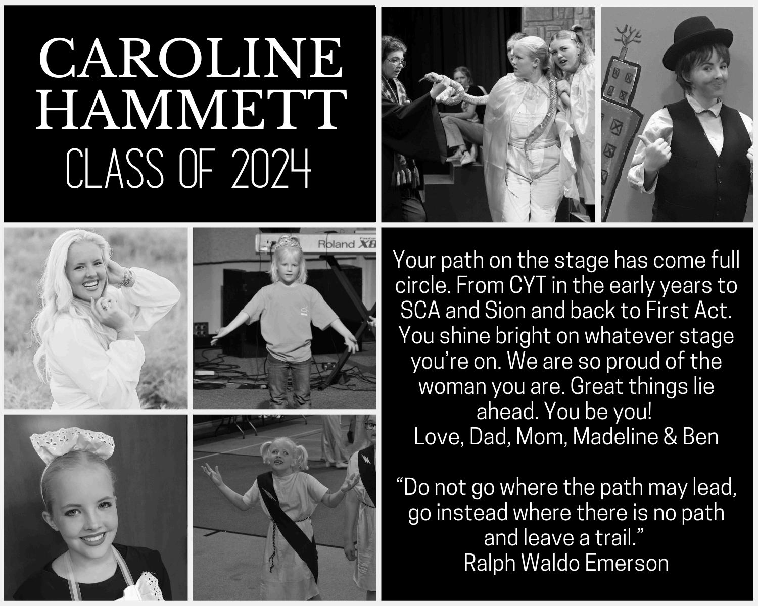 Caroline, Your first show was Hercules at 8 years old and here you are closing out your time on the stage with a last hurrah at First Act. We are so proud of you! Love, Dad, Mom, Madeline, & Ben