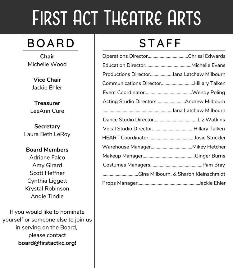 First Act Theatre Arts would like to extend special thanks to the following organizations and individuals for their generous contributions to this show.