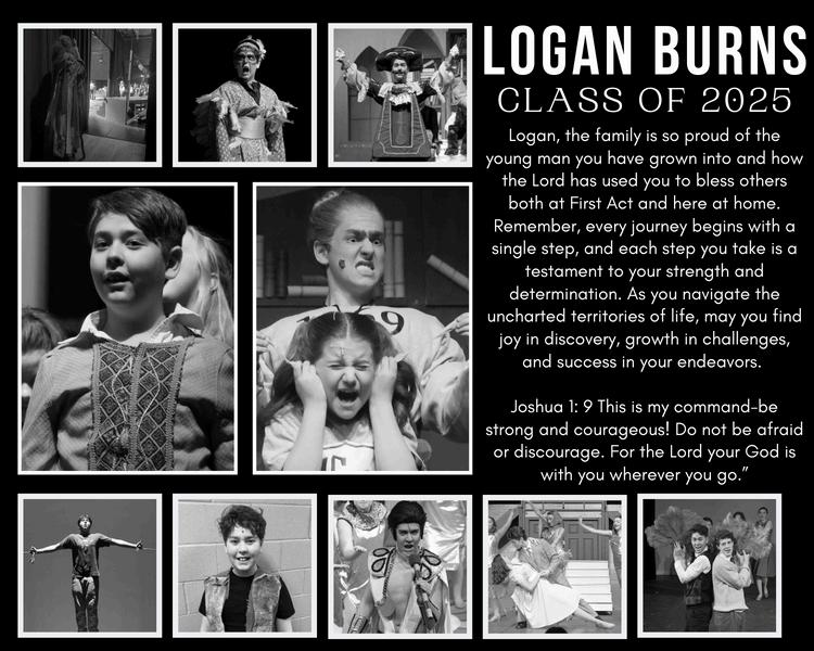 Logan is 18 years old and homeschooled as a Senior This is his 26th show with First Act Theatre Arts. Logan’s favorite show he’s performed in is Curtains The Musical. Off stage, Logan enjoys going to the gym with his friends, playing with his cat Timothee, and watching the new episode of Daredevil: Born Again every single week. Logan would like to thank his parents for always supporting him in wanting to pursue acting, his girlfriend Kaitlyn for always being there for him, and his friends Caleb, Hunter, and Philip for always coming to see these shows.