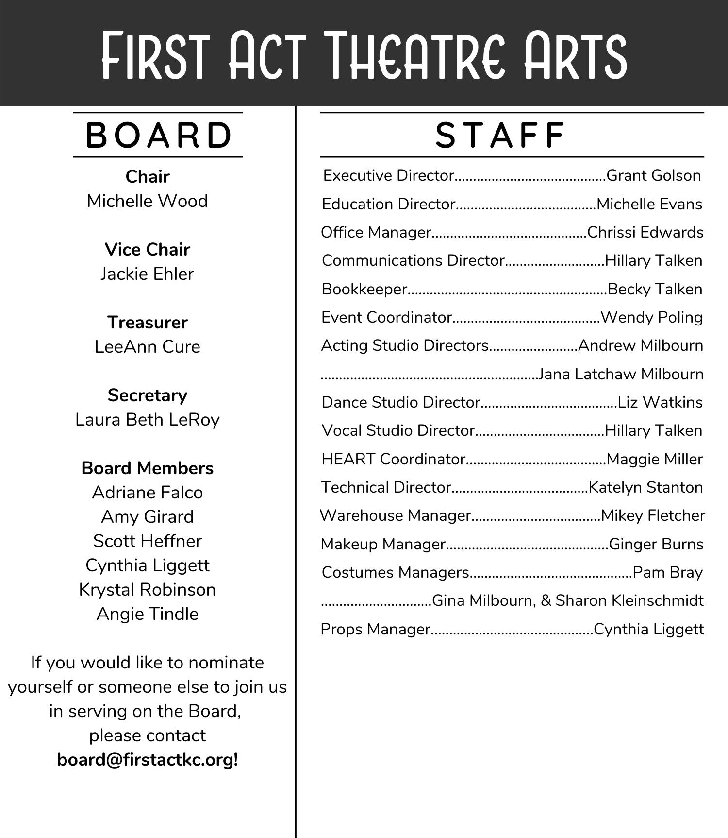 First Act Theatre Arts would like to extend special thanks to the following organizations and individuals for their generous contributions to this show.