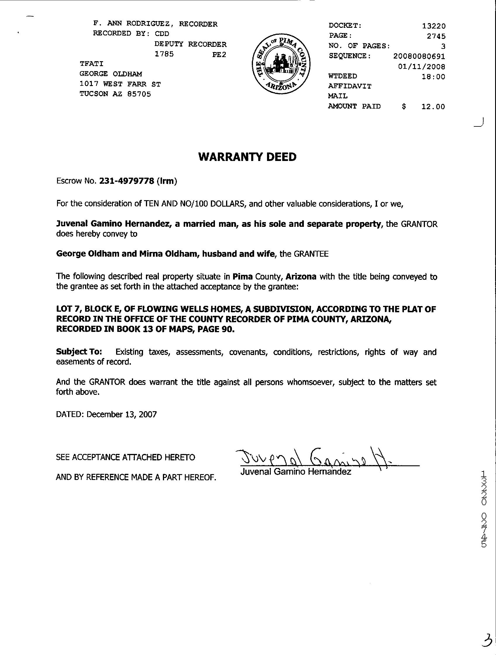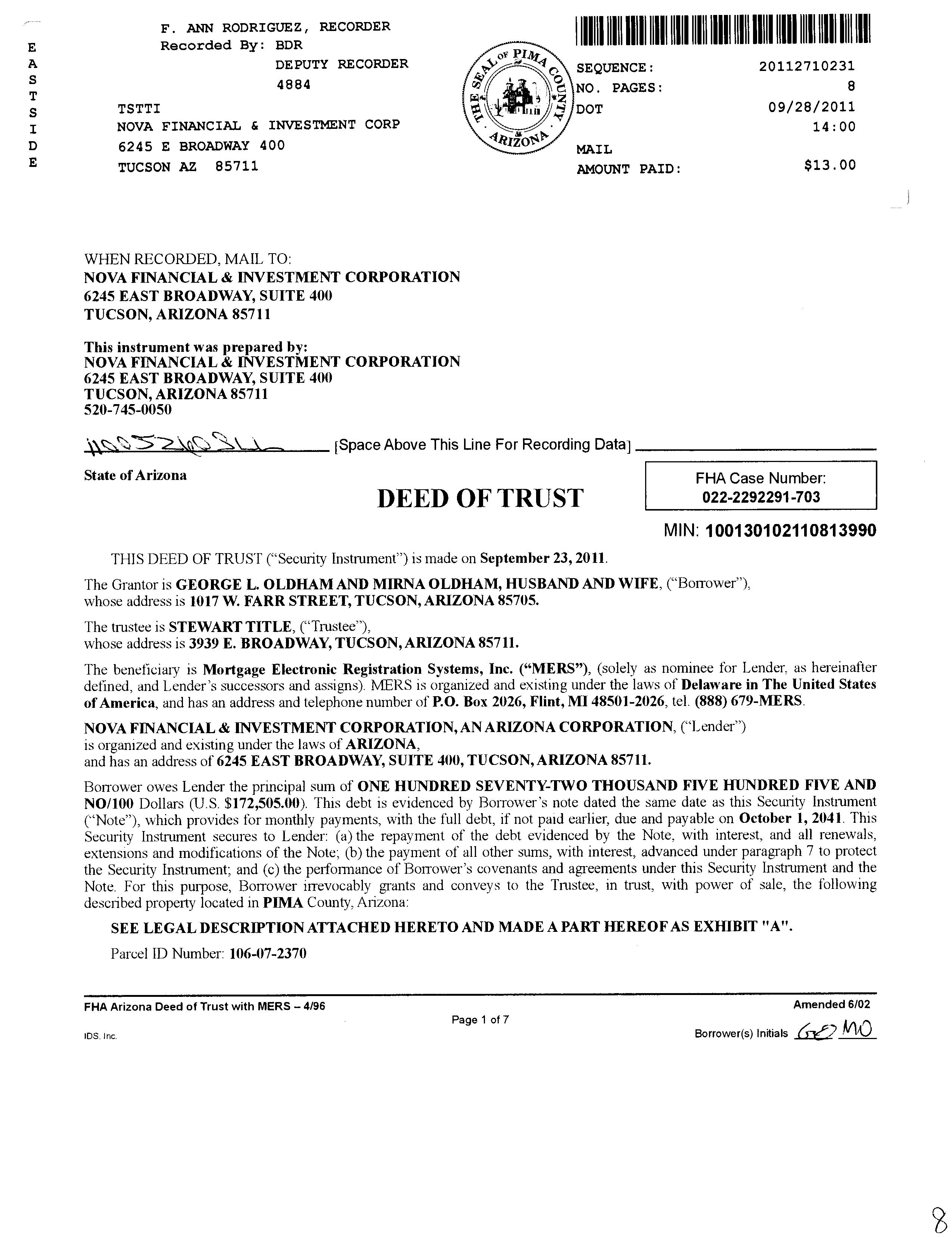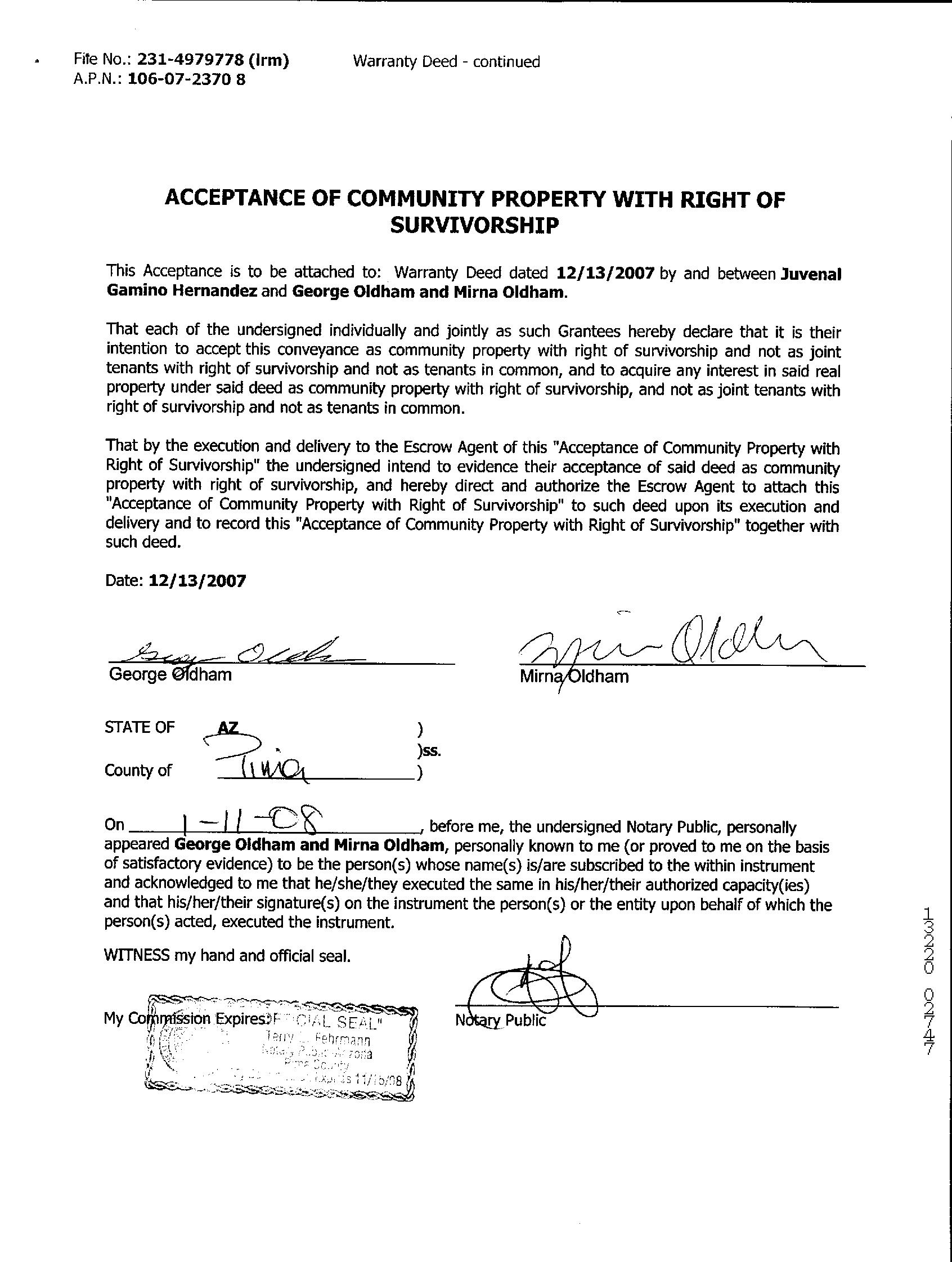 Owner Name: Oldham George /Oldham Mirna APN / Alternate APN: 106-07-2370 / Deed Type: Warranty Deed