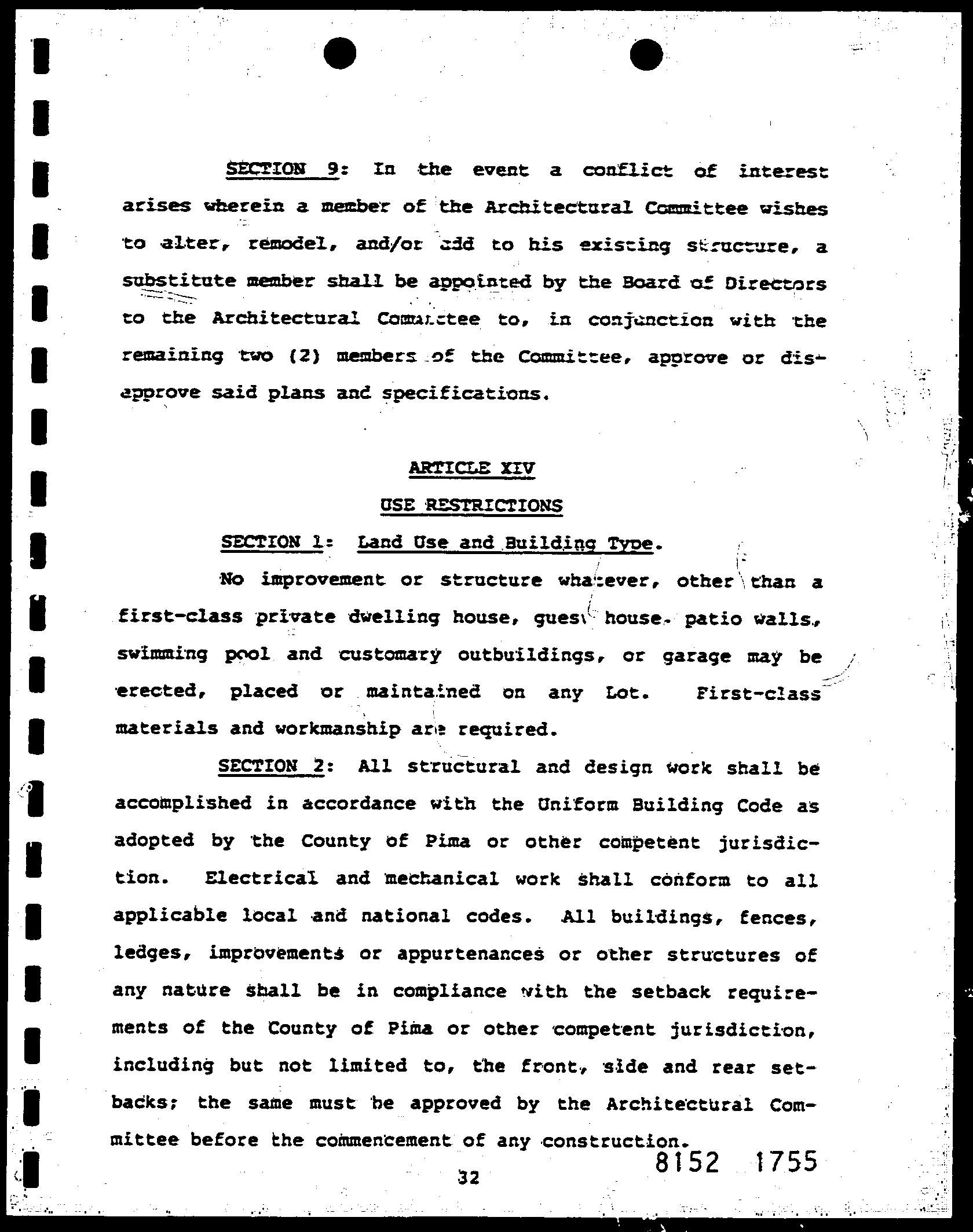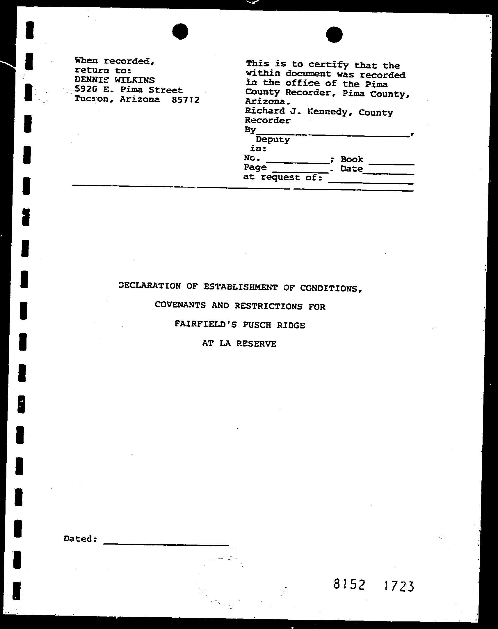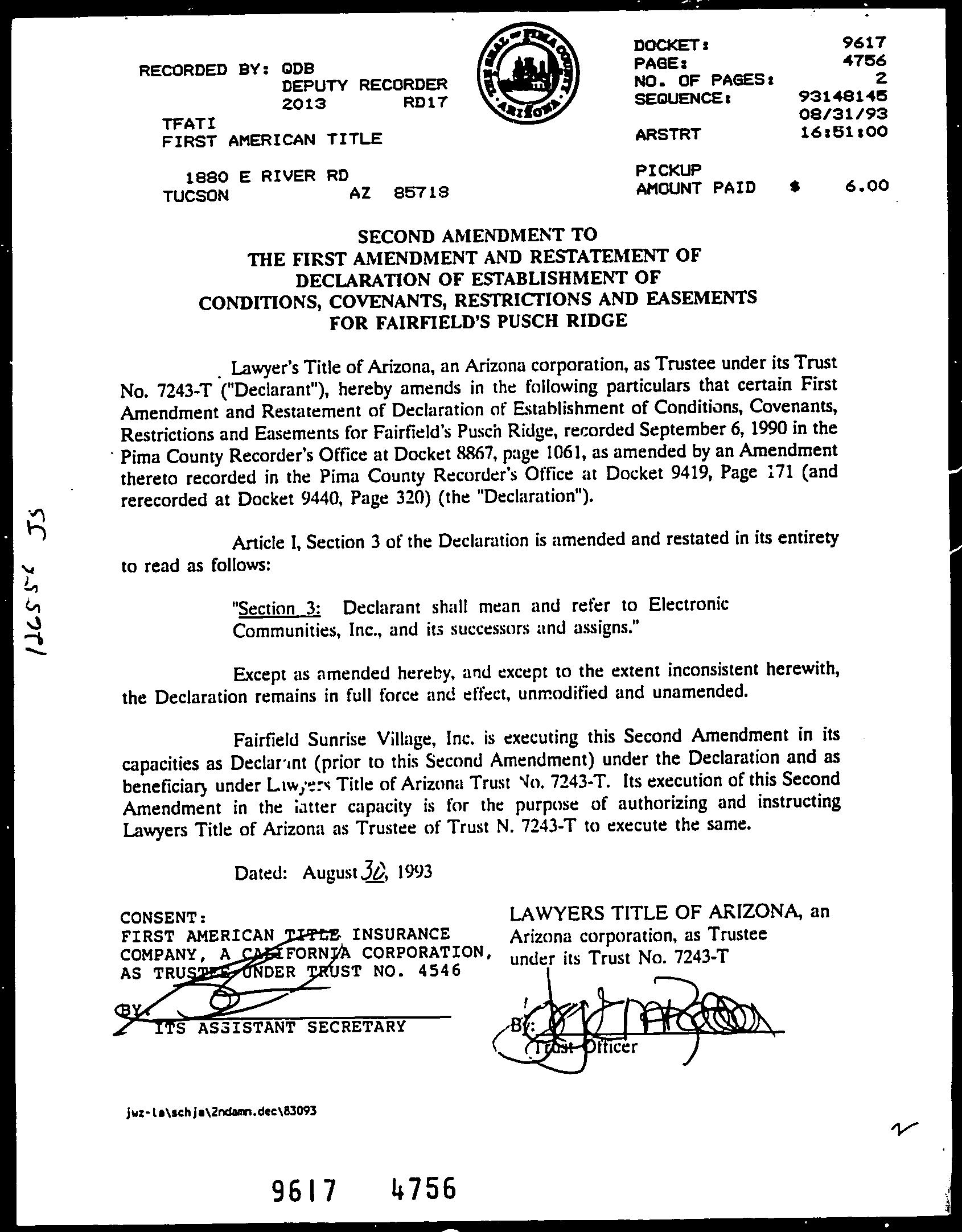 ConditionsCovenants,&Restrictions Thank you for the opportunity to be of service. Restrictions indicating a preference, limitation or discrimination based on race, color, religion, sex, handicap, familial status, or national origin are hereby deleted to the extent such restrictions violate 42 USC 3604(c). This information is furnished without fee and without benefit of a complete title search. No liability is assumed by First American Title or Title Security. If it is desired that liability be assumed, you may apply for a policy of title insurance with First American Title Insurance Company.