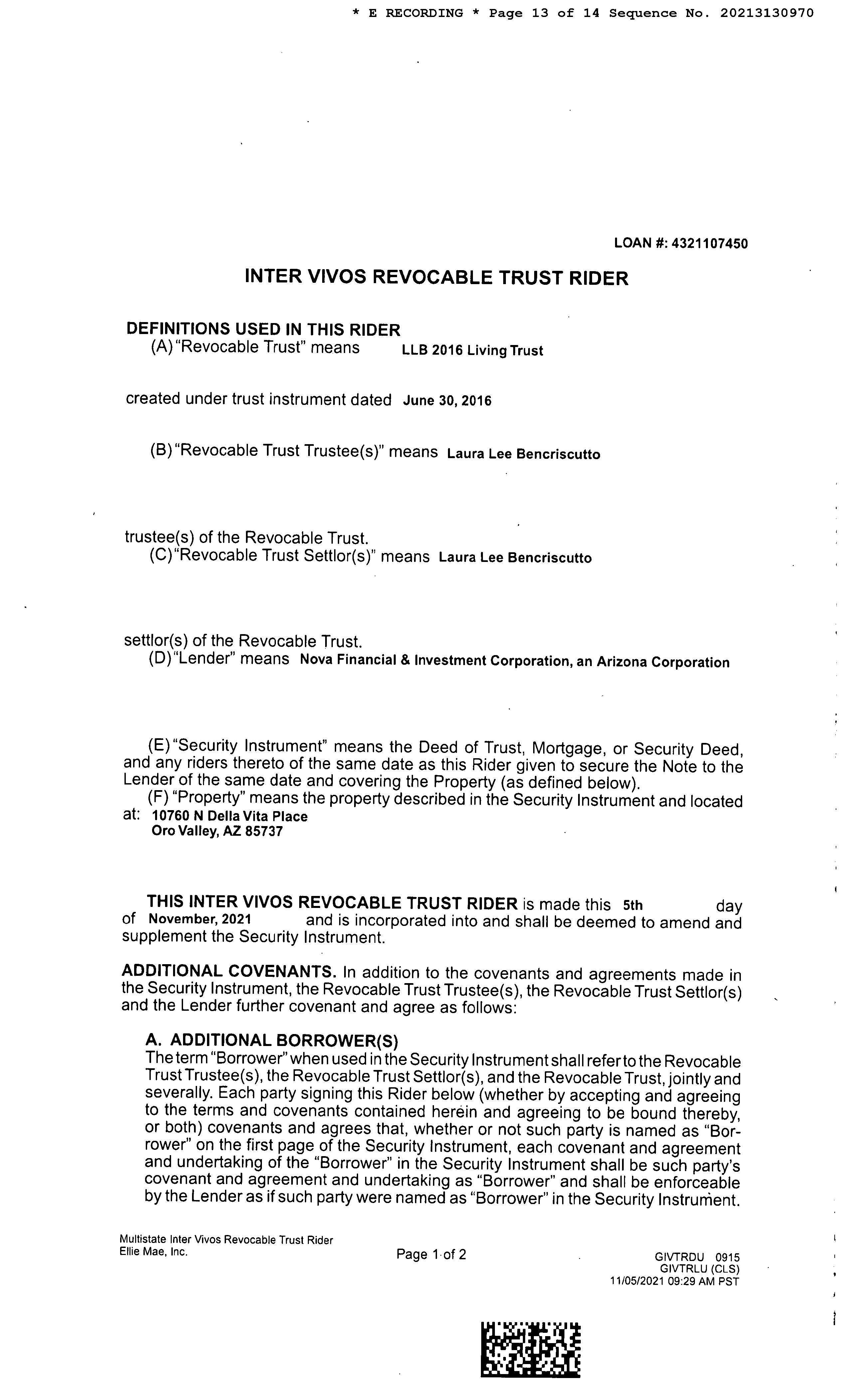 Subject Property : 10760 N Della Vita Pl Tucson AZ 85737 Owner Information Owner Name : 2016 Llb Living Trust Mailing Address : 10760 N Della Vita Pl, Tucson AZ 85737-6066 R071 Vesting Codes : / / Living Trust Owner OccupiedIndicator : O Location Information Legal Description : Pusch Ridge Lot 6 County : Pima, Az APN : 220-11-1930 Census Tract / Block : 47.28 / 3 Subdivision : Pusch Rdg Township-Range- Sect : 12S-14E-8 Map Reference : 08-12S-14E Legal Book/Page : 63-13 School District : Amphitheater Legal Lot : 6 Munic/Township : Amphitheater Market Area : 420 Last Market Sale Information Recording/Sale Date : 11/09/2021 / 11/05/2021 1st Mtg Amount/Type : $538,250 / Cnv Sale Price : $960,000 1st Mtg Document # : 3130970 Document # : 3130969 1st Mtg Term : 30 Deed Type : Warranty Deed Price Per SqFt : $446.10 Title Company : Title Sec Agcy Llc Lender : Nova Fin'l & Inv Corp Seller Name : Shea Christopher P & Mary E Prior Sale Information Prior Rec/Sale Date : 02/28/2020 / 02/12/2020 Prior Doc Number : 590652 Prior Sale Price : $750,760 Prior Deed Type : Warranty Deed Customer Name : Jeremiah Stiffler Customer Company Name : First American Prepared On : 08/12/2022 © 2022 CoreLogic. All rights reserved
