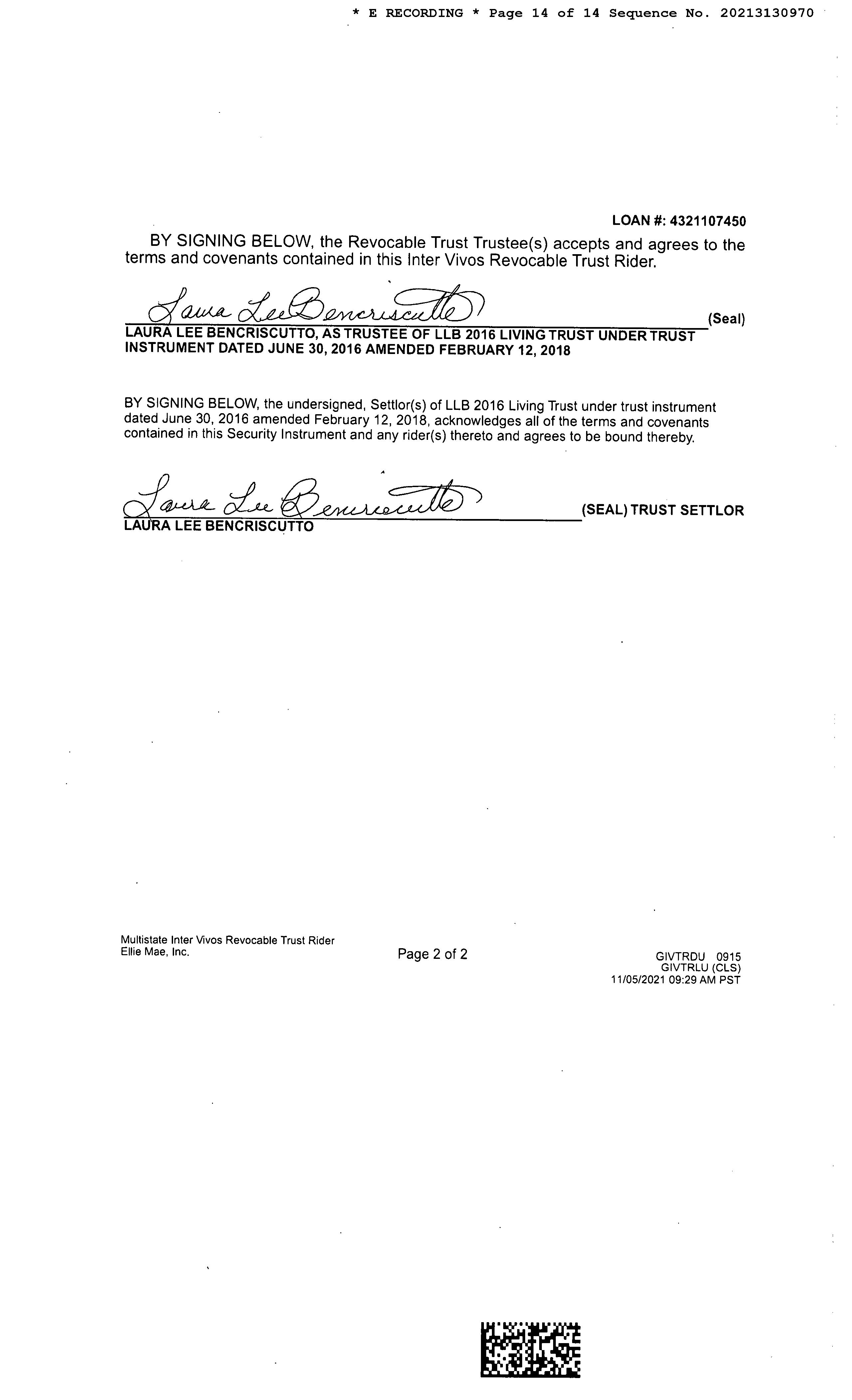 + FIRST AMERICAN TITLE, FC0, JSTI PIMA, AZ 08/12/2022 08:52AM ZFHY INVESTIGATIVE SEARCH RESULTS PAGE 1 OF 1 SEARCH PARAMETERS PARCEL: 220-11-1930 PARCEL: 220-11-1930 INSTRUMENT REC DATE OWNER: BENCRISCUTTO LAURA LEE AFFIDAVIT 2021 3130969 11/09/2021 SITUS: 10760 N DELLA VITA PL TUCSON MAIL: 10760 N DELLA VITA PL PLAT: LOT 00006 BLOCK LEGAL: PUSCH RIDGE LOT 6 CURRENT TAXES INFORMATION THROUGH 07/28/2022 LAND IMPR EXEMPT RATE AREA SPECIAL DISTRICTS PRIMARY 51,733 0 0 9.4097 1012 SECONDARY 50 53,773 0 5.3279 2021 TOTAL TAX BILLED 7,624.22 2021 TAX AMT TAX DUE INTEREST DATE PAID TOTAL DUE FIRST HALF 3,812.11 0.00 0.00 11/12/2021 0.00 SECOND HALF 3,812.11 0.00 0.00 05/28/2022 0.00 TOTAL CURRENT TAXES DUE 08/22 0.00 09/22 0.00 IMPROVEMENTS BYPASS BLDG SQFT 2,152 FULL CASH VALUE 538,229 YEAR BUILT 2007 LAND USE 01 41 NUMBER OF STORIES 1.0 LOT SIZE 12,669 SQ FT STORIES HEIGHT 0 SCHOOL DISTRICT 1012 EXTERIOR WALLS OTHER LAND FULL CASH VALUE 502 GRADE MATERIALS IMPR FULL CASH VALUE 537,727 SALES SALE DATE SALE AMOUNT INSTRUMENT TYPE SELLER NAME VALIDITY 11/09/2021 960,000 2021 3130969 WD SHEA CHRISTOPHER P MARY E 02/28/2020 750,760 2020 590652 WD DELLA VISTA LLC ADDITIONAL PROPERTY INFORMATION STANDARD LAND USE: SFR END SEARCH