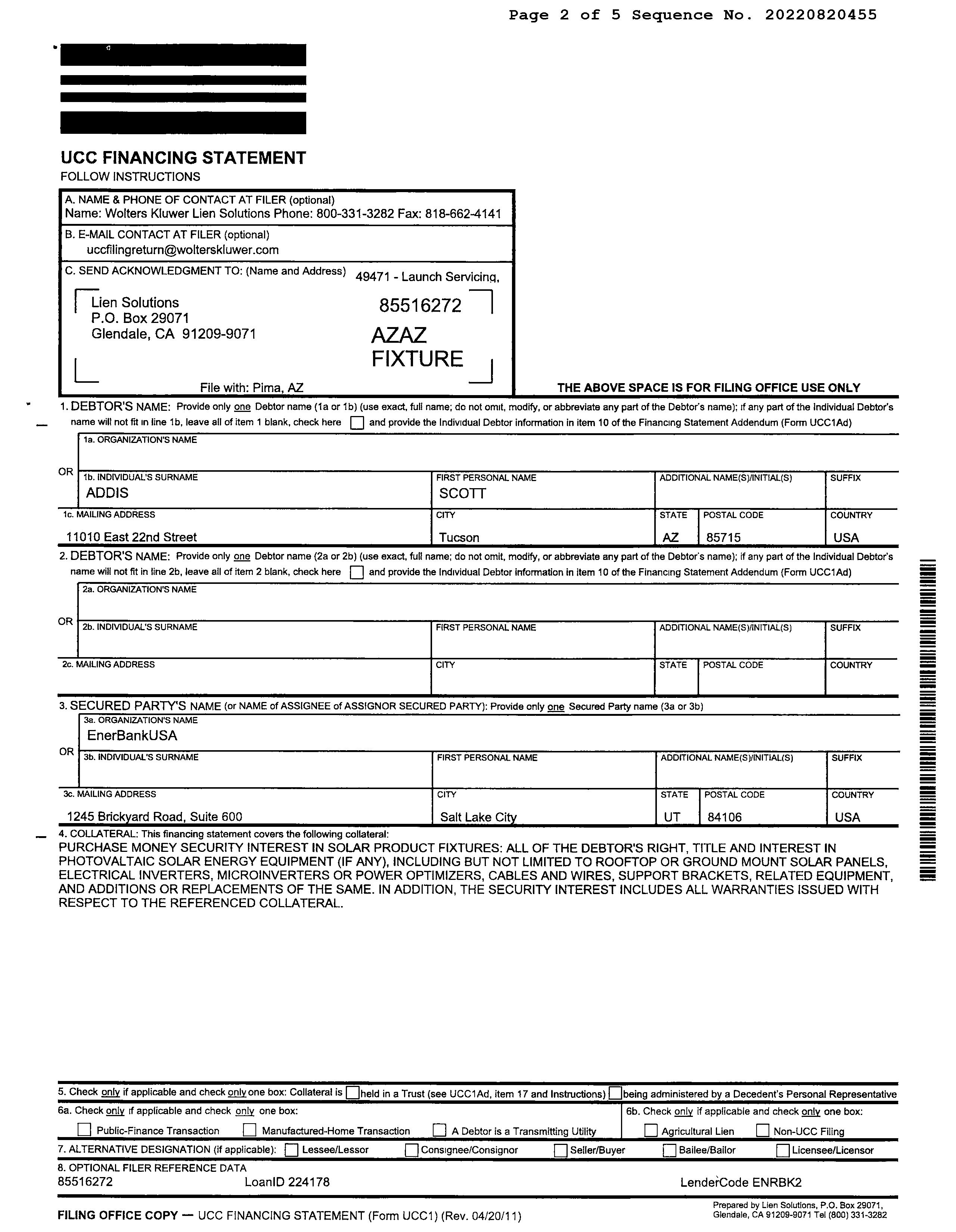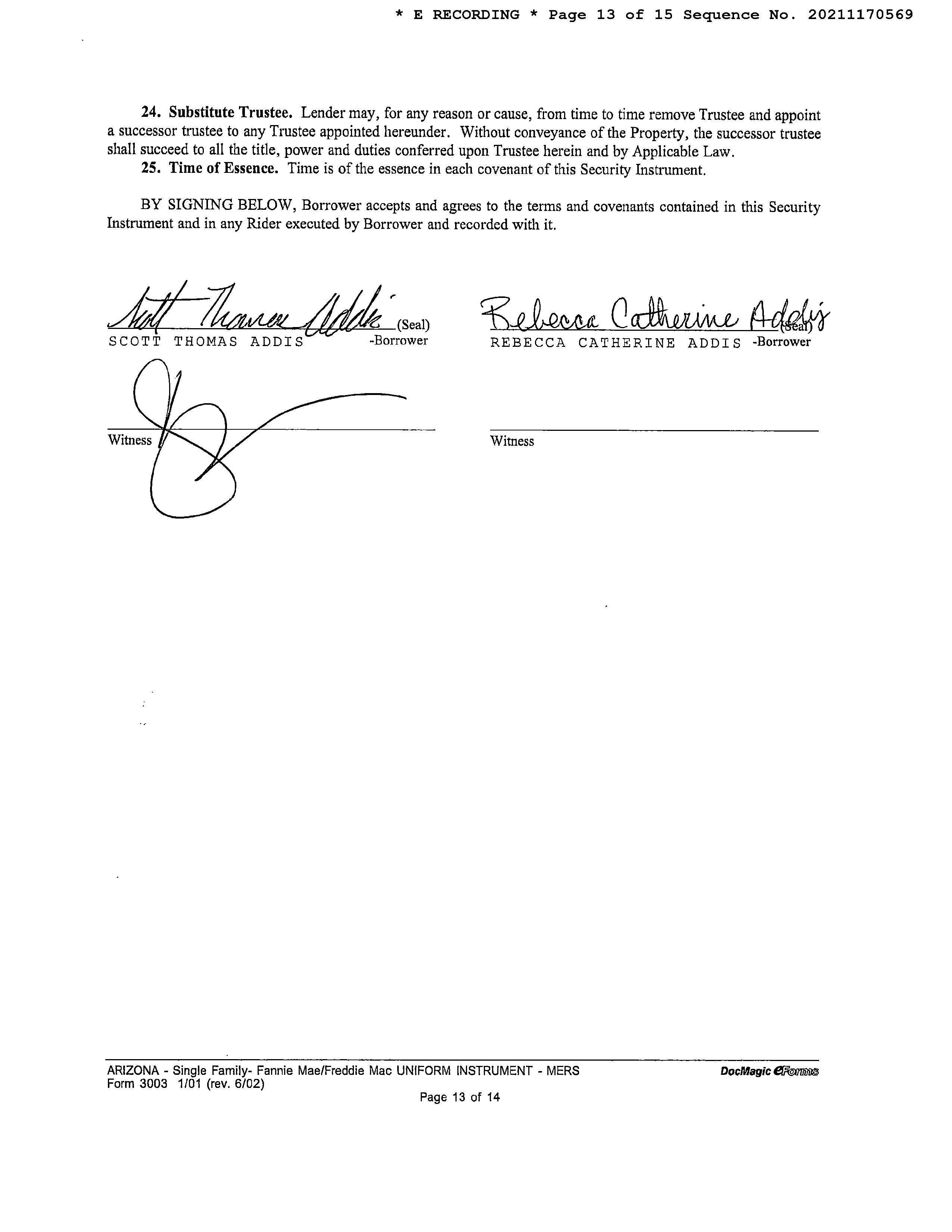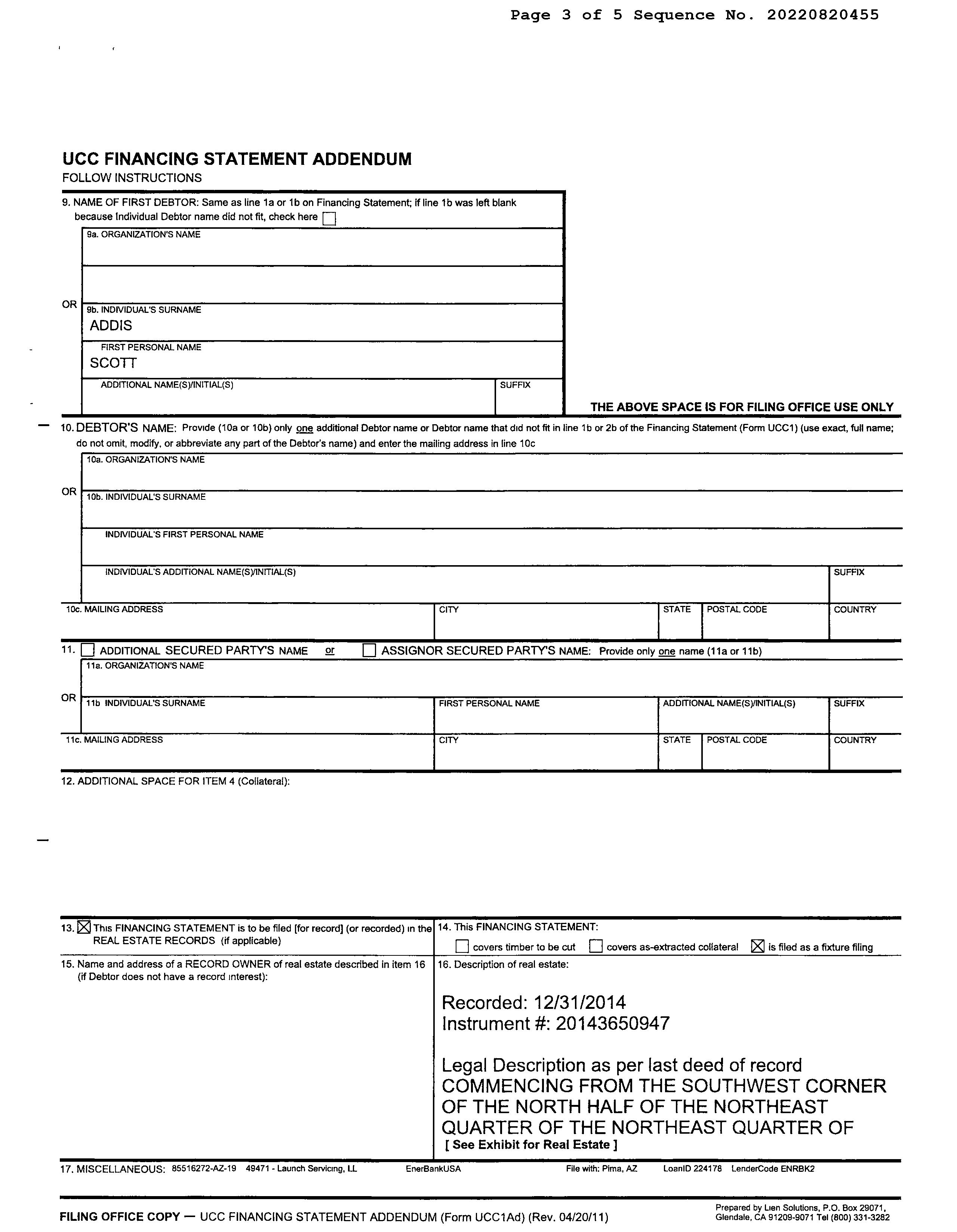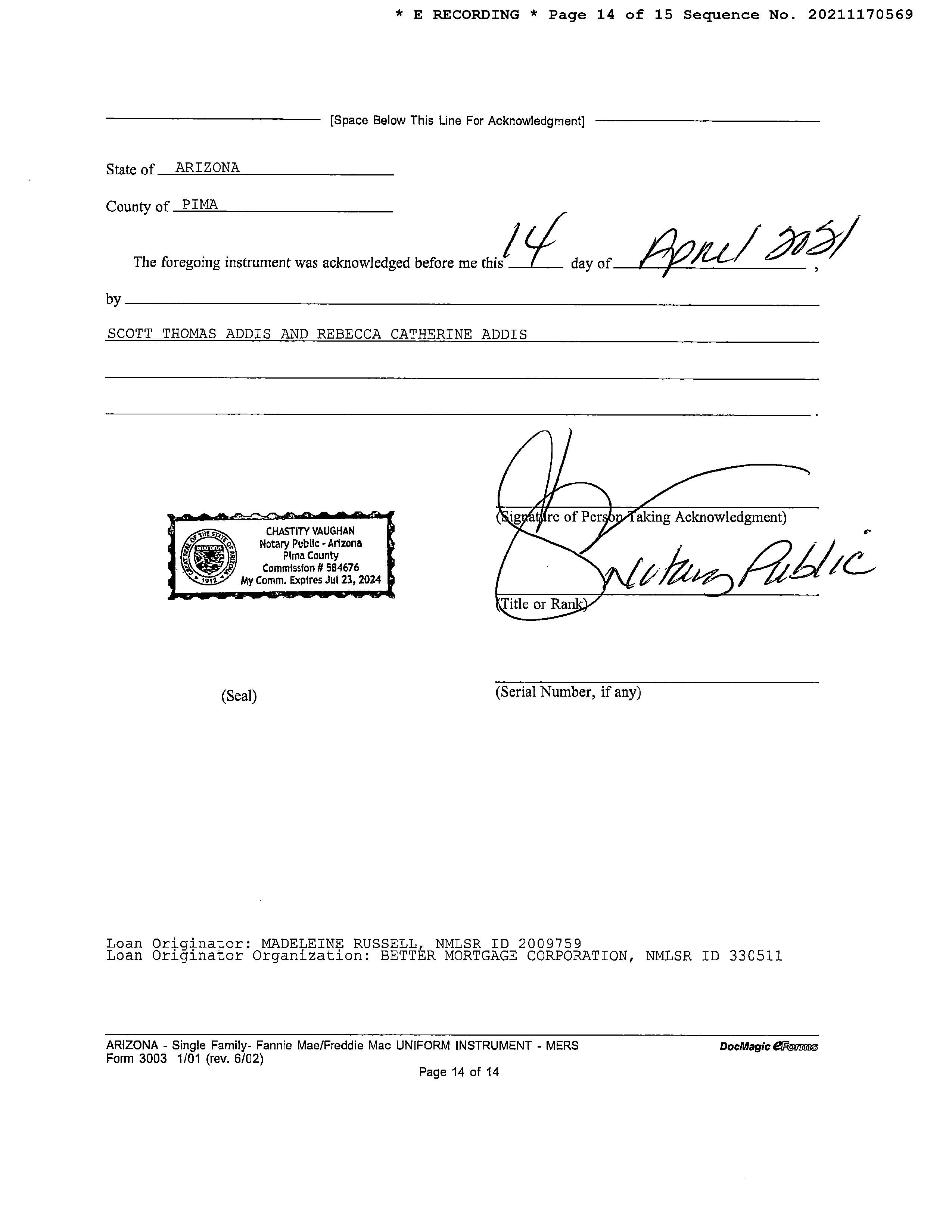 Owner Name : Addis Scott Thomas / Addis Rebecca Catherine Mailing Address : 11010 E 22nd St, Tucson AZ 85748-7023 C003