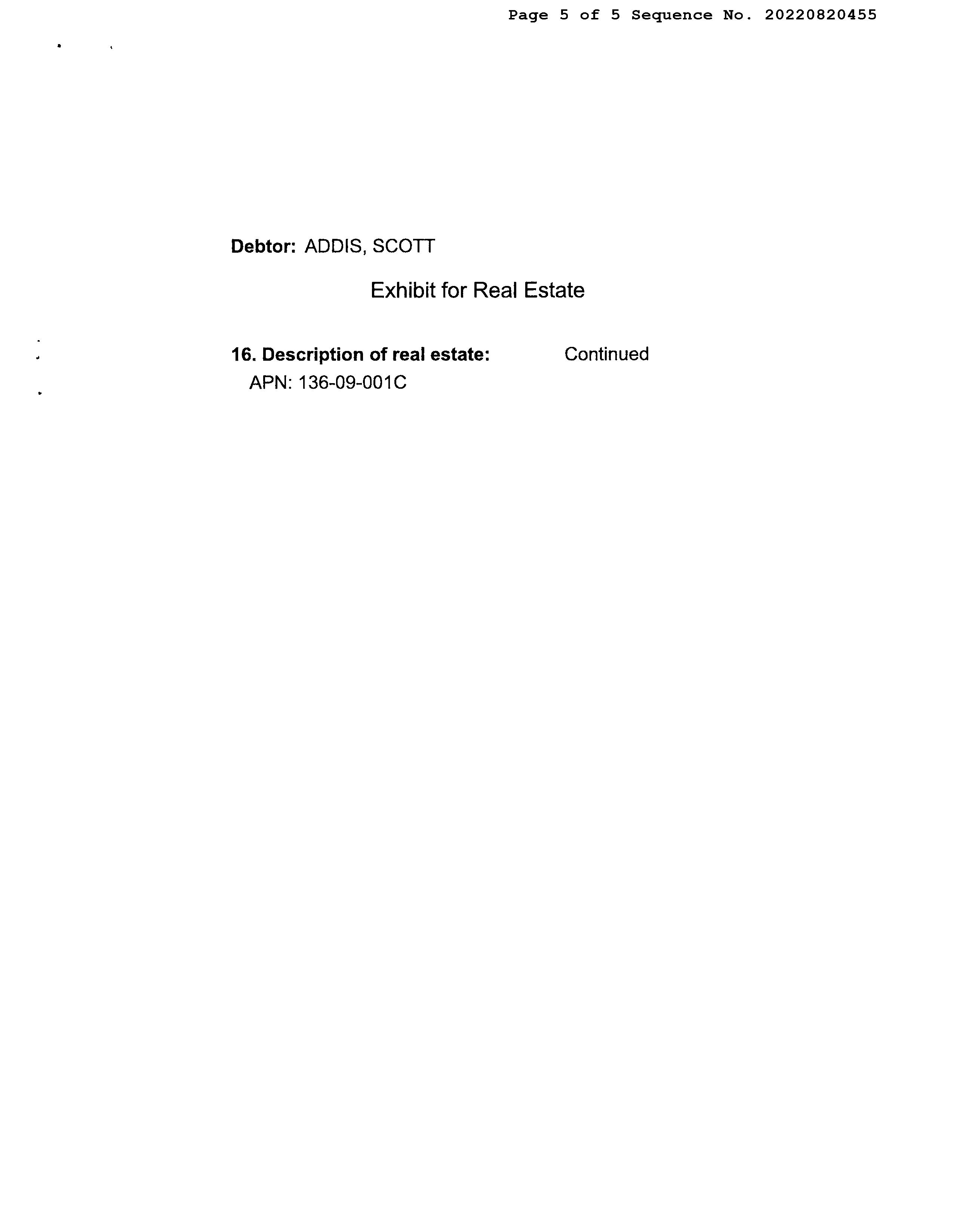 Owner Name: Addis Scott Thomas /Addis Rebecca Catherine APN / Alternate APN: 136-09-001C / Deed Type: Joint Tenancy Deed Land Use: Sfr Subdivision / Tract: / Lot Size: 154,435 Year Built / Eff: 1987 / Rec. Date / Price: 12/31/2014 / $265,000 Living Area: 2,224 # of units: