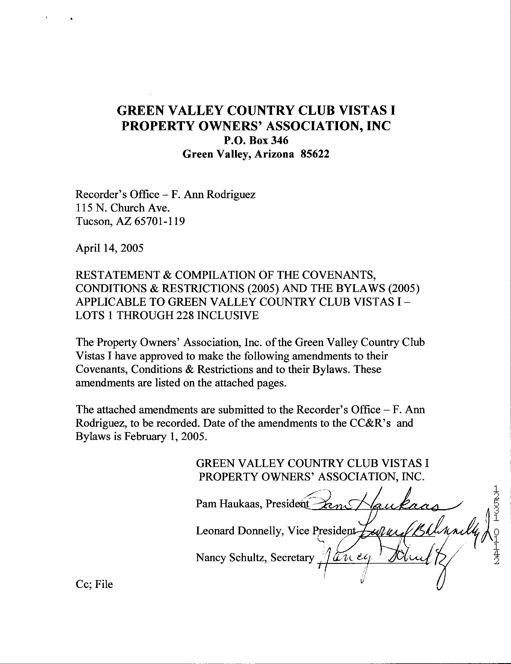 ©2021 First American Financial Corporation and/or its affiliates. All rights reserved. NYSE: FAF 05252610821 COVENANTS, CONDITIONS & RESTRICTIONS PREPARED FOR : First American Title Insurance Company, and the operating divisions thereof, make no express or implied warranty respecting the information presented and assume no responsibility for errors or omissions. First American, the eagle logo, First American Title, and firstam.com are registered trademarks or trademarks of First American Financial Corporation and/or its affiliates. 1111 N. Avenida Canon Del Cajon Green Valley, AZ 85614