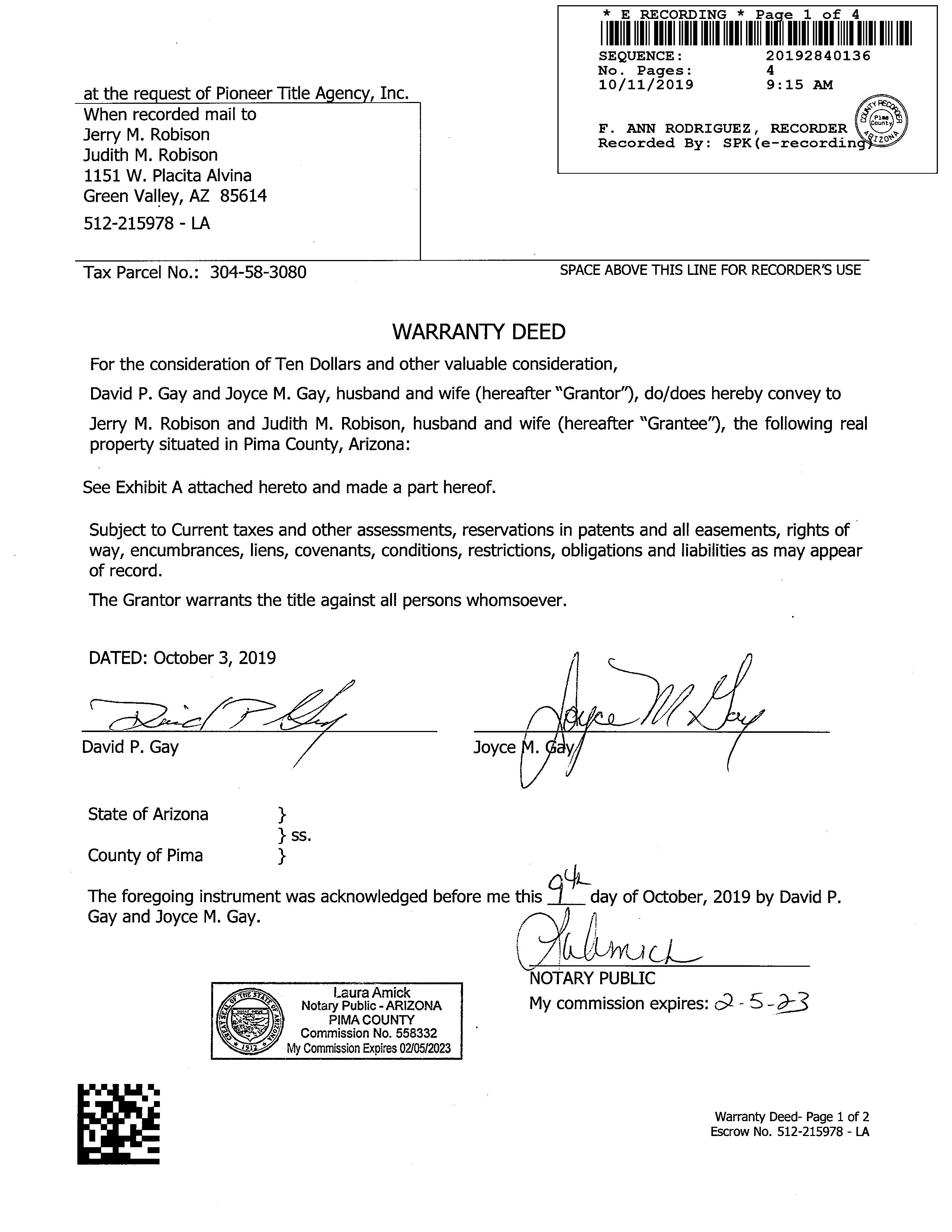 Owner Name: Robison Jerry M /Rs Judith M APN / Alternate APN: 304-58-3080 / Deed Type: Warranty Deed Land Use: Sfr Subdivision / Tract: Highpointe / Lot Size: 7,021 Year Built / Eff: 1994 / Rec. Date / Price: 10/11/2019 / $268,500 Living Area: 2,109 # of units: