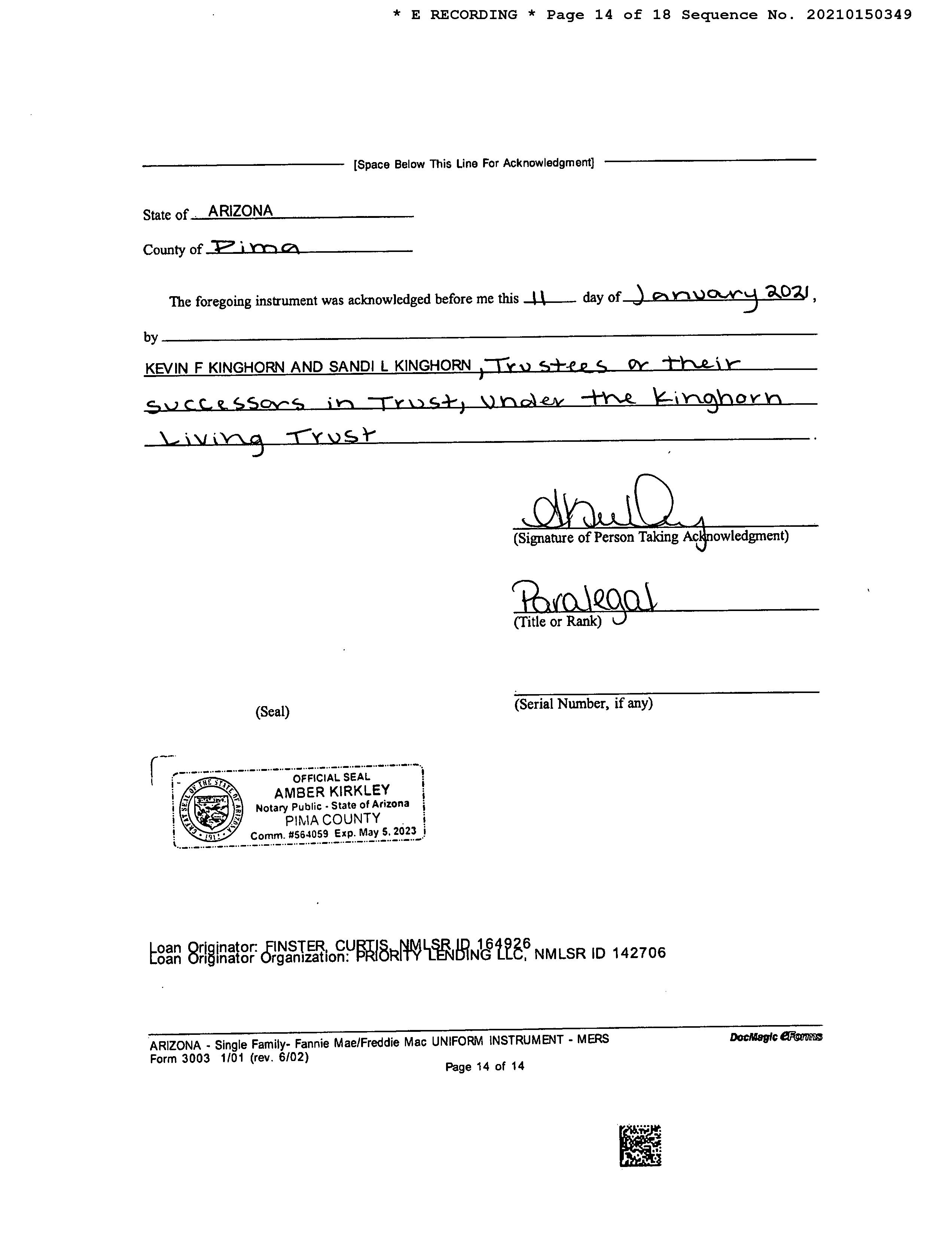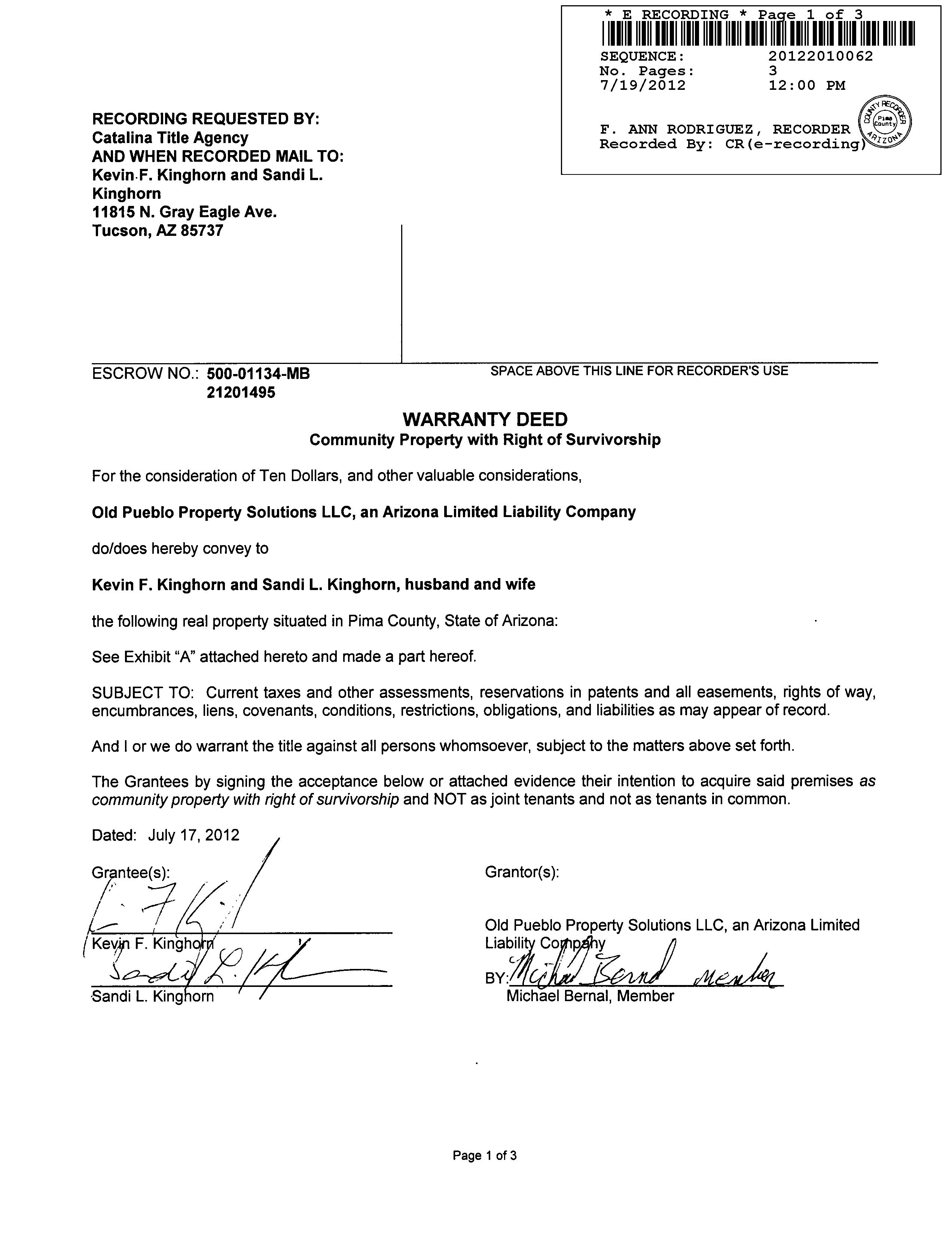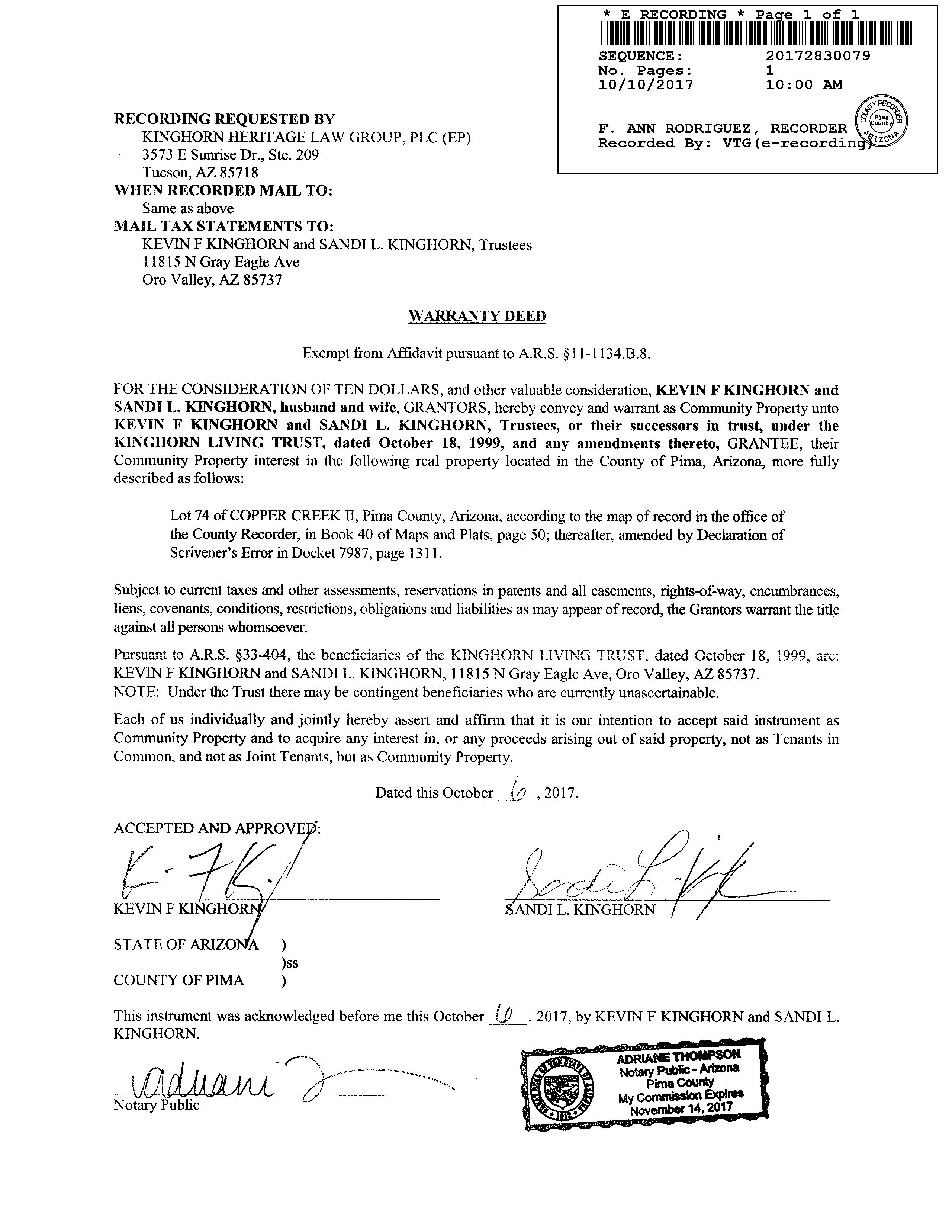 Owner Name : Kinghorn Mailing Address : 11815 N Gray Eagle Ave, Tucson AZ 85737-8660 R056