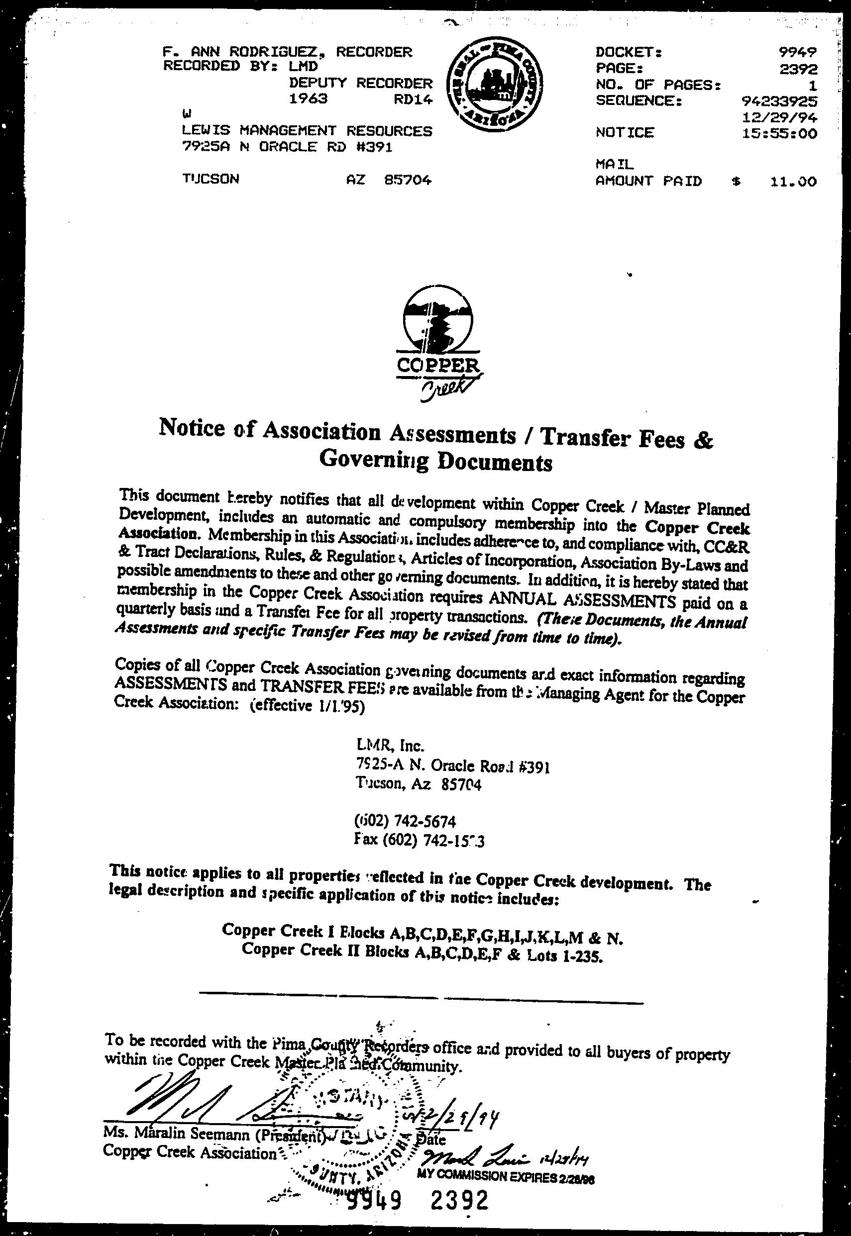 Owner Name: Wilcox John R / APN / Alternate APN: 224-05-1660 / Deed Type: Warranty Deed Land Use: Sfr Subdivision / Tract: Copper Creek 02 / Lot Size: 4,333 Year Built / Eff: 1994 / Rec. Date / Price: 02/07/2022 / $385,000 Living Area: 2,001 # of units: Document #: 380120 Bedrooms: Pool: Total Tax Value: $214,341 Bath(F/H): / #16 1372 W Valley Ridge Pl Oro Valley Az 85737 Owner Name: Javor Eric /Kerry Anne Gleason APN / Alternate APN: 224-04-6540 / Deed Type: Warranty Deed Land Use: Sfr Subdivision / Tract: Copper Creek 02 / Lot Size: 6,083 Year Built / Eff: 1996 / Rec. Date / Price: 10/25/2021 / $400,000 Living Area: 2,082 # of units: Document #: 2980817 Bedrooms: Pool: Pool Total Tax Value: $255,529 Bath(F/H): /