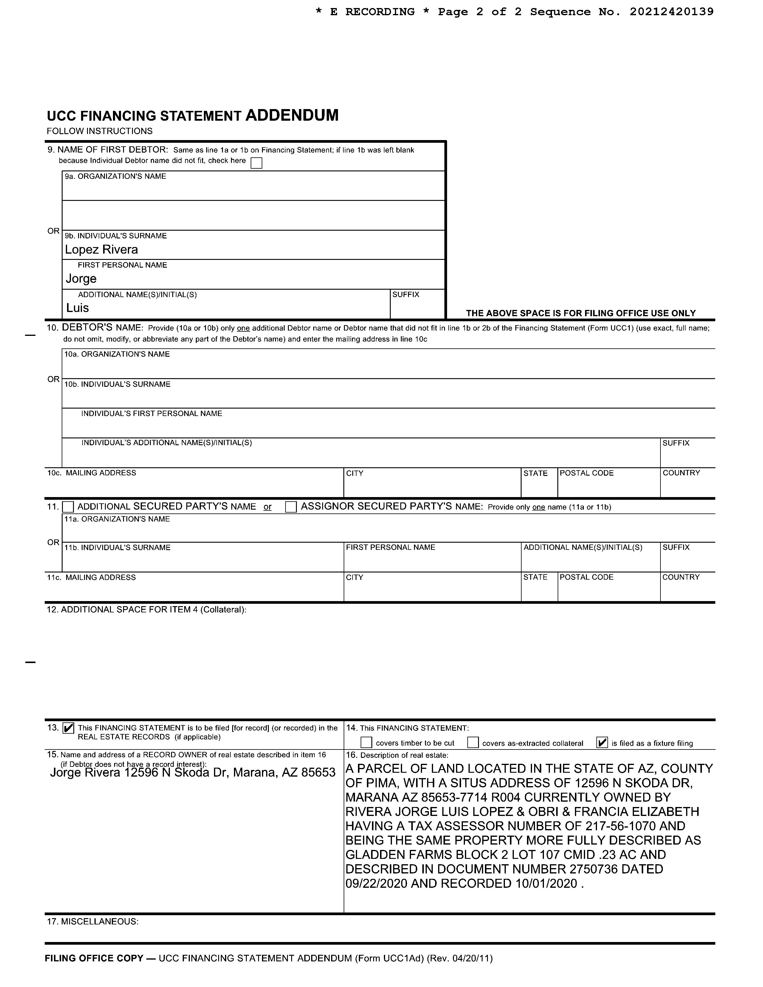 Owner Name: Rivera Jorge Luis Lopez & Obri /Francia Elizabeth APN / Alternate APN: 217-56-1070 / Deed Type: Warranty Deed Land Use: Sfr Subdivision / Tract: Gladden Farms Bl 02 / Lot Size: 10,019 Year Built / Eff: 2008 / Rec. Date / Price: 10/01/2020 / $286,000 Living Area: 1,873 # of units: