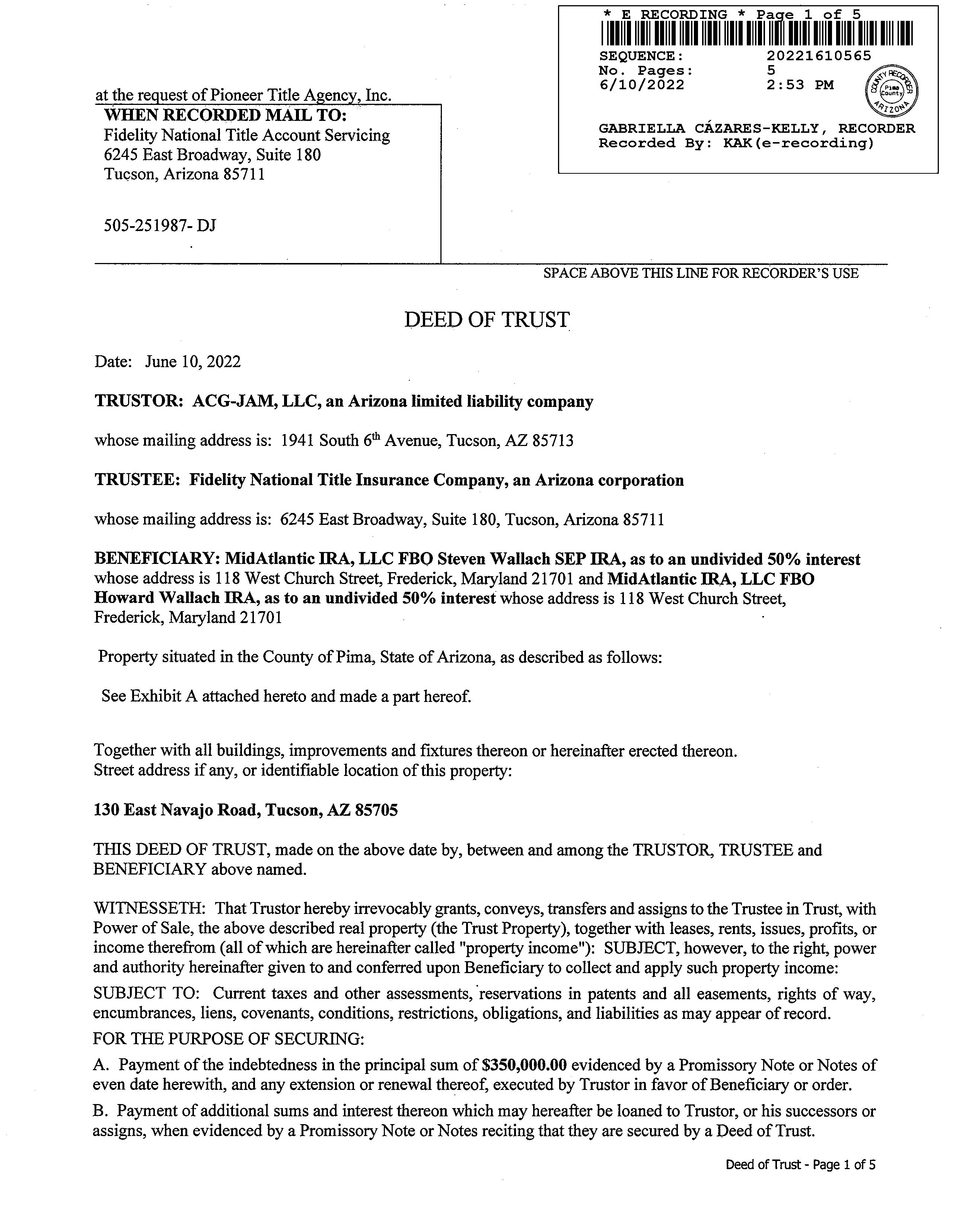 Subject Property : 130 E Navajo Rd Tucson AZ 85705 Owner Information Owner Name : Acg-jam Llc Mailing Address : 2630 N Estrella Ave #3, Tucson AZ 85705-4558 C006 Vesting Codes : / / Corporation Owner OccupiedIndicator : A Location Information Legal Description : Sawtelle Place Lot 9 Blk 4 County : Pima, Az Market Area : 30 Census Tract / Block : 26.04 / 1 APN : 106-03-0630 Township-Range- Sect : 13S-13E-25 Subdivision : Sawtelle Place Legal Book/Page : 4-73 Map Reference : 25-13S-13E Legal Lot : 9 School District : Amphitheater Legal Block : 4 Munic/Township : Amphitheater Last Market Sale Information Recording/Sale Date : 06/10/2022 / 06/10/2022 1st Mtg Amount/Type : $350,000 / Pp Sale Price : $350,000 1st Mtg Document # : 1610565 Document # : 1610564 Price Per SqFt : $139.33 Deed Type : Warranty Deed 2nd Mtg Amount/Type : $40,000 / Private Party Title Company : Pioneer Title Agency Seller Name : Clark Kathleen Prior Sale Information Prior Rec/Sale Date : 09/29/1995 / 09/00/1995 Prior Lender : Great Wstrn Bk Prior Sale Price : $137,500 Prior 1st Mtg Amt/Type : $100,000 / Conv Prior Doc Number : 10139-3333 Prior 1st Mtg Rate/Type : / Adjustable Int Rate Loan Prior Deed Type : Warranty Deed Customer Name : Lisa Mrazek Customer Company Name : First American Title Insurance Company Prepared On : 08/31/2022 © 2022 CoreLogic. All rights reserved
