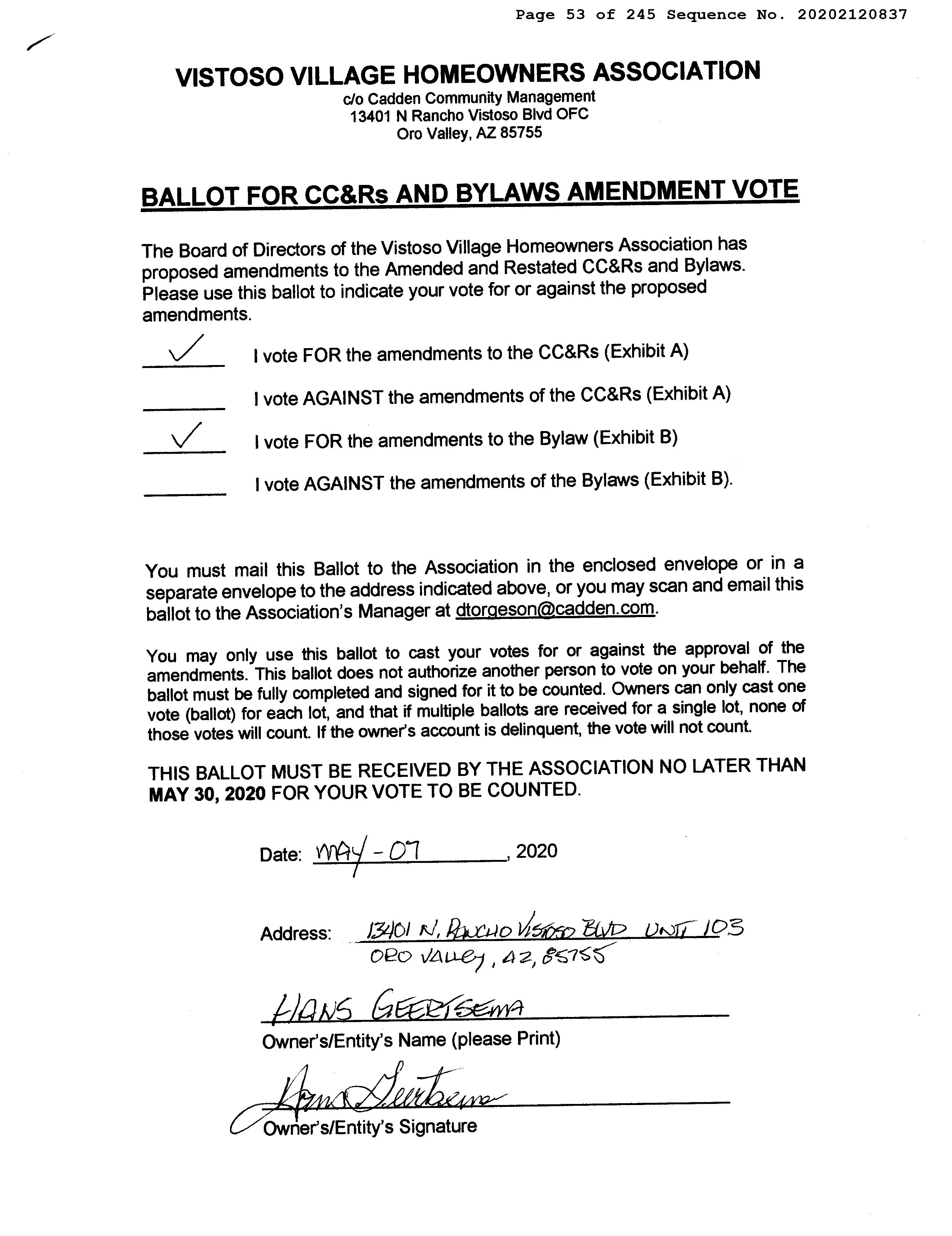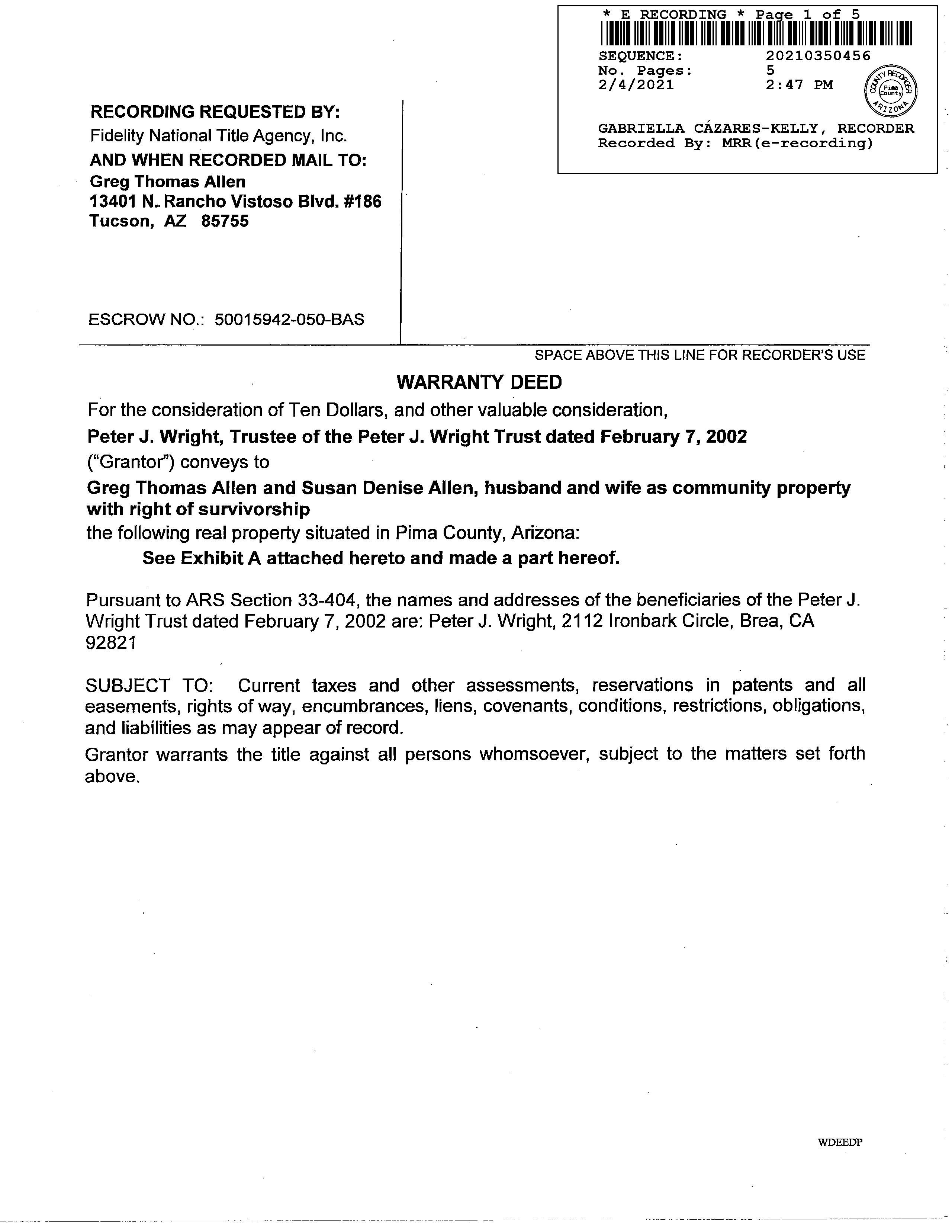 Owner Name: Allen Greg Thomas /Allen Susan Denise APN / Alternate APN: 219-54-2330 / Deed Type: Warranty Deed Land Use: Condominium Subdivision / Tract: Vistoso Village / Lot Size: 3,034 Year Built / Eff: 2002 / Rec. Date / Price: 02/04/2021 / $245,500 Living Area: 1,282 # of units: