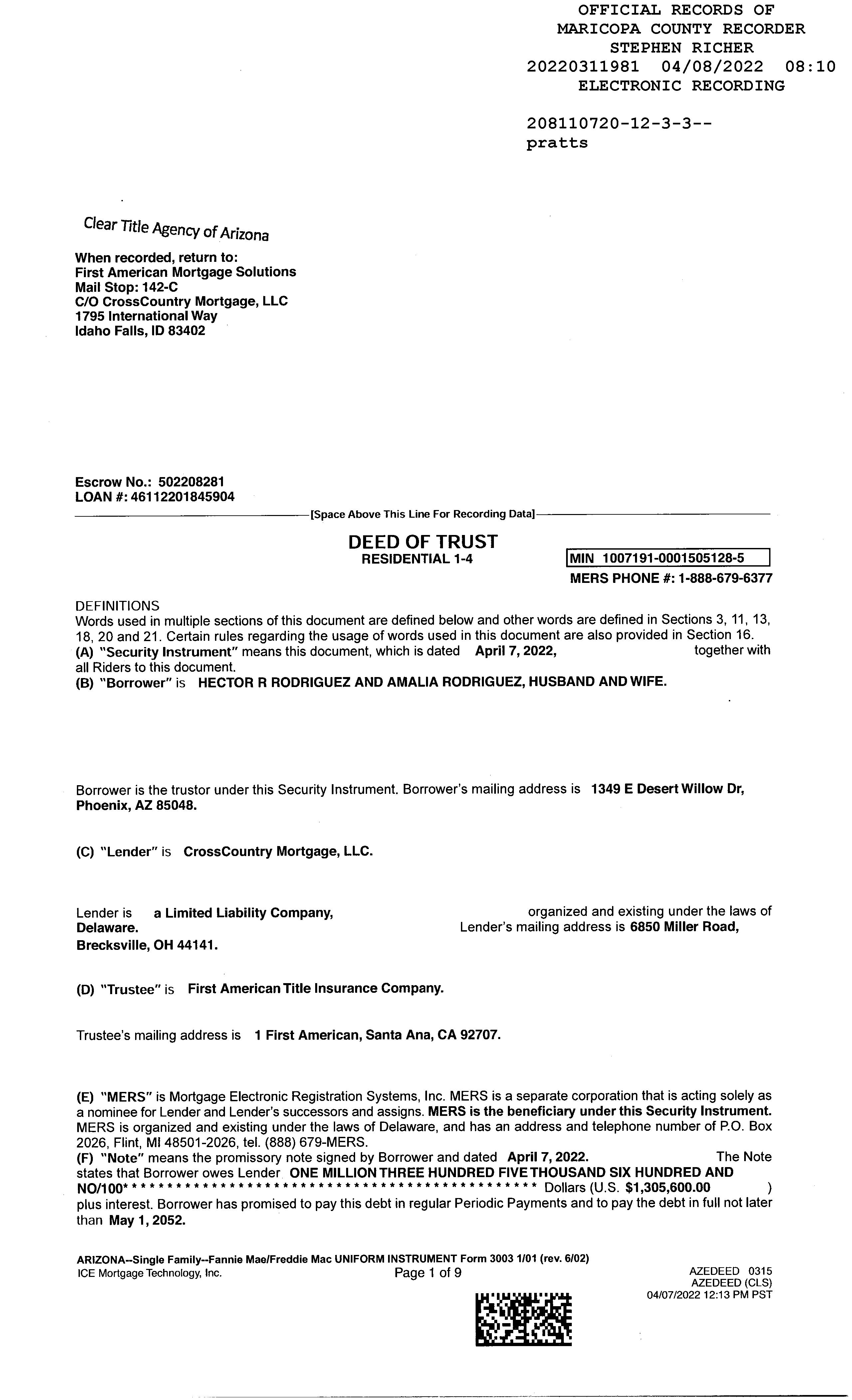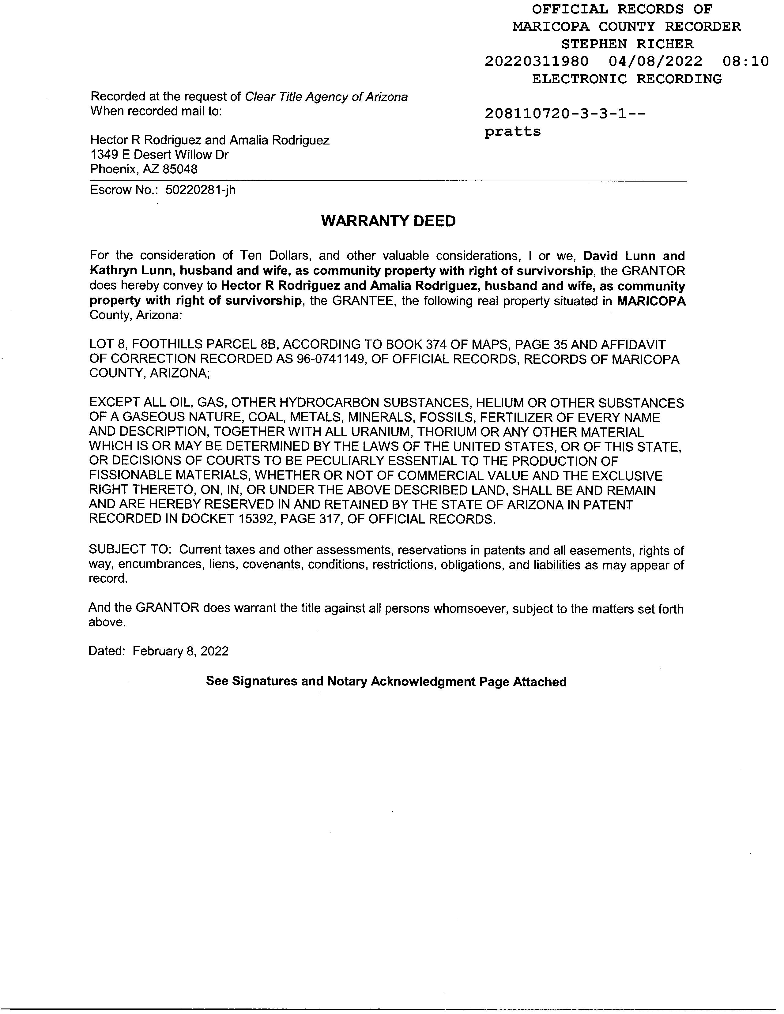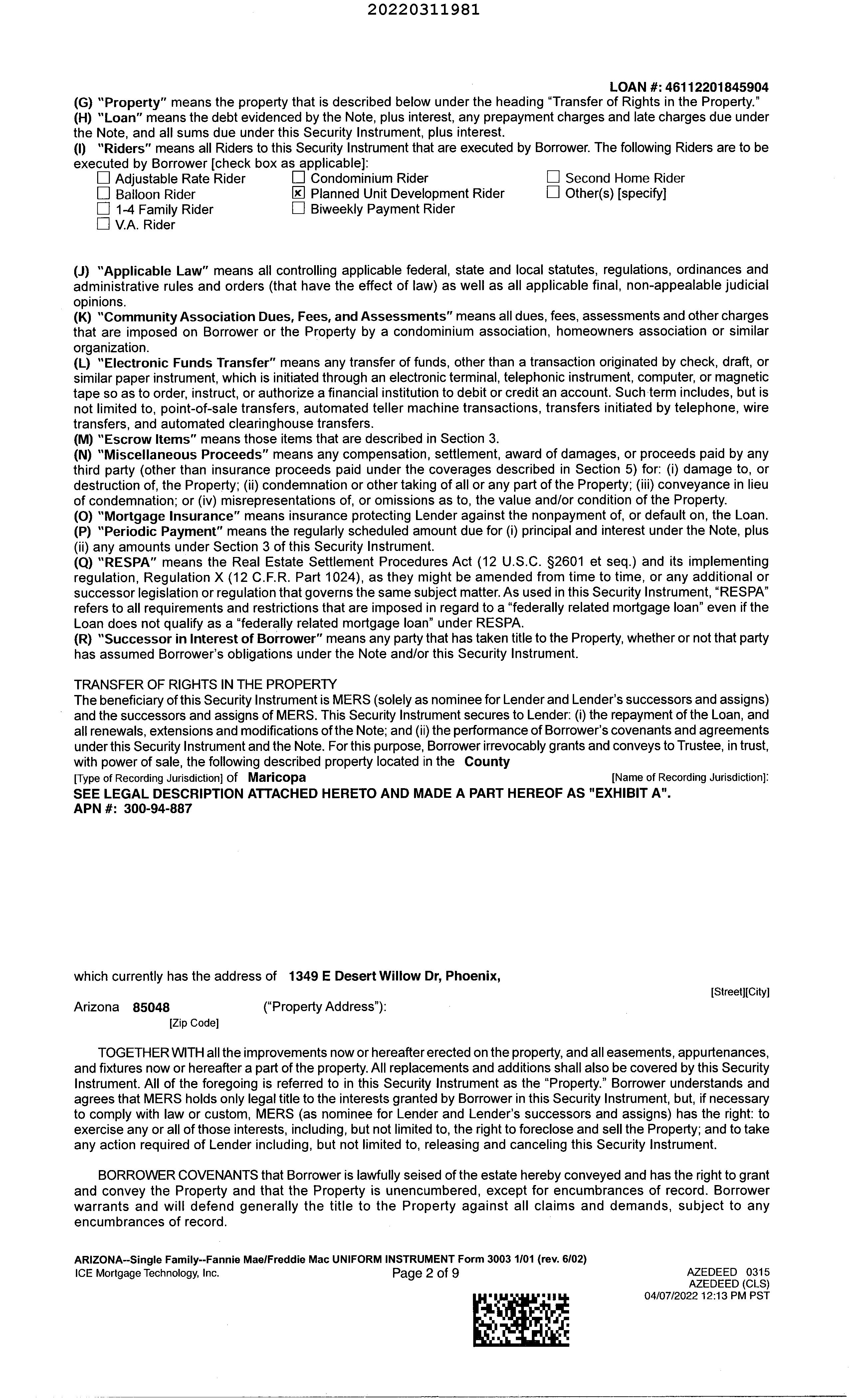 OWNER: RODRIGUEZ HECTOR & AMALIA 2022 311980 04/08/2022 SITUS: 1349 E DESERT WILLOW DR PHOENIX