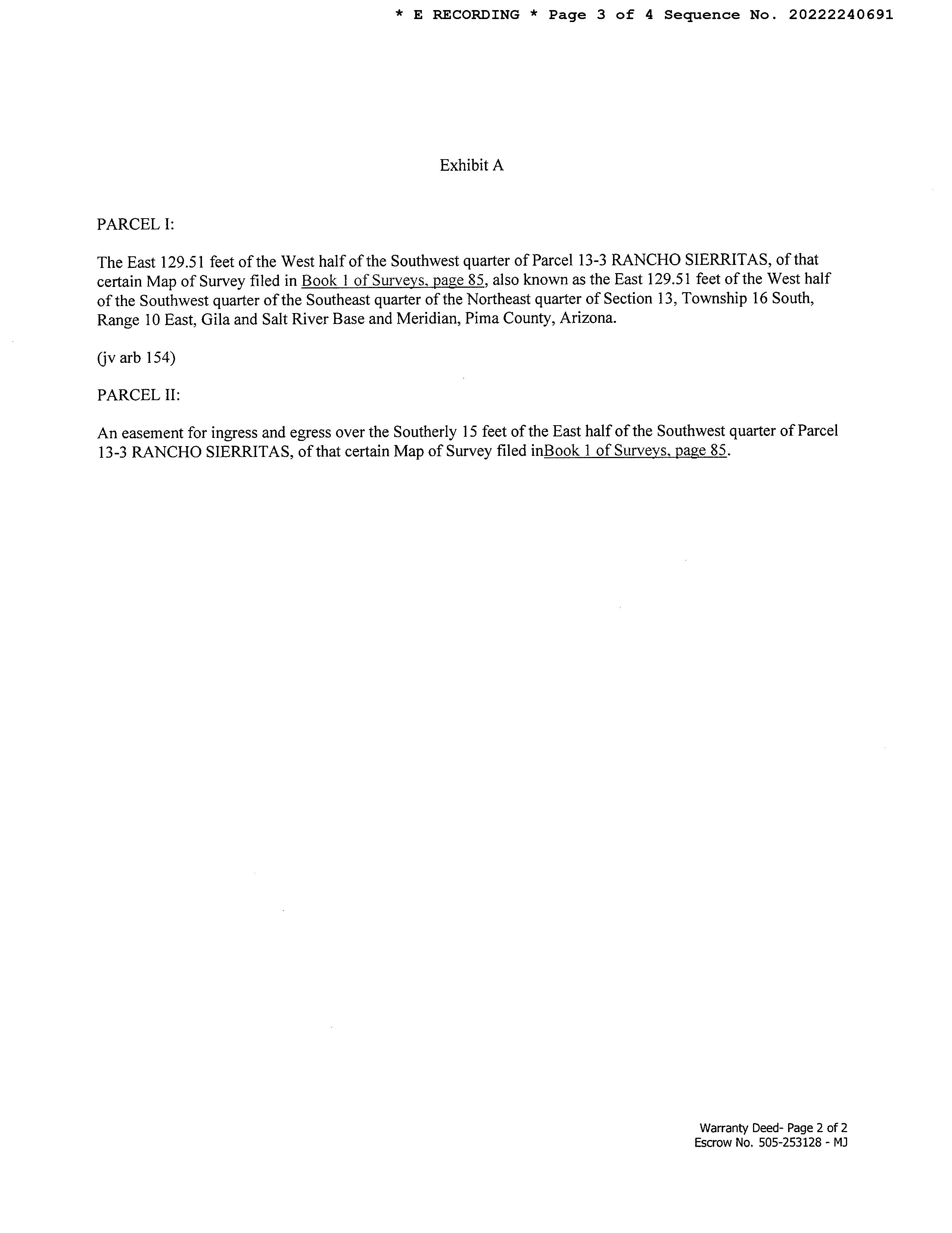 PARCEL: 301-74-0250 PARCEL: 301-74-0250 INSTRUMENT REC DATE OWNER: DOHERTY JOSEPH D AFFIDAVIT 2011 2580353 09/15/2011 SITUS: 14360 W RAINDANCE RD PC MAIL: 4710 E ANDREWS ST TUCSON, AZ 85711-6427 LEGAL: E129.51' W2 SW4 PCL 13-3 RANCHO SIERRITAS RS 1/85 AKA E129.51' W2 SW4 SE4 NE4 1.96 AC SEC 13-16-10 CURRENT TAXES INFORMATION THROUGH 10/21/2022 LAND IMPR EXEMPT RATE AREA SPECIAL DISTRICTS PRIMARY 5,007 0 0 9.4467 5101 SECONDARY 1,800 3,207 0 5.5736 2022 TOTAL TAX BILLED 666.35 2022 TAX AMT TAX DUE INTEREST DATE PAID TOTAL DUE FIRST HALF 333.18 333.18 4.44 337.62 SECOND HALF 333.17 333.17 0.00 333.17 TOTAL CURRENT TAXES DUE 11/22 670.79 12/22 675.23 (ESTIMATED)