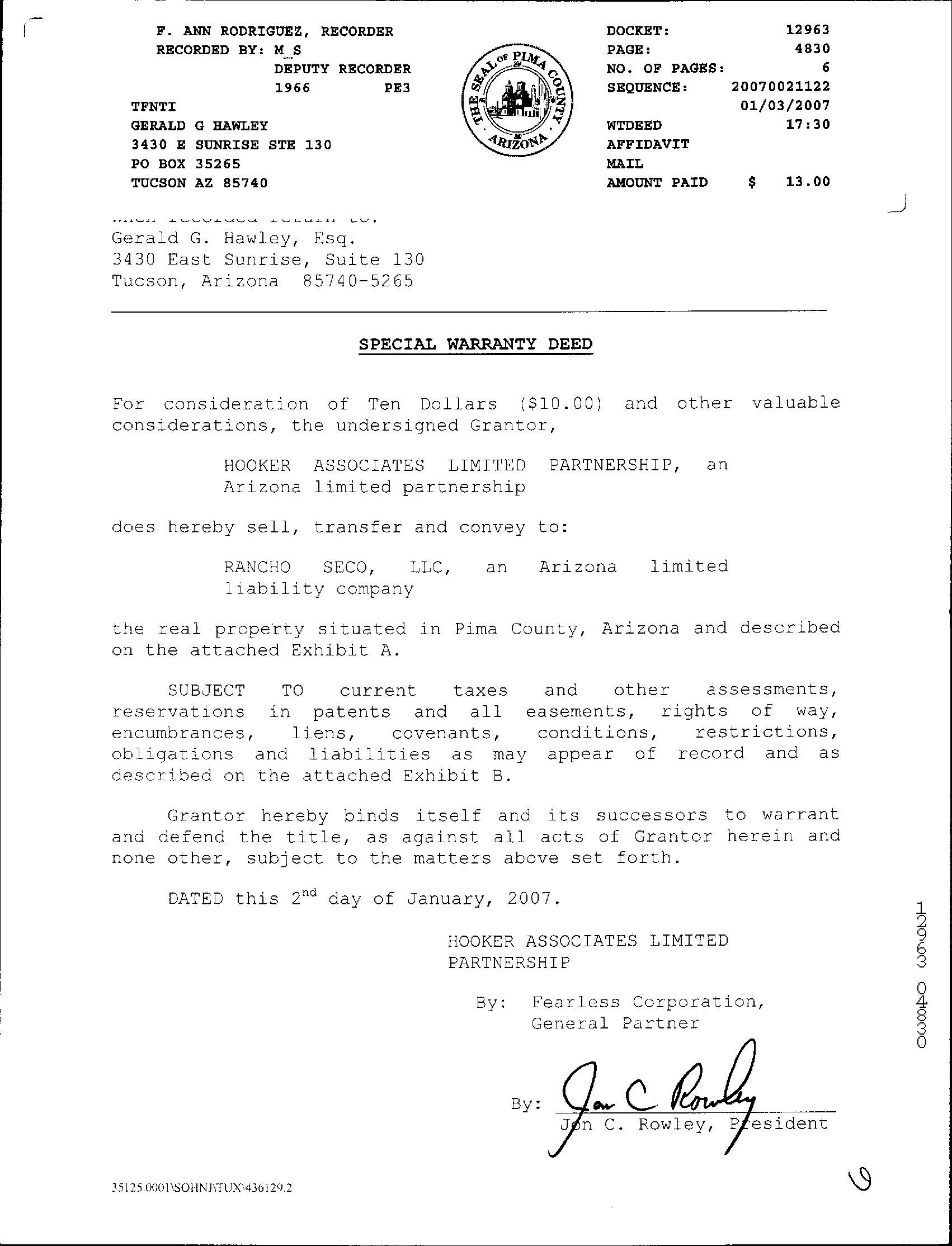 Subject Property : 15110 W Arivaca Rd Amado AZ 85645 Owner Information Owner Name : Rancho Seco Llc Mailing Address : Hc 65 Box 6335, Amado AZ 85645-9614 H065 Vesting Codes : / / Corporation Location Information Legal Description : 1484.44'x1320.13' Ptn In Sw4 Exc Ptn Minerals 44.60 Ac Sec 14-20-10 County : Pima, Az APN : 302-08-003K Census Tract / Block : 43.16 Map Reference : 14-20S-10E Township-Range- Sect : 20S-10E-14 School District : Sahuarita Market Area : 330 Munic/Township : Sahuarita Last Market Sale Information Recording/Sale Date : 01/03/2007 / 01/02/2007 Deed Type : Special Warranty Deed Sale Price : $1,004,000 Price Per SqFt : $114.68 Document # : 12963-4830 Title Company : Fidelity National Title Co Seller Name : Hooker Associates Property Characteristics Gross Area : 8,755 # of Stories : 1 Cooling Type : Forced Air Living Area : 8,755 Roof Type : L Exterior wall : Block Fireplace : / 2 Foundation : Concrete Air Cond : Package Year Built / Eff : 1971 / 1971 Heat Type : Forced Air Property Information Land Use : Ranch Zoning : RH Lot Size : 1,942,776 County Use : Ranch Property Lot Acres : 44.60 State Use : Ranch Property Customer Name : Jeremiah Stiffler Customer Company Name : First American Prepared On : 08/11/2022 © 2022 CoreLogic. All rights reserved