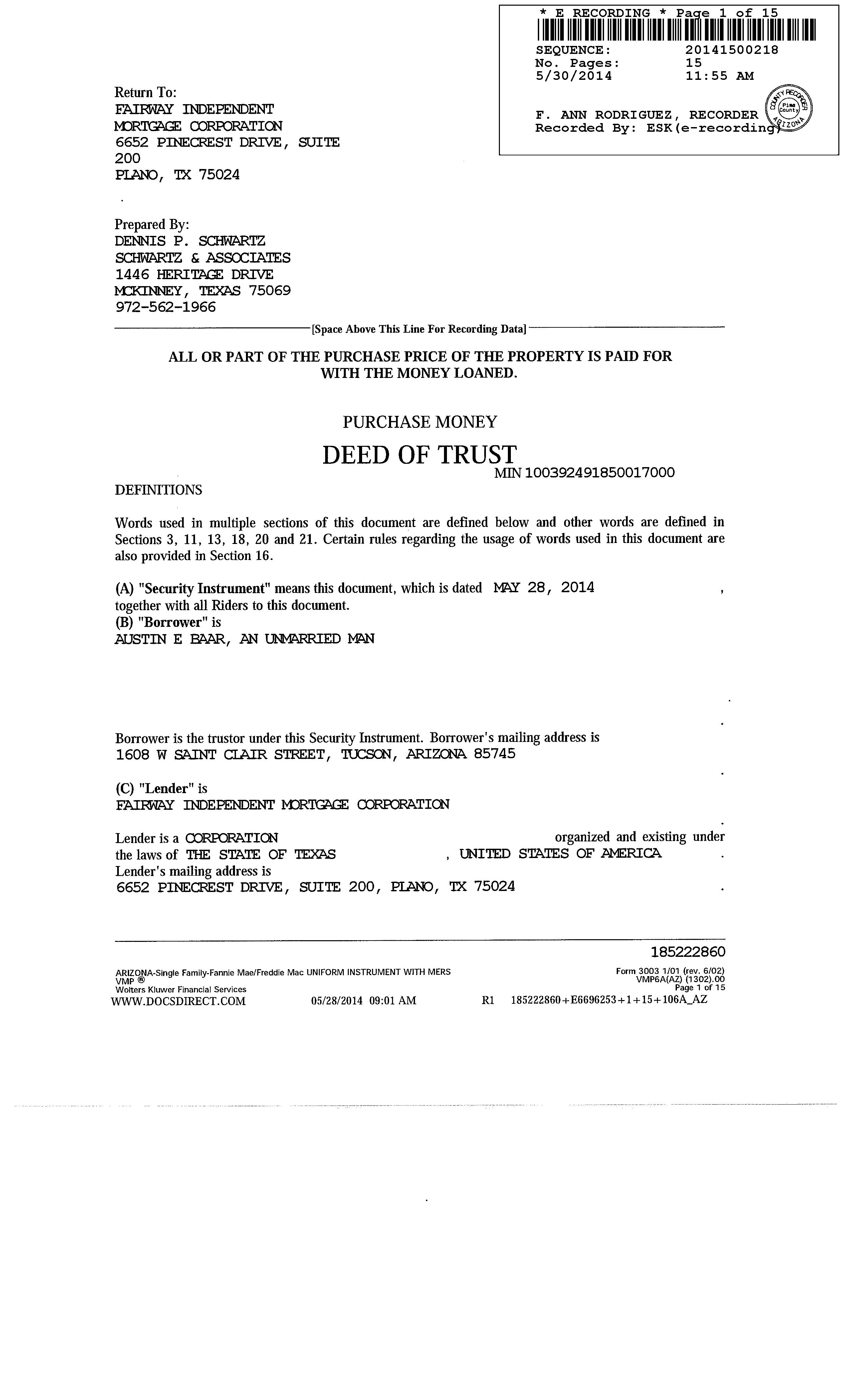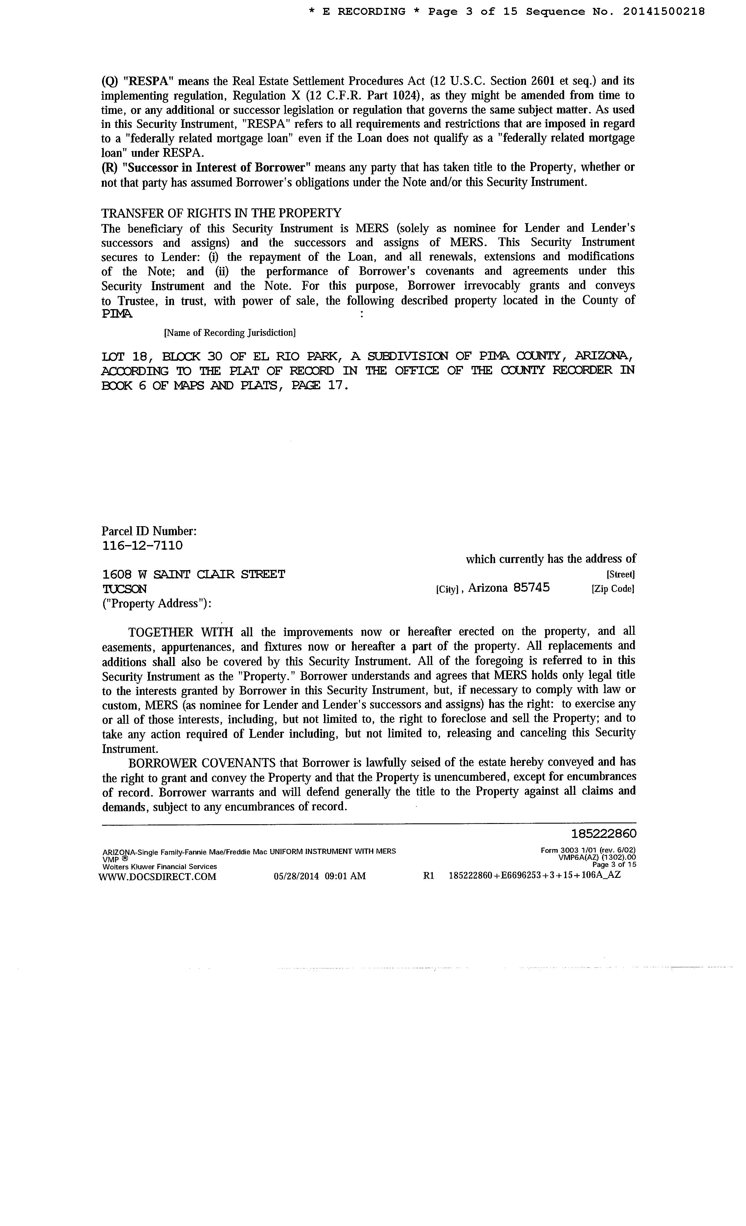 Subject Property : 1608 W Saint Clair St Tucson AZ 85745 Owner Information Owner Name : Baar Austin E Mailing Address : 1608 W Saint Clair St, Tucson AZ 85745-2332 C030 Owner OccupiedIndicator : O Location Information Legal Description : El Rio Park Lot 18 Blk 30 County : Pima, Az Market Area : 21 Census Tract / Block : 11.00 / 2 APN : 116-12-7110 Township-Range- Sect : 14S-13E-10 Subdivision : El Rio Park Legal Book/Page : 6-17 Map Reference : 10-14S-13E Legal Lot : 18 School District : Tucson Unified Legal Block : 30 Munic/Township : Tucson Unified Last Market Sale Information Recording/Sale Date : 05/30/2014 / 05/28/2014 1st Mtg Amount/Type : $112,500 / Cnv Sale Price : $125,000 1st Mtg Document # : 1500218 Document # : 1500217 1st Mtg Term : 30 Deed Type : Warranty Deed Price Per SqFt : $86.21 Title Company : Stewart Title & Tr/tucson Lender : Fairway Independent Mtg Corp Seller Name : Capital Source Financial Prior Sale Information Prior Rec/Sale Date : 06/30/1986 / 06/00/1986 Prior Doc Number : 7816-1966 Prior Sale Price : $30,000 Prior Deed Type : Joint Tenancy Deed Property Characteristics Gross Area : 1,450 Parking Type : None Patio Type : Covered Patio Living Area : 1,450 Roof Material : Roll Composition Air Cond : Refrigeration Total Rooms : 8 Heat Type : Forced Air Quality : Fair Year Built / Eff : 1976 Cooling Type : Forced Air Condition : Average # of Stories : 1 Exterior wall : Stucco Bath Fixtures : 6 Customer Name : Lisa Mrazek Customer Company Name : First American Title Insurance Company Prepared On : 08/30/2022 © 2022 CoreLogic. All rights reserved