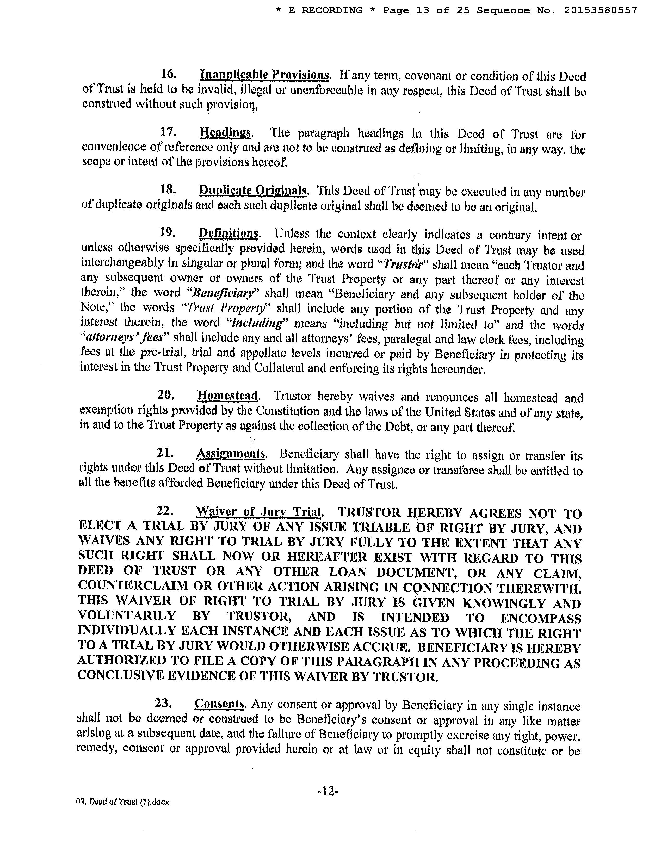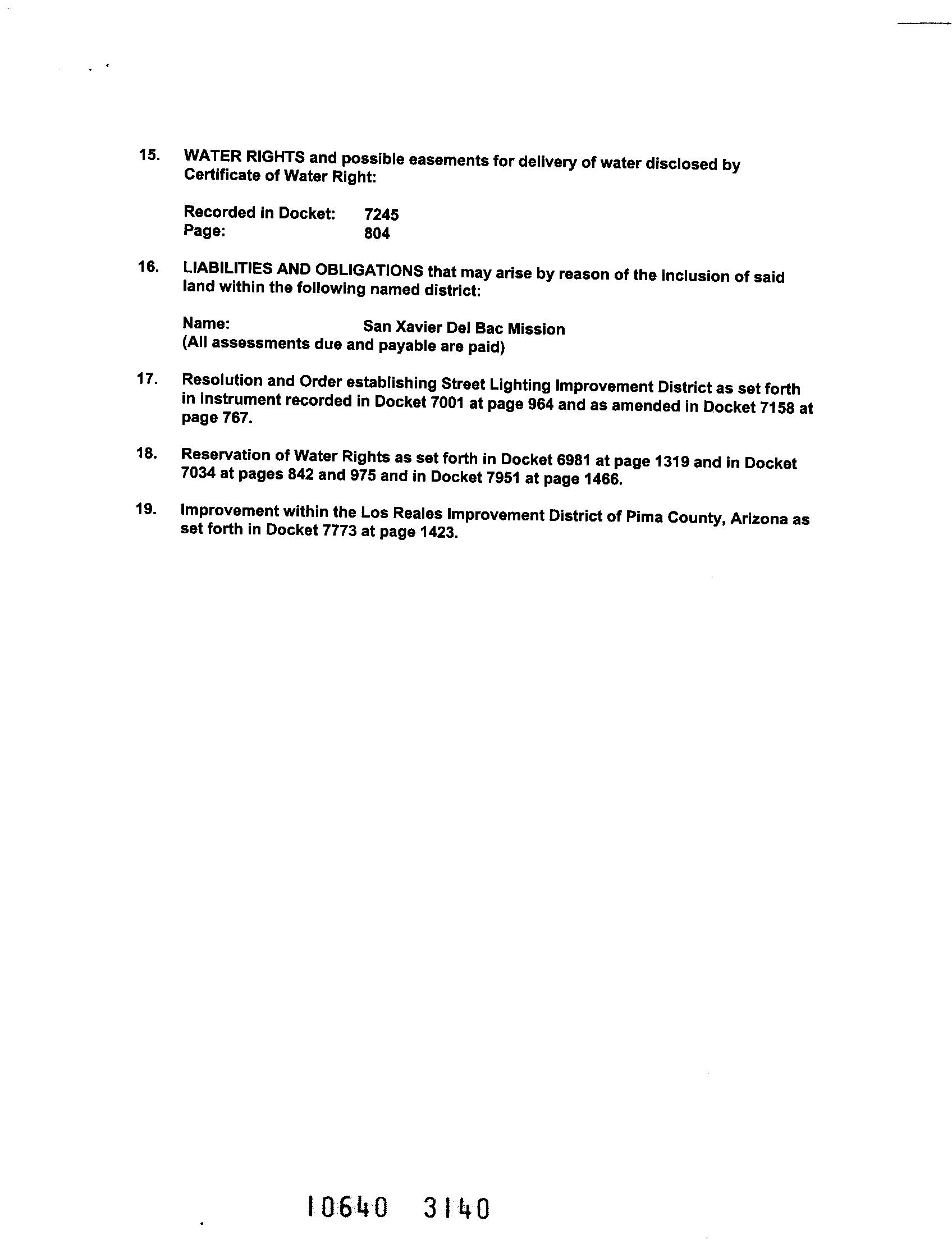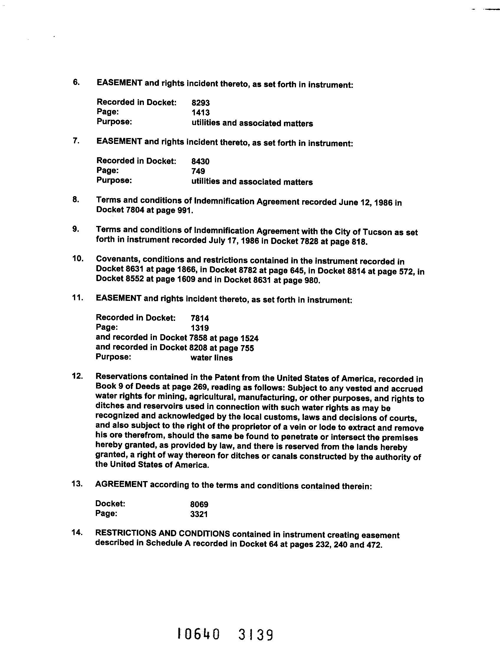 Defective recording of any document 5 There are restrictive covenants 6 There is a lien on your title because there is: a) a deed of trust b) a judgement, tax, or special assessment c) a charge by a homeowner’s association 7 Title is unmarketable 8 Mechanics lien 9 Forced removal of a structure because it: a) extends on another property and/or easement b) violates a restriction in Schedule B c) violates an existing zoning law* 10 Cannot use the land for a Single-Family Residence because the use violates a restriction in Schedule B or a zoning ordinance