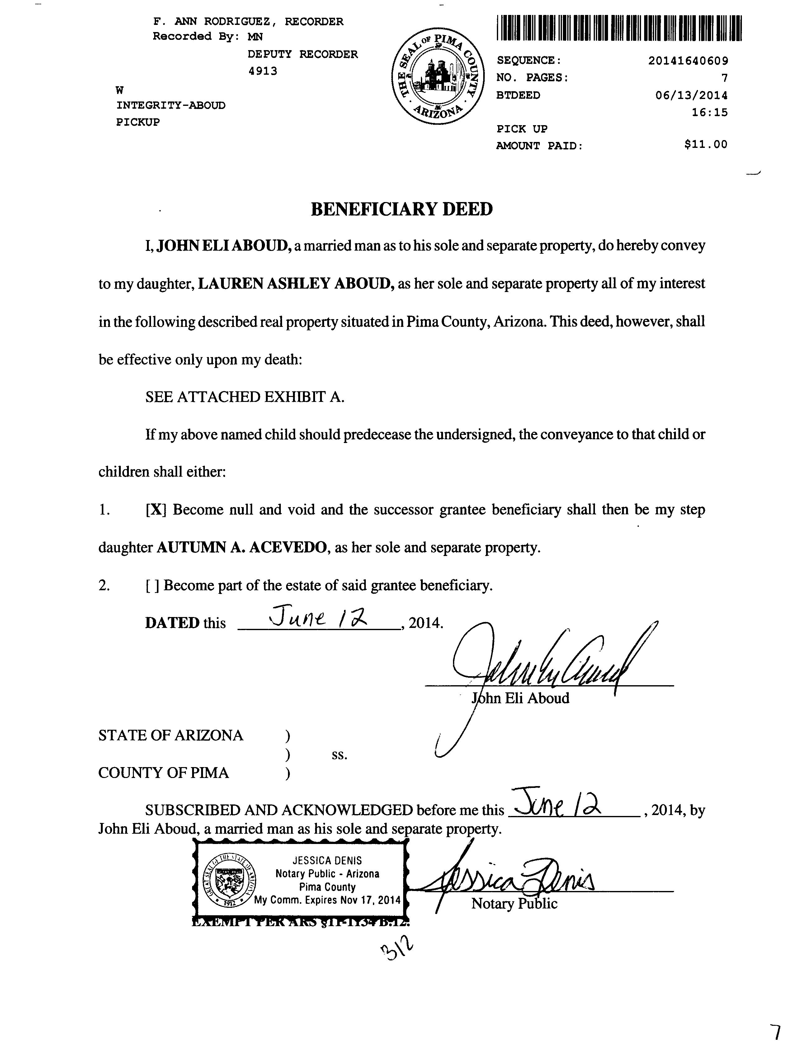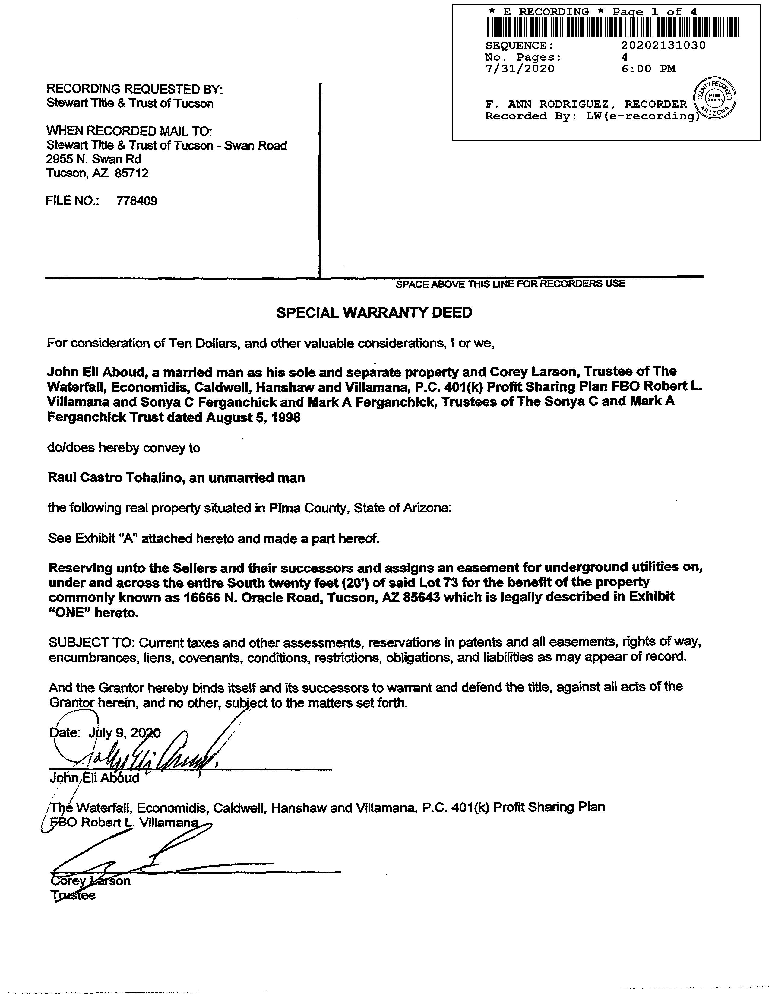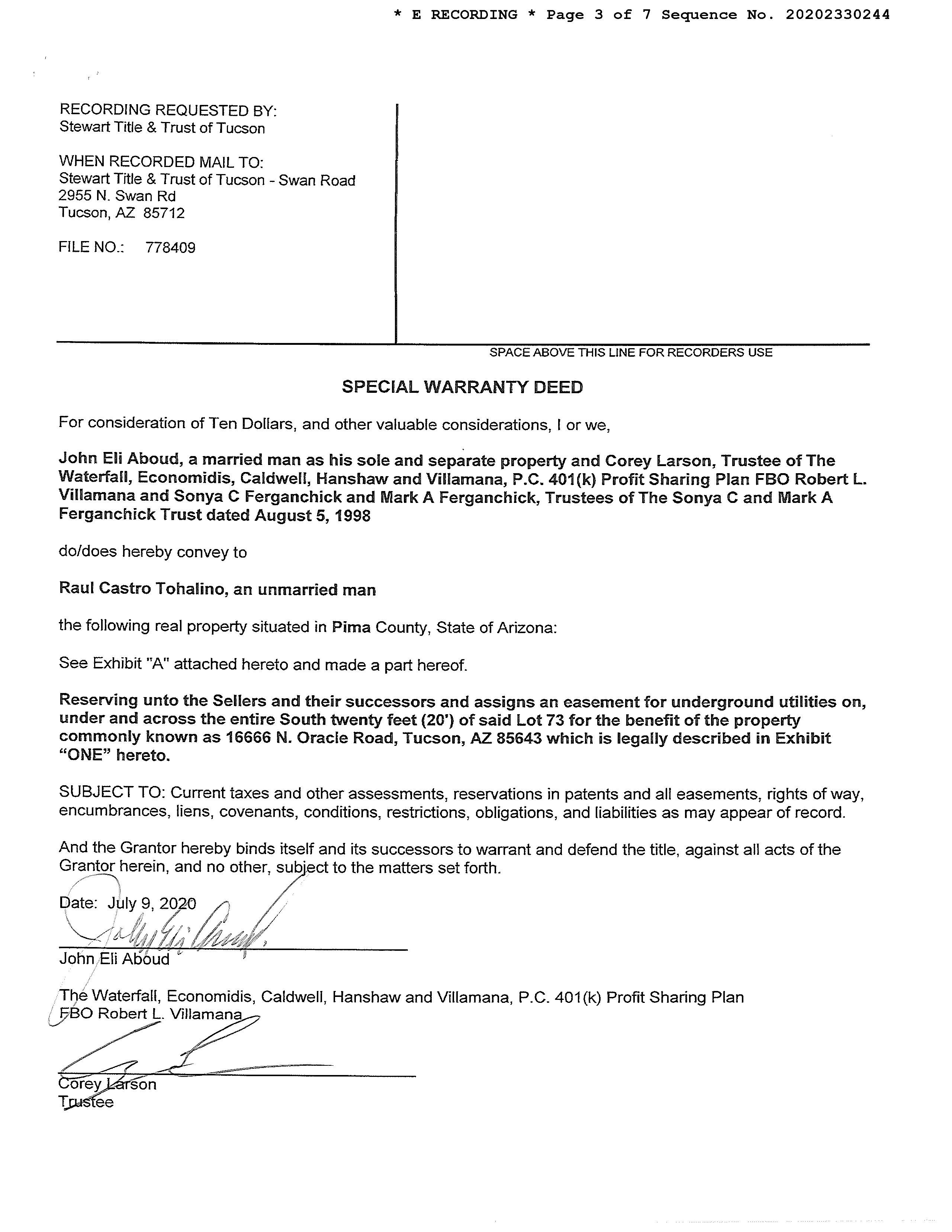 PARCEL: 222-16-0870 PARCEL: 222-16-0870 INSTRUMENT REC DATE OWNER: ABOUD JOHN E / AFFIDAVIT 2011 1010372 04/11/2011 SITUS: 16685 N AVENIDA DEL ORO PC MAIL: 1661 N SWAN RD STE 234 TUCSON, AZ 85712 PLAT: LOT 00074 BLOCK 0 LEGAL: LARIAT ESTATES LOT 74 CURRENT TAXES INFORMATION THROUGH 10/21/2022 LAND IMPR EXEMPT RATE AREA SPECIAL DISTRICTS PRIMARY 8,817 0 0 8.9703 1006 SECONDARY 8,453 365 0 5.3438 2022 TOTAL TAX BILLED 1,262.05 2022 TAX AMT TAX DUE INTEREST DATE PAID TOTAL DUE