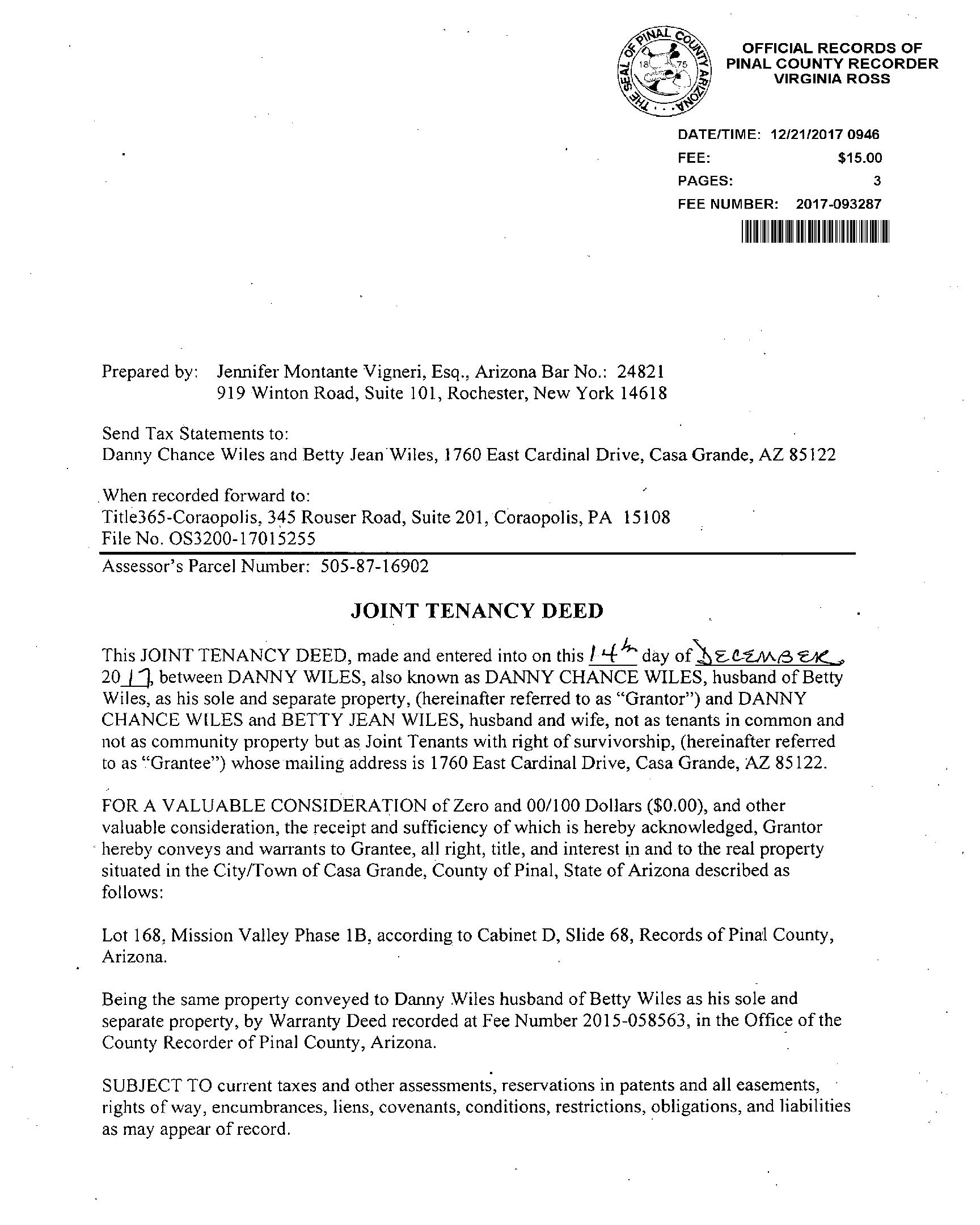 Deed Type : Joint Tenancy Deed Document # : 93287 1st Mtg Document # : 93288