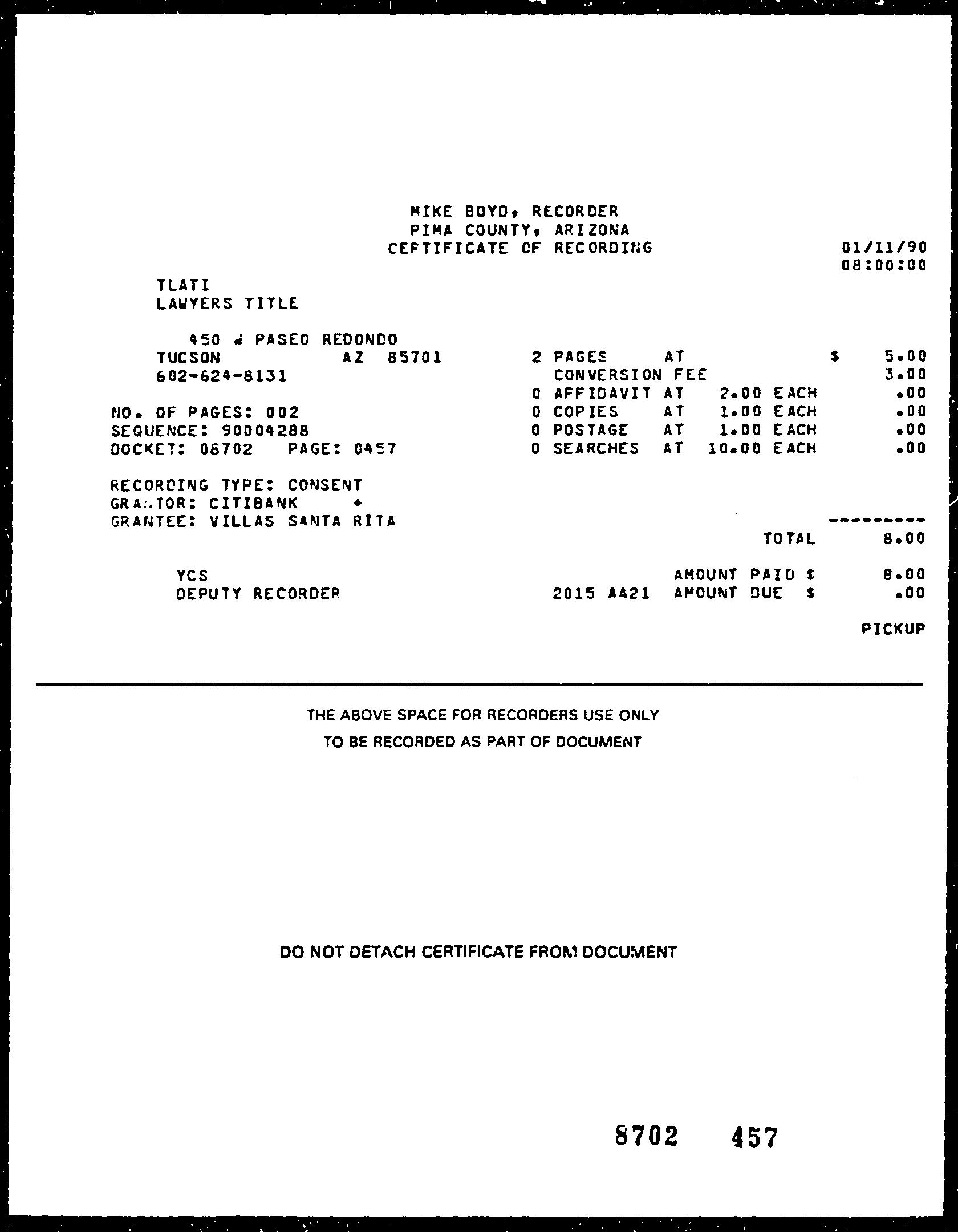 ConditionsCovenants,&Restrictions Thank you for the opportunity to be of service. Restrictions indicating a preference, limitation or discrimination based on race, color, religion, sex, handicap, familial status, or national origin are hereby deleted to the extent such restrictions violate 42 USC 3604(c). This information is furnished without fee and without benefit of a complete title search. No liability is assumed by First American Title or Title Security. If it is desired that liability be assumed, you may apply for a policy of title insurance with First American Title Insurance Company.