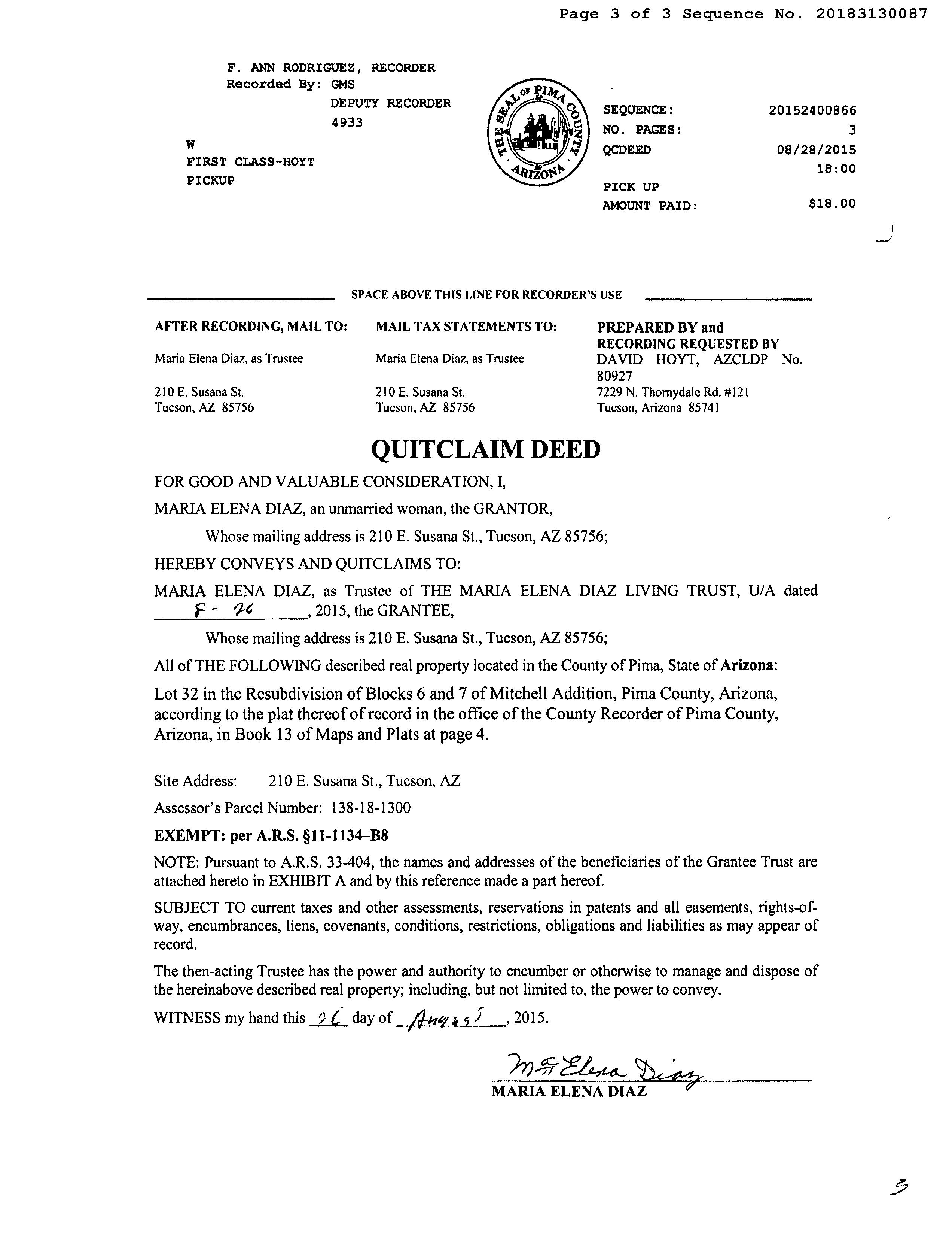Owner Name : Diaz Jose Luis Mailing Address : 210 E Susana St, Tucson AZ 85756-7539 C005