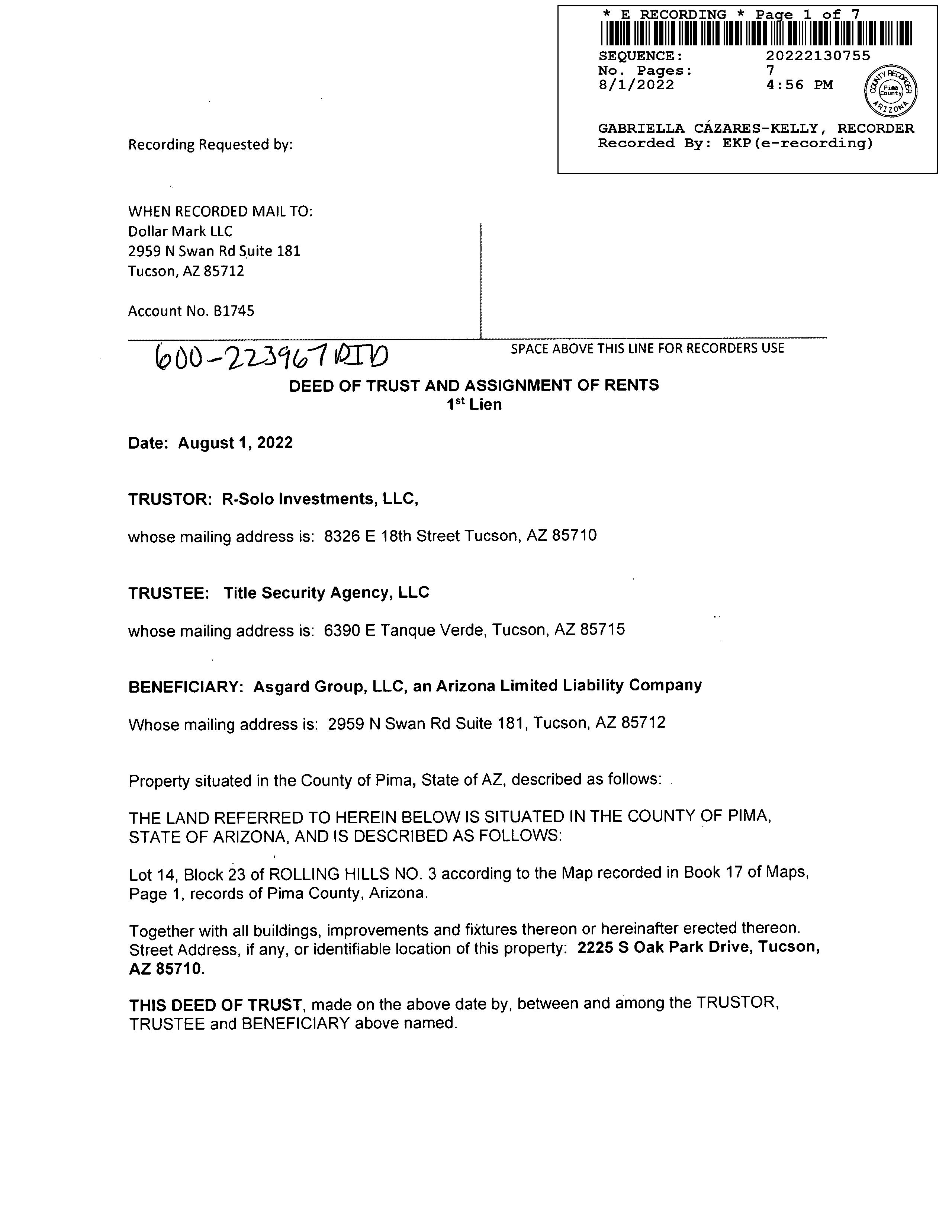 Owner Name: R-solo Investments Llc / APN / Alternate APN: 136-05-2020 / Deed Type: Special Warranty Deed Land Use: Sfr Subdivision / Tract: Rolling Hills 03 / Lot Size: 7,138 Year Built / Eff: 1963 / Rec. Date / Price: 08/01/2022 / $260,000 Living Area: 1,912 # of units: