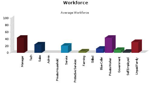 Manager/Prof: 43.58% Private Worker: 43.36% Technical: Government Worker: 7.96% Sales: 23.89% Self Employed Worker: 3.32% Administrative: Unpaid Family Worker: 31.19%