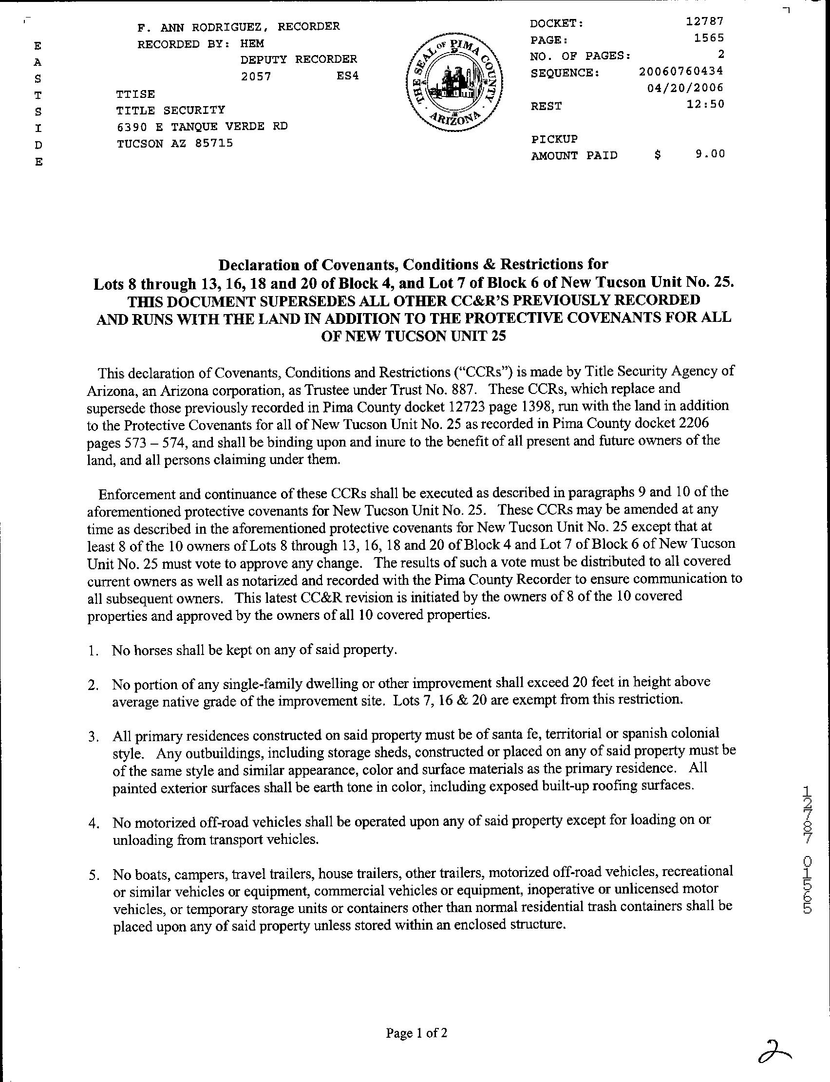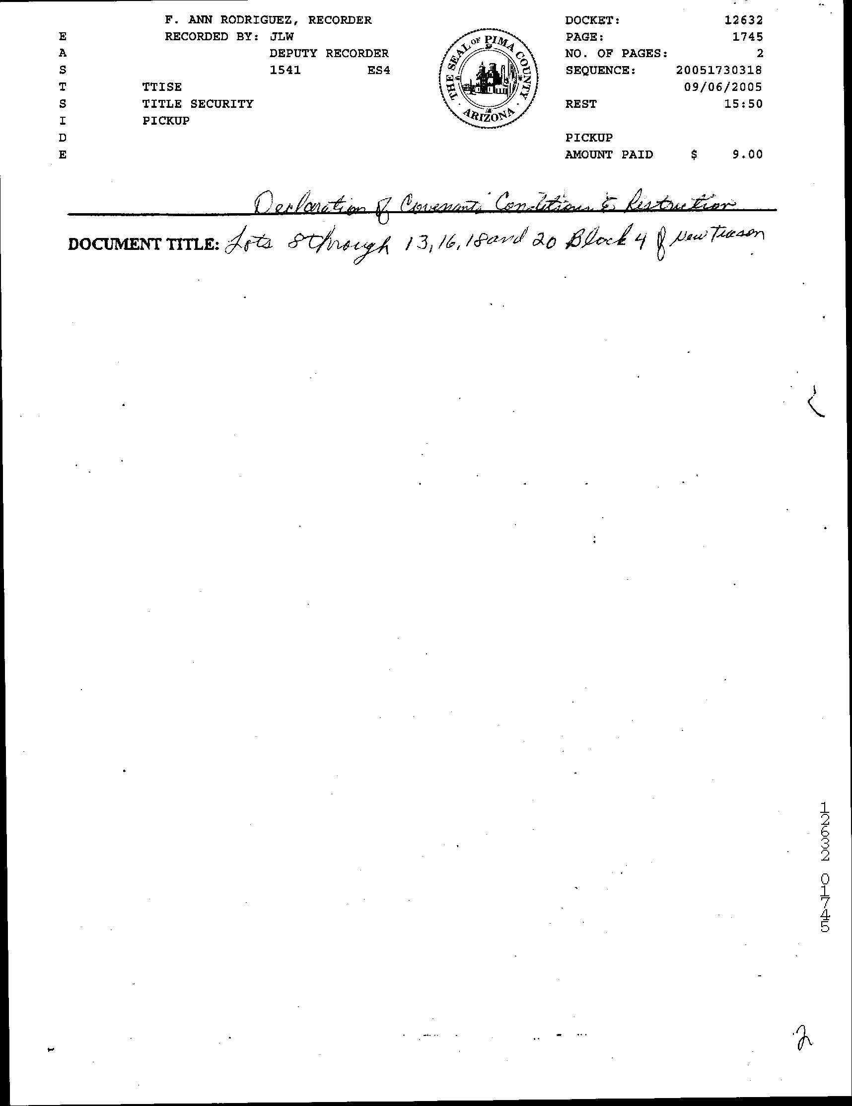CONDITIONS & RESTRICTIONS PREPARED FOR : First American Title Insurance Company, and the operating divisions thereof, make no express or implied warranty respecting the information presented and assume no responsibility for errors or omissions. First American, the eagle logo, First American Title, and firstam.com are registered trademarks or trademarks of First American Financial Corporation and/or its affiliates. 2701 East Lomas Drive Vail, AZ 85641