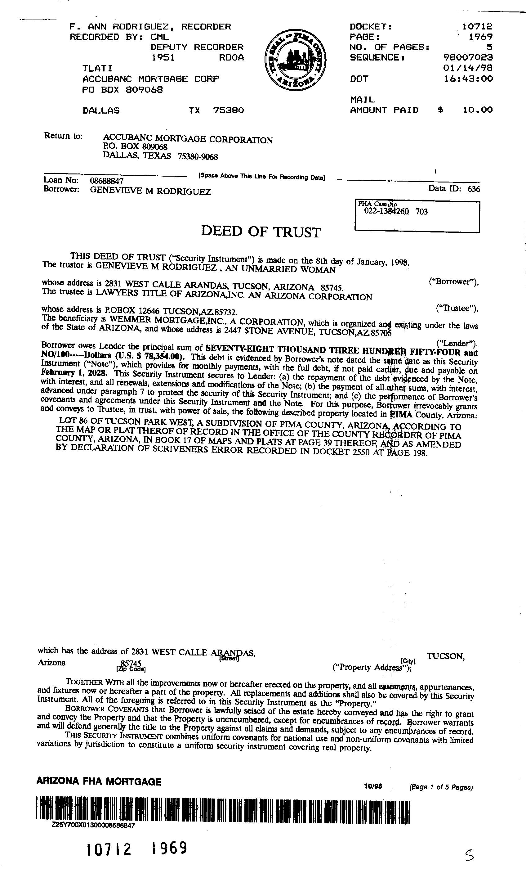 Owner Name : Rodriguez Genevieve M Mailing Address : 2831 W Calle Arandas, Tucson AZ 85745-2532 C023
