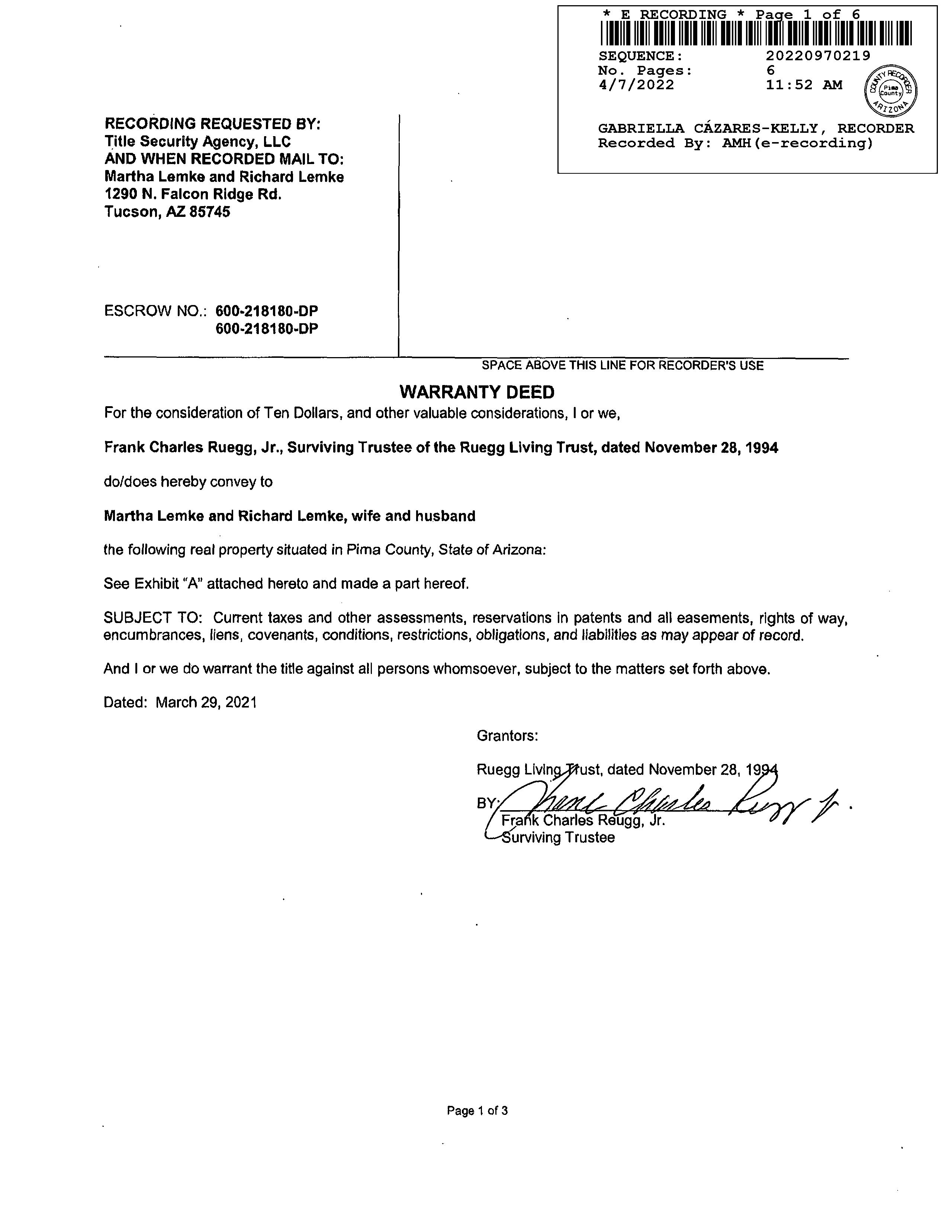 Subject Property : 2982 S Pitchfork Ct Tucson AZ 85713 Owner Information Owner Name : Lemke Martha / Lemke Richard Mailing Address : 2982 S Pitchfork Ct, Tucson AZ 85713-6365 C006 Vesting Codes : Husband/wife / / Community Property Owner OccupiedIndicator : O Location Information Legal Description : Starr Ridge Lot 96 County : Pima, Az APN : 212-22-7330 Census Tract / Block : 44.04 / 1 Subdivision : Starr Rdg Township-Range- Sect : 14S-12E-25 Map Reference : 25-14S-12E Legal Book/Page : 58-50 School District : Tucson Unified Legal Lot : 96 Munic/Township : Tucson Unified Market Area : 21 Last Market Sale Information Recording/Sale Date : 04/07/2022 / 03/29/2021 Deed Type : Warranty Deed Sale Price : $595,000 Price Per SqFt : $323.02 Document # : 970219 Title Company : Title Sec Agcy Llc Seller Name : Ruegg Living Trust Prior Sale Information Prior Rec/Sale Date : 04/12/2012 / 04/12/2012 Prior Doc Number : 1030816 Prior Sale Price : $315,000 Prior Deed Type : Warranty Deed Property Characteristics Gross Area : 1,842 Capacity :Garage 2 Patio Type : Covered Patio Living Area : 1,842 Roof Material : Built-up Air Cond : Refrigeration Total Rooms : 6 Heat Type : Forced Air Quality : Fair Year Built / Eff : 2010 Cooling Type : Forced Air Condition : Excellent # of Stories : 1 Exterior wall : Frame Wood Bath Fixtures : 7 Parking Type : Garage Customer Name : Lisa Mrazek Customer Company Name : First American Title Insurance Company Prepared On : 08/26/2022 © 2022 CoreLogic. All rights reserved