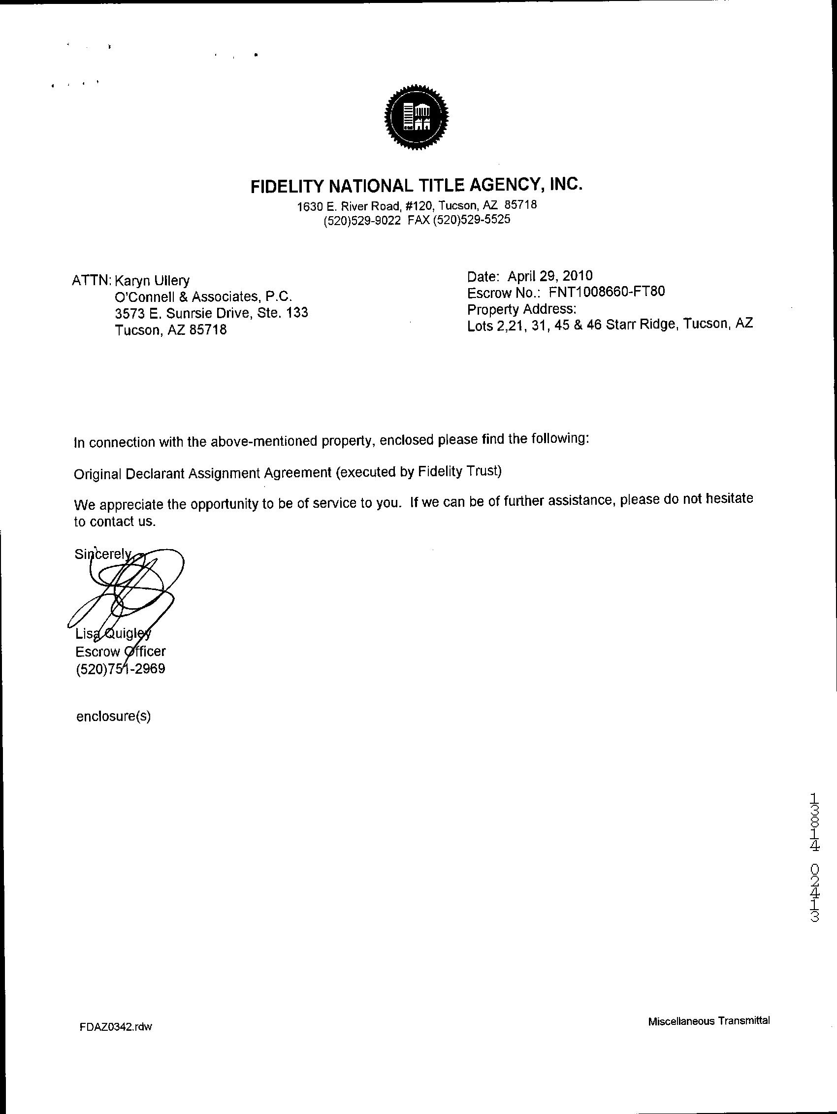 1 MAIN OFFICE 520.885.1600 | Fax 520.885.2309 6390 E. Tanque Verde Rd. Tucson, AZ 85715 2 BROADWAY 520.747.1644 | Fax 520.747.1403 3777 E. Broadway Blvd., Ste. 220 Tucson, AZ 85716 3 CAMBRIC 520.577.8707 | Fax 520.529.5034 1840 E. River Rd., Ste. 200 Tucson, AZ 85718 4 CASA GRANDE 520.426.4600 | Fax 520.426.4699 421 E. Cottonwood Ln. Casa Grande, AZ 85122 5 CASAS ADOBES 520.575.1900 | Fax 520.432.0168 6760 N. Oracle Rd., Ste. 100B Tucson, AZ 85704 6 FOOTHILLS 520.299.4606 | Fax 520.577.6993 6262 N Swan Road, Suite 205 Tucson, AZ 85718 7 GREEN VALLEY 520.625.1095 | Fax 520.958.9663 190 W. Continental Rd., Ste. 226 Green Valley, AZ 85622 8 ORO VALLEY/LA CANADA 520.877.9200 | Fax 520.202.6348 11165 N. La Canada Dr., Ste. 143 Oro Valley, AZ 85737 9 ORO VALLEY/ORACLE 520.229.9194 | 520.297.2576 Fax 520.229.9210 | 520.742.5866 8500 N. Oracle Rd., Ste 100 Oro Valley, AZ 85704 10 RITA ROAD 520.618.7790 | Fax 520.901.1720 10222 East Rita Rd., Ste. 190 Tucson, AZ 85747 11 RIVER 520.529.1944 | Fax 520.615.2945 1650 E. River Rd., Ste. 105 Tucson, AZ 85718 12 SKYLINE 520.529.0506 | Fax 520.529.8998 2890 E. Skyline Dr., Ste. 200 Tucson, AZ 85718 13 TANQUE VERDE 520.202.2626 | Fax 520.495.6151 7479 E. Tanque Verde Tucson, AZ 85715 AIRPORTINT'LTUCSON Air Force WSilverbellRd SSantaRitaRd NMtLemmon Hwy ESascoRd W Avra Valley Rd E G and Va ey DrNAguirreRd dRkLNucet dRWNentzNWatermanMountainRd RdAnwayN W El Tiro Rd NTricoRd W Tucke Rd W Rudasi Rd W Manv l e Rd SSanJoaquinRdWBopp Rd W Snyder H RddRSMarstear W Park Rd W Hermans RdW He mans Rd W Guy St W Bush Rd SGarveyRd eaCNlRinconado SWimotRd SShawRd SSierritaMountainRd SKobRdW Tw nButtes Rd W Mcgee Ranch Rd ESstanca BNearCanyonRdW E Cam no De Cerro E Fairmount St SSwanRd NFrontageRd W Emigh Rd W Fort Lowe Rd dSPNumptationR Cont nental Ave NTricoRd SOwlHeadGasLineRd NTricoRd W Bayard Rd dRSSandaro N Dove Mountain Blvd SHelvetiaRd WAnamax Mine Rd dRhRiGWarcaanc Road424 WRagged Top Rd W Ruby S a Dr WBritten RanchRd W Pima Mine Rd ellRdS S Mcgee RanchRd E Edw n Rd 80 NKINNEYRDSNANDARIORDNANWAYRD W VALENCIA RD W MOORE RD W INA RD ESN1TAV E SUNRISE DR E SNYDER RDNSILVERBELLRD TRSNOLDIERLE RIVER RDE PRINCE RD E SPEEDWAY BLVD SFREEMANRDE 22ND ST E 22ND ST W IRVINGTON RD SNOGALESHWY W VALENCIA RDSMISSIONRDWSPEEDWAY BLVD SOLDSPANISHTRL W NARANJA DR W TWIN PEAKS RD W PICTURE ROCKS RD W MANVILLE RD SKINNEYRD W MILE WIDE RD E SAHUARITA RD NTRICORD OSSANDARIRD SOLDNOGALESHWY GUOSHHTONRD ADCSLAANADRW HELMET PEAK RD WAJOHWY RNASNWD RDKOLBS SHOUGHTONRD W TANGERINE RD E GRANT RD SHOUGHTONRD 95 WAJOHWY E VALENCIA RD NORACLERD I-10 I-19 77 77 86 86 286 19 10 10 Corona de Tucson AdobesCasas Catalina Green Valley Picture Rocks Three Points VailSummit TanqueVerde SahuaritaTucson Saddlebrooke Marana Oro Valley Rillito SummerhavenWillow Canyon Oracle Junction Cortaro Continental Littletown 2 3758 9 10 11 13 12 6 1 SouthernArizona First American Title Branch Locator AIRPORTINT'LTUCSON Air Force FreemanRd WSilverbellRd NMtLemmon Hwy ESascoRd NF38 W Avra Val ey Rd WSCuryRdHanna Rd E Grand Va ey D W Houser Rd W Ph ps Rd E Co nman Rd NAguirreRd dRkLNucet dRWNentzNWatermanMountainRd RdAnwayN W El Tiro Rd NTricoRd W Tucke Rd W Rudas Rd W Manv e Rd SSanJoaquinRdWBopp Rd W Snyde H RddRlSMarsear W Pa k Rd W He mans RdW Hermans Rd W Guy St W Bush Rd SGaveyRd eaCNllRinconado SWimotRd SShawRd SSierritaMountainRd boRdRd W Woodru Rd ONveriedRd W Rando ph Rd W BartlettNRdLaPamaRdNTweedyRd E Randolph Rd W Kleck Rd E K eck Rd W Se ma Hwy STrekellRd SHennessRd E Selma Hwy W Co nman Rd W Pretzer Rd SLambRd SLaPalmaRd E M gan Rd E M gan Rd W A es Dr E Curtis Rd ESsancaDr EDesertDove HearthRd E Hemlock Dr BNearCanyonRdW E Cam no De Cerro E Fairmount St SSwanRd NFrontageRd W Emigh Rd GoffRanchRd NBarkervilleRd W Fort Lowe Rd dSPNumpationR E Nona Rd Ch efButteRd LovettaRd E Hanna Rd TecoloteRanchRd FlorenceRdRomeroRd Con nenta Ave BIA 30 NTricoRd SSunandGnRd SCattleTankRd E E s Rd E Hotts Rd E Nutt Rd Evalyn Rd SOwlHeadRanchRdGasLineRd PSecanRd I on Va ey RdEDeepWellRanchRd SNighSkySt SBadyPumpRdE Houser Rd E Ar ca Rd W Ea ey Rd NTrcoRd W Baya d Rd dRSSandario WillowSpringsRd EHelmwheel Ranch Rd N Dove Mounta n Blvd BIA-35 dRhRiGWarcaanc E Dese H s Rd WRagged Top Rd W Pima Mine Rd WSilverbellRdS E Edw n Rd BIA34 SGuildRd 80 NKINNEYRD SPICACHOHWYE GREENE RESERVOIR RD SSUNLANDGINRD W BATTAGLIA DR AZ-84 E BAUMGARTNER RD SSUNSHINEBLVD SNANDARIORDNANWAYRD E HARMON RD W VALENCIA RD E RODEO RD W MOORE RD W INA RD ESN1TAV E SUNRISE DR E SNYDER RDNSILVERBELLRD TRSNOLDIERLE RIVER RDE PRINCE RD E SPEEDWAY BLVD SFREEMANRDE 22ND ST E 22ND ST W IRV NGTON RD SNOGALESHWY W VALENC A RDSMISSIONRDWSPEEDWAY BLVD SOLDSPANISHTRL W NARANJA DR W TW N PEAKS RD W P CTURE ROCKS RD W MANVILLE RD SKINNEYRD W MILE WIDE RD E SAHUAR TA RD W HARMON RD W MCCARTNEY RD NTRICORD OSSANDARRD PARK LINK DR GUOSHHTONRD ADDR E MART N RD STHORNTONRD W HELMET PEAK RD SCHUICHURD WAJOHWY RNASNWD RDKOLBS SHOUGHTONRD W TANGER NE RD E GRANT RD SHOUGHTONRD NPINALAVE 95 WAJOHWY E VALENCIA RD NORACLERD I10 I-19 I8 77 77 79 77 77 87 86 86 387 287 86 10 19 8 10 10 10 La Palma Chuichu Arizona City Corona de Tucson AdobesCasas Catalina OracleDudleyvilleGrandeCasa Picture Rocks Three Points VailSummit TanqueVerde Eloy SahuaritaTucson Cactus Forest Picacho Red Rock Saddlebrooke Marana Oro Valley HaivanaNakya Rillito SummerhavenWillow Canyon Randolph Toltec Oracle Junction Cortaro Schuchk Littletown 2 4 385 9 10 11 13 12 6 1 AIRPORTINT'LTUCSON Air Force WSilverbellRd SSantaRitaRd NMtLemmon Hwy W Avra Valley Rd guirreRd dRkLNucet dRWNenzNWatermanMountainRd RdAnwayN W El Tiro Rd NTricoRd W Tucke Rd W Rudas Rd W Manv e Rd SSanJoaquinRdWBopp Rd W Snyder H RddRlSMarsear W Park Rd W Hermans RdW He mans Rd W Guy St W Bush Rd SGarveyRd eaCNlRnconado SWmoRd SShawRd SSierritaMountainRd SKobRdW TwinButtes Rd W Mcgee Ranch Rd BNearCanyonRdW E Cam no De Cerro E Fairmount St SSwanRd NFrontageRd W Emigh Rd W Fort Lowel Rd dSPNumptationR NNTricoRdTcoRd W Baya d Rd dRSSandaro N D