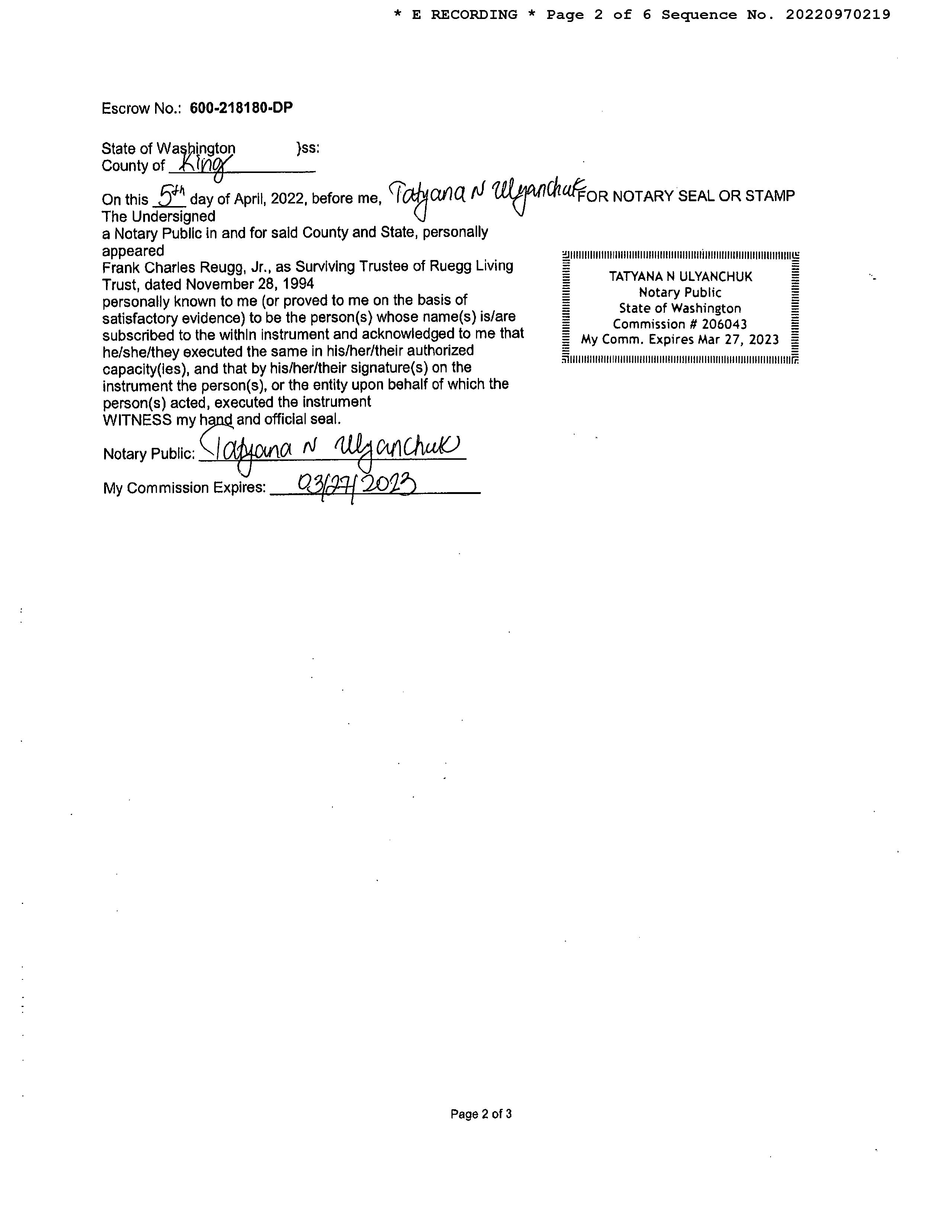 + FIRST AMERICAN TITLE, FC0, LMRA PIMA, AZ 08/26/2022 03:32PM RL13 INVESTIGATIVE SEARCH RESULTS PAGE 1 OF 1 SEARCH PARAMETERS PARCEL: 212-22-7330 PARCEL: 212-22-7330 INSTRUMENT REC DATE OWNER: LEMKE MARTHA & RICHARD AFFIDAVIT 2022 219 04/07/2022 SITUS: 2982 S PITCHFORK CT TUCSON MAIL: 1290 N FALCON RIDGE DR PLAT: LOT 00096 BLOCK LEGAL: STARR RIDGE LOT 96 CURRENT TAXES INFORMATION THROUGH 07/28/2022 LAND IMPR EXEMPT RATE AREA SPECIAL DISTRICTS PRIMARY 29,628 0 0 11.2189 0102 SECONDARY 50 30,956 0 5.5885 2021 TOTAL TAX BILLED 4,979.67 2021 TAX AMT TAX DUE INTEREST DATE PAID TOTAL DUE FIRST HALF 2,489.84 0.00 0.00 09/20/2021 0.00 SECOND HALF 2,489.83 0.00 0.00 04/08/2022 0.00 TOTAL CURRENT TAXES DUE 08/22 0.00 09/22 0.00 IMPROVEMENTS BYPASS BLDG SQFT 2,226 FULL CASH VALUE 310,061 YEAR BUILT 2010 LAND USE 01 81 NUMBER OF STORIES 1.0 LOT SIZE 1 STDLT STORIES HEIGHT 0 SCHOOL DISTRICT 0102 EXTERIOR WALLS FRAME WOOD LAND FULL CASH VALUE 502 GRADE MATERIALS IMPR FULL CASH VALUE 309,559 SALES SALE DATE SALE AMOUNT INSTRUMENT TYPE SELLER NAME VALIDITY 04/07/2022 595,000 2022 219 WD RUEGG LIVING TRUST 04/12/2012 315,000 2012 1030816 WD JOHN HERDER BUILDING INC 01/29/2010 2,900,000 13735 1347 SW WILLIAM & ROGERS COMPANY ADDITIONAL PROPERTY INFORMATION STANDARD LAND USE: SFR END SEARCH