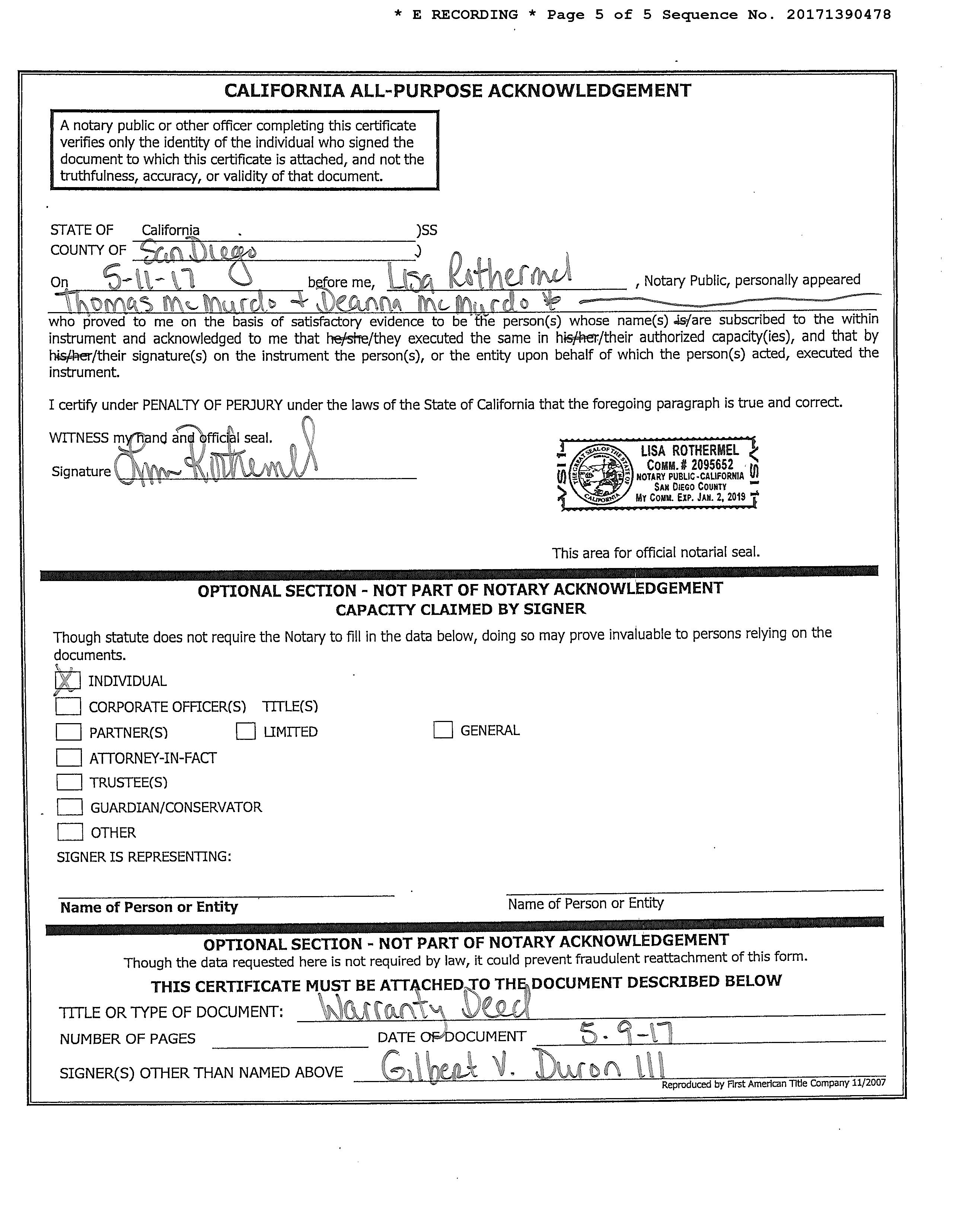 Owner Name : Mc Murdo Thomas / Mc Murdo Deanna Mailing Address : 10050 Boulder Knolls Dr, Escondido CA 92026-6624 R015