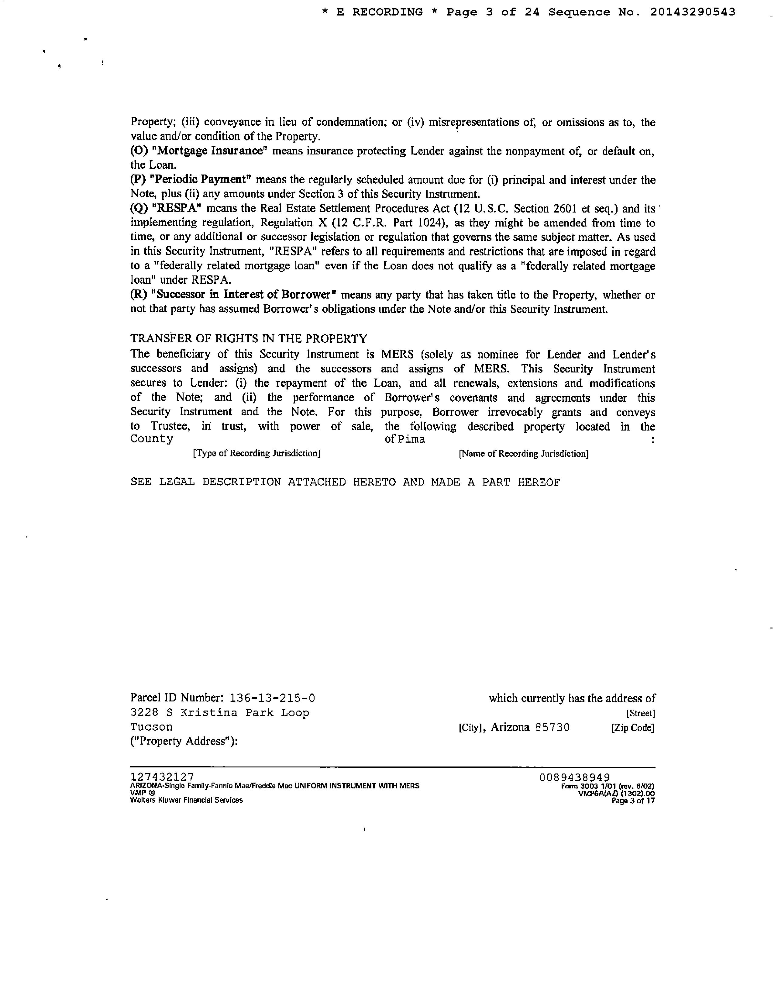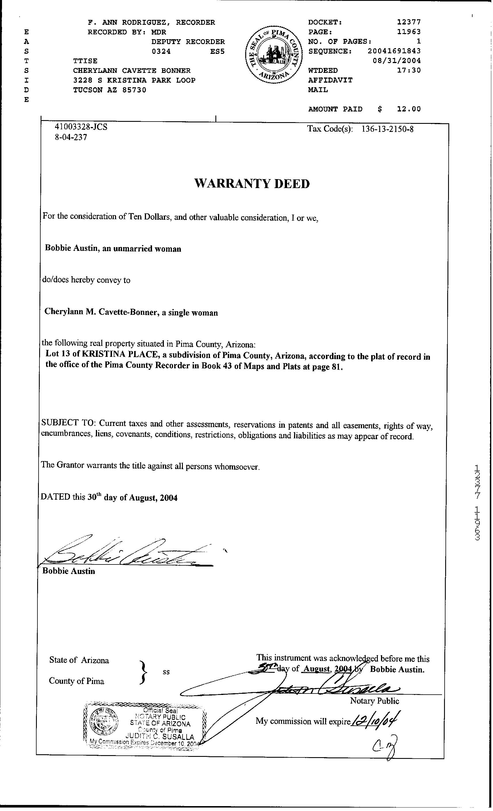 Subject Property : 3228 S Kristina Park Loop Tucson AZ 85730 Owner Information Owner Name : Cavette-bonner Cherylann M Mailing Address : 3228 S Kristina Park Loop, Tucson AZ 85730-2957 C062 Vesting Codes : Single Woman / / Owner OccupiedIndicator : O Location Information Legal Description : Kristina Place Lot 13 County : Pima, Az APN : 136-13-2150 Census Tract / Block : 40.56 / 2 Subdivision : Kristina Place Township-Range- Sect : 14S-15E-27 Map Reference : 27-14S-15E Legal Book/Page : 43-81 School District : Tucson Unified Legal Lot : 13 Munic/Township : Tucson Unified Market Area : 91 Last Market Sale Information Recording/Sale Date : 08/31/2004 / 08/00/2004 1st Mtg Int. Rate/Type : 5.87% / Fixed Rate Loan Sale Price : $169,000 1st Mtg Document # : 12377-11964 Document # : 12377-11963 1st Mtg Term : 30 Deed Type : Warranty Deed Price Per SqFt : $108.89 1st Mtg Amount/Type : $174,577 / Va Title Company : Title Security Inc Lender : Nova Fin'l & Inv Corp Seller Name : Austin Bobbie Prior Sale Information Prior Rec/Sale Date : 01/31/2003 / 01/00/2003 Prior Lender : Wells Fargo Hm Mtg Inc Prior Sale Price : $131,500 Prior 1st Mtg Amt/Type : $60,000 / Conv Prior Doc Number : 11978-4643 Prior 1st Mtg Rate/Type : / Fixed Rate Loan Prior Deed Type : Warranty Deed