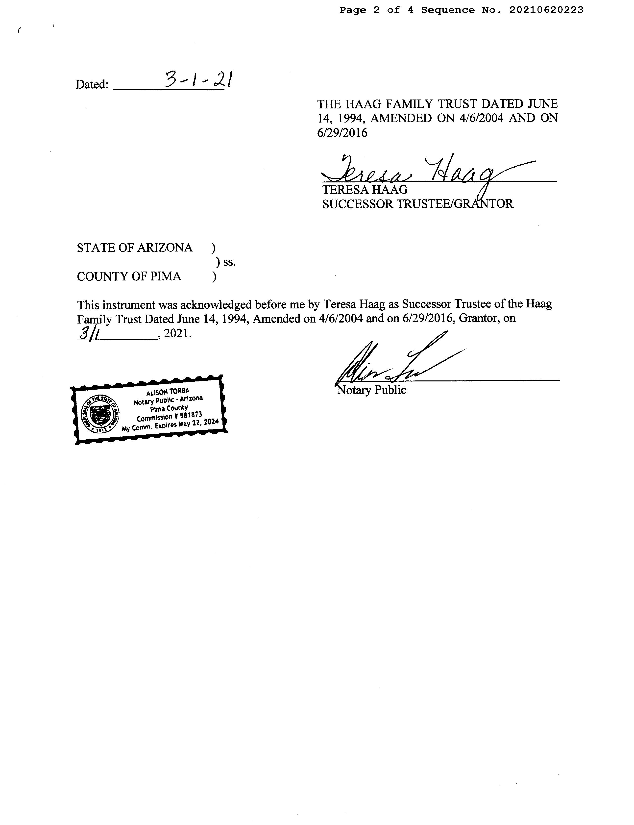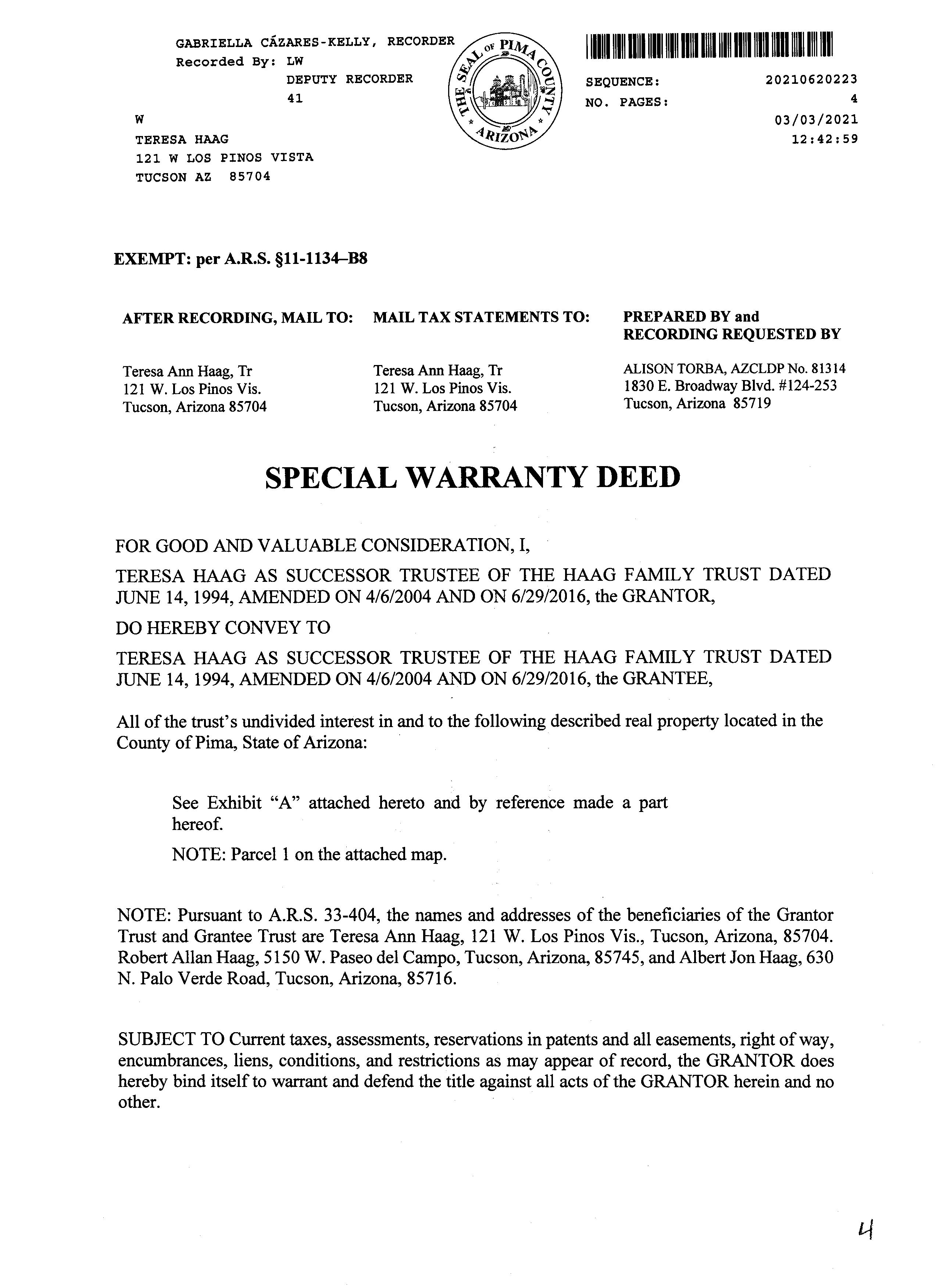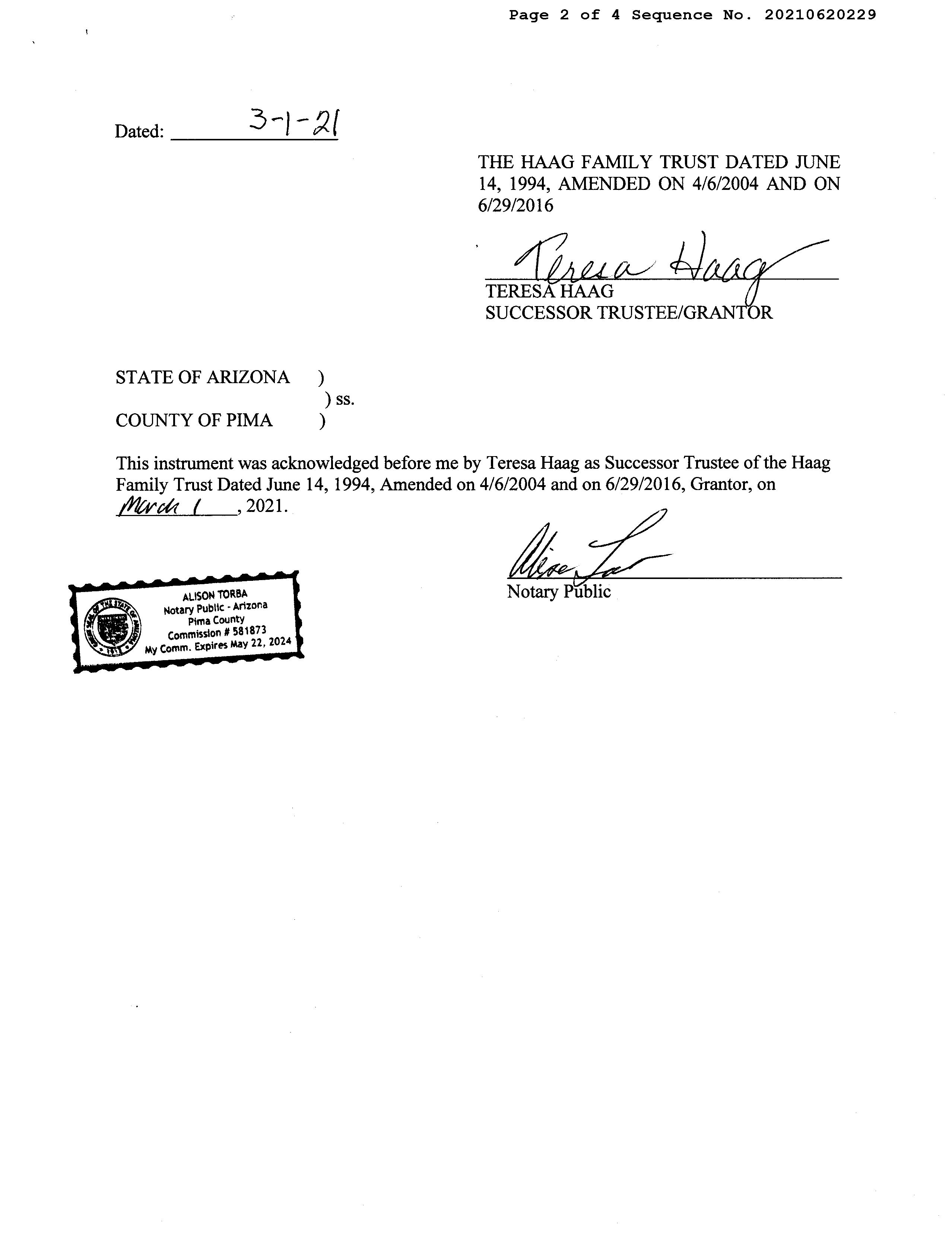 Owner Name: Varner David A & Karin / APN / Alternate APN: 303-54-1200 / Deed Type: Warranty Deed Land Use: Sfr Subdivision / Tract: Sahuarita Highlands / Lot Size: 67,044 Year Built / Eff: 2011 / Rec. Date / Price: 02/23/2022 / $525,000 Living Area: 2,575 # of units: