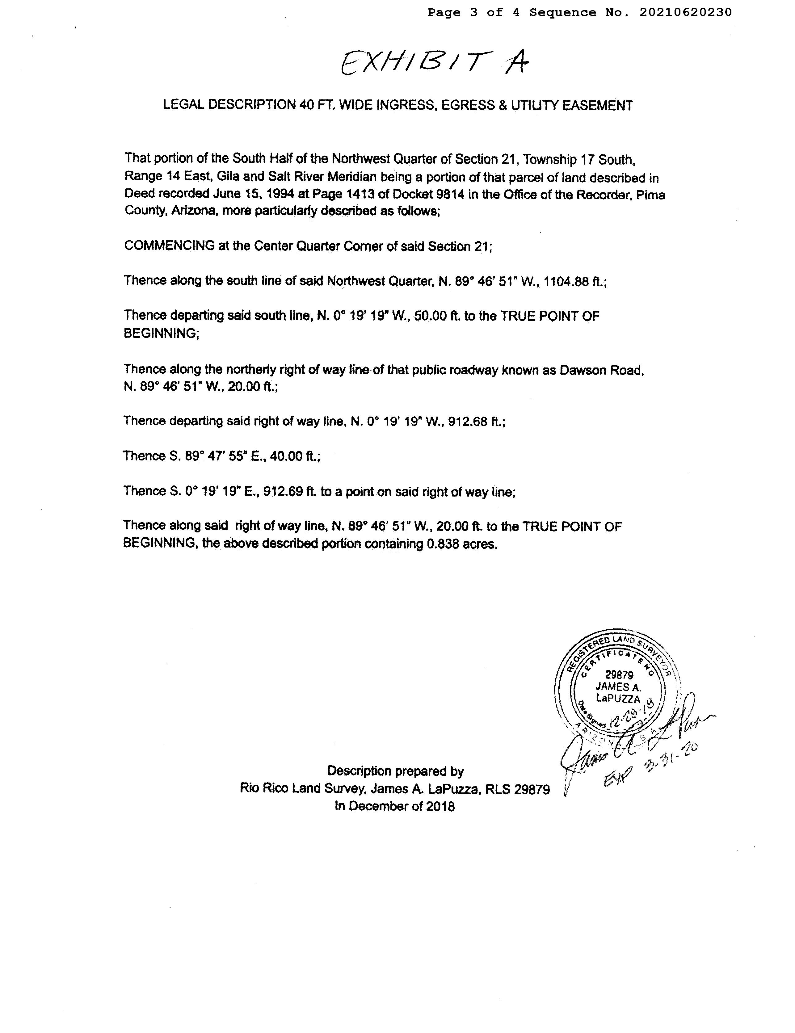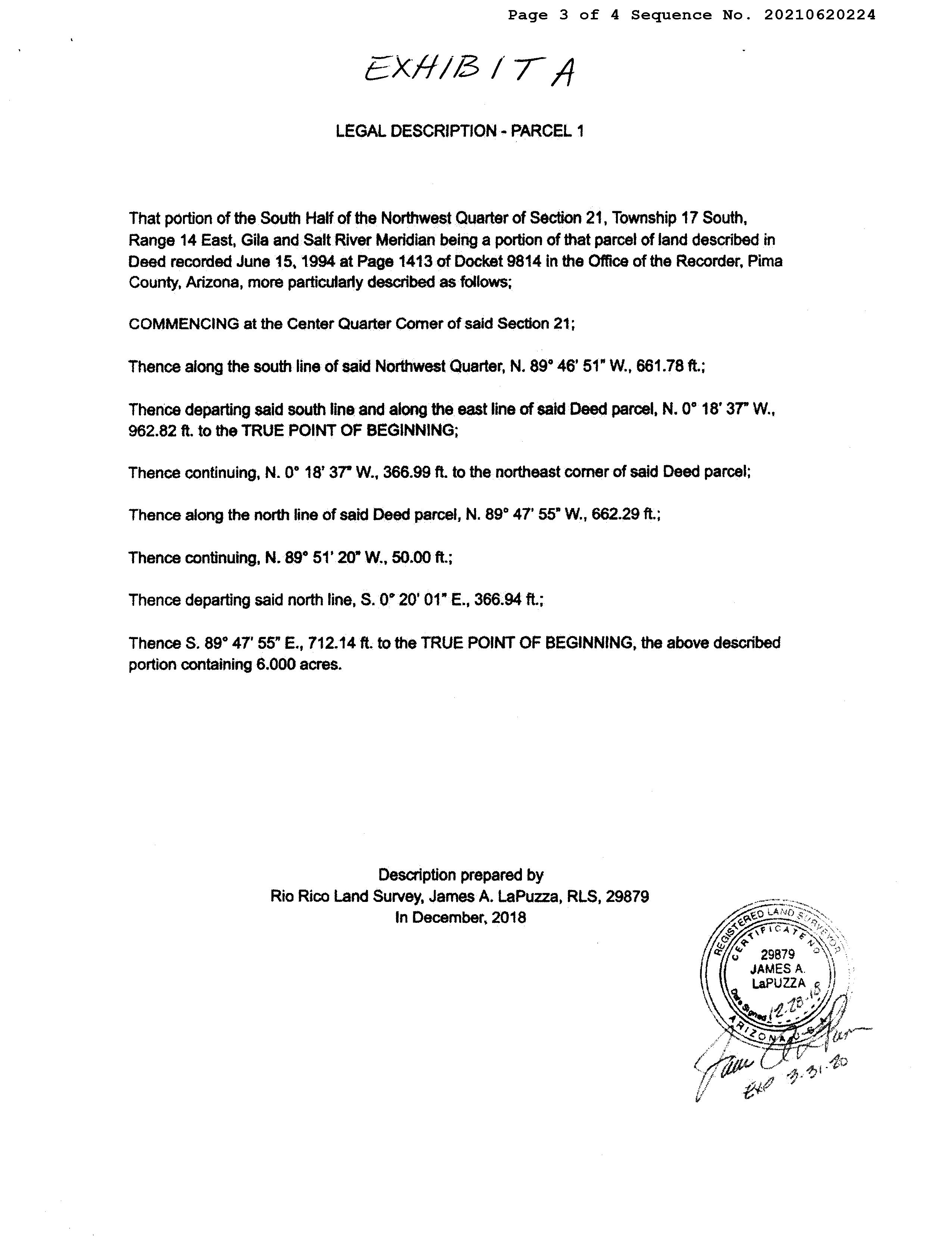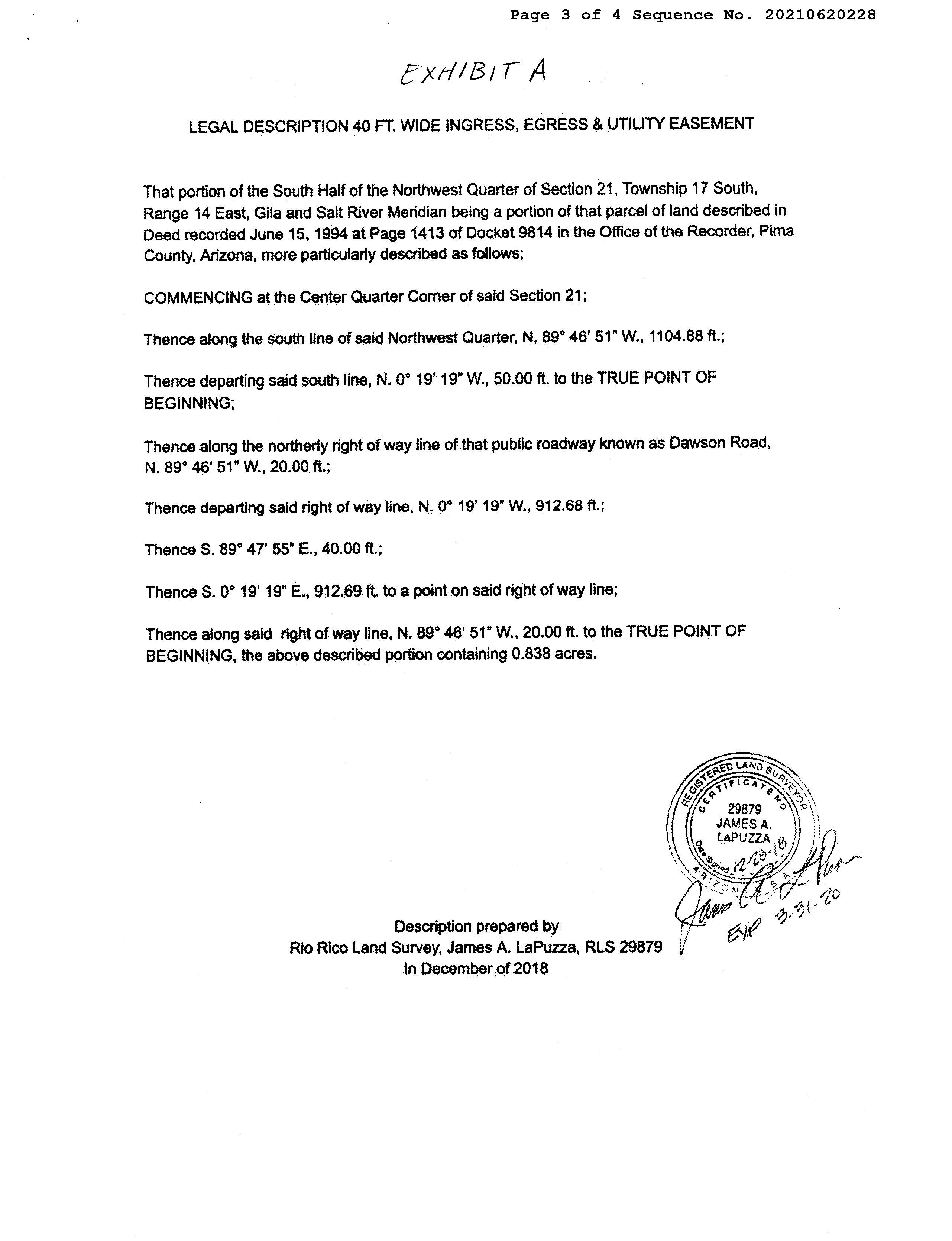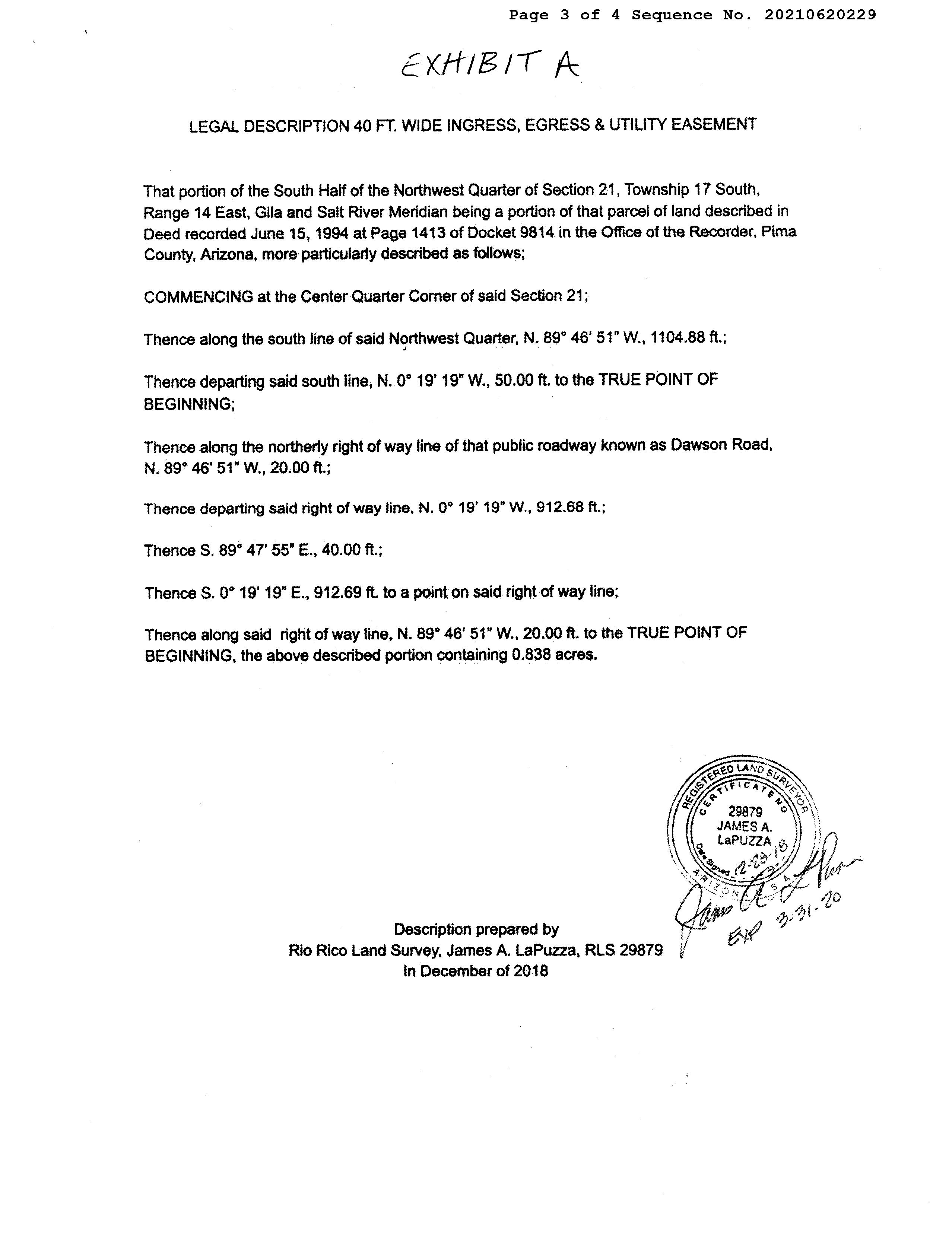 Subject Property : 3301 E Dawson Rd Sahuarita AZ 85629 Owner Information Owner Name : Zee & Gigi Mailing Address : 630 N Palo Verde Blvd, Tucson AZ 85716-4634 C018 Vesting Codes : / / Trust Owner OccupiedIndicator : A Location Information Legal Description : Ctrl Ptn Nw4 6.00 Ac Sec 21-17-14 County : Pima, Az APN : 303-63-050J Census Tract / Block : 41.27 / 3 Map Reference : 21-17S-14E Township-Range- Sect : 17S-14E-21 Owner Transfer Information Recording/Sale Date : Year / Property Information Land Use : Sfr Lot Acres : 5.96 State Use : Sfr Imp-on Acres/rural5+ County Use : Sfr Imp-on Acres/rural5+ Lot Size : 259,630 Tax Information Assessed Year : 2021 Current YearValue :Total $11,749 Current YearValue :Land $50 Current AssessedYear : 2023 Current ImprovementYearValue : $11,699 Customer Name : Jeremiah Stiffler Customer Company Name : First American Prepared On : 08/30/2022 © 2022 CoreLogic. All rights reserved