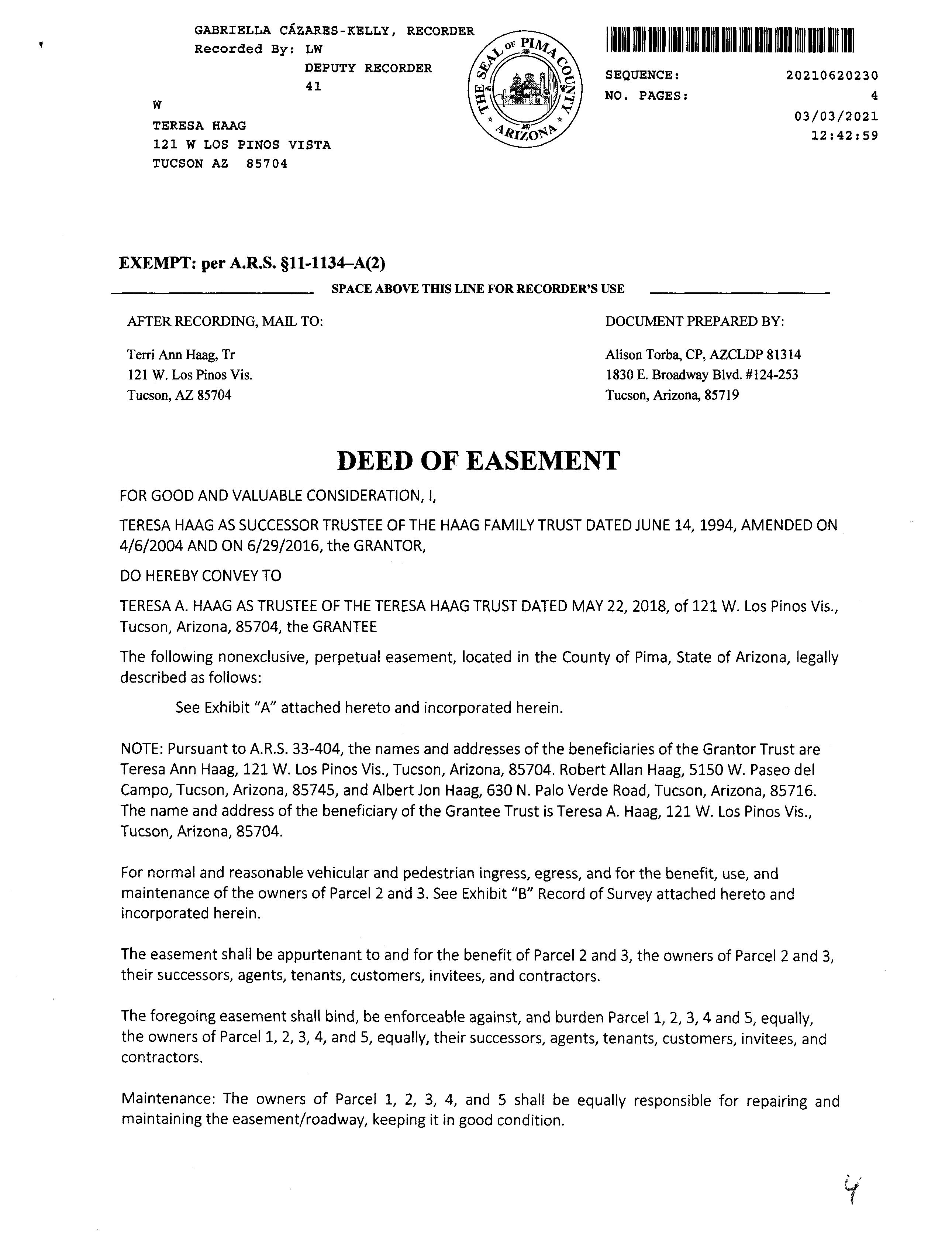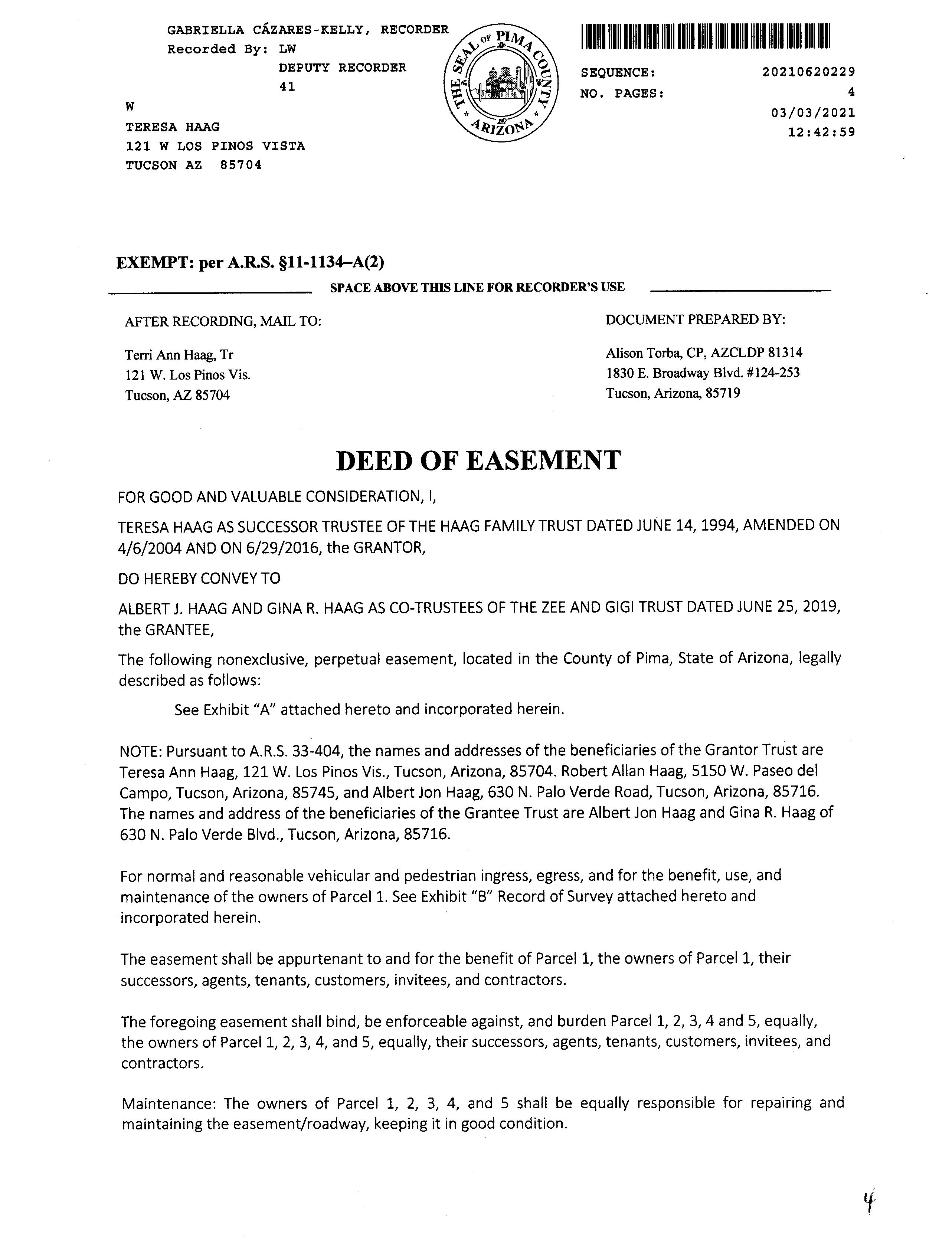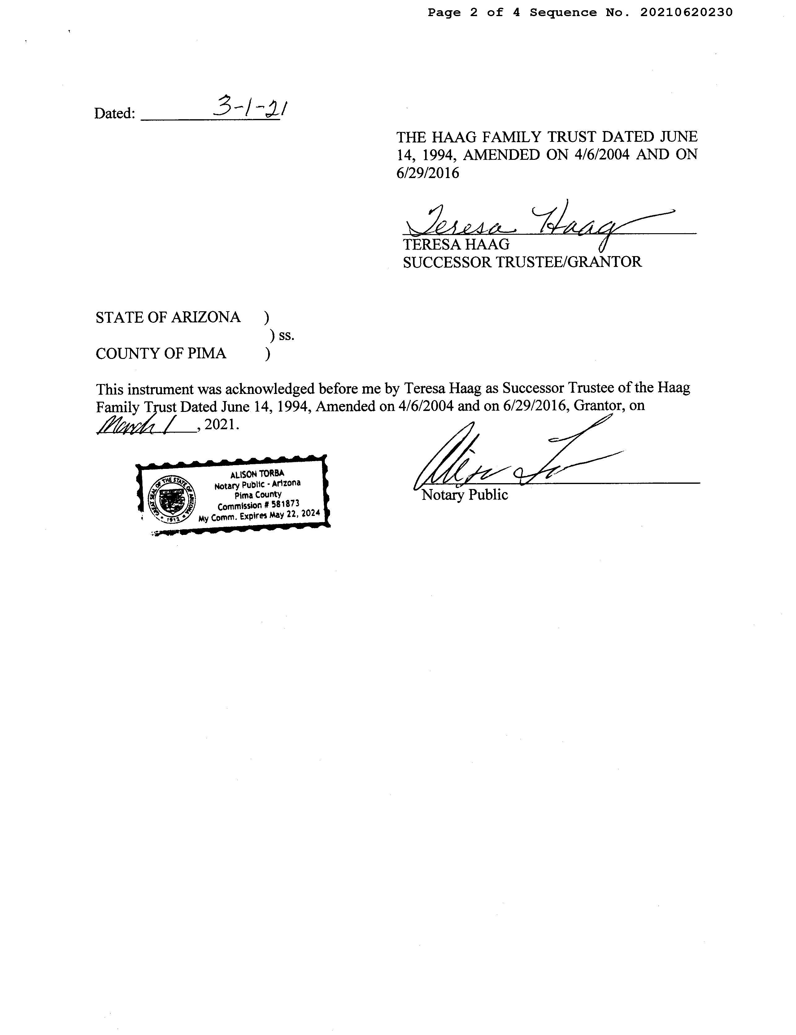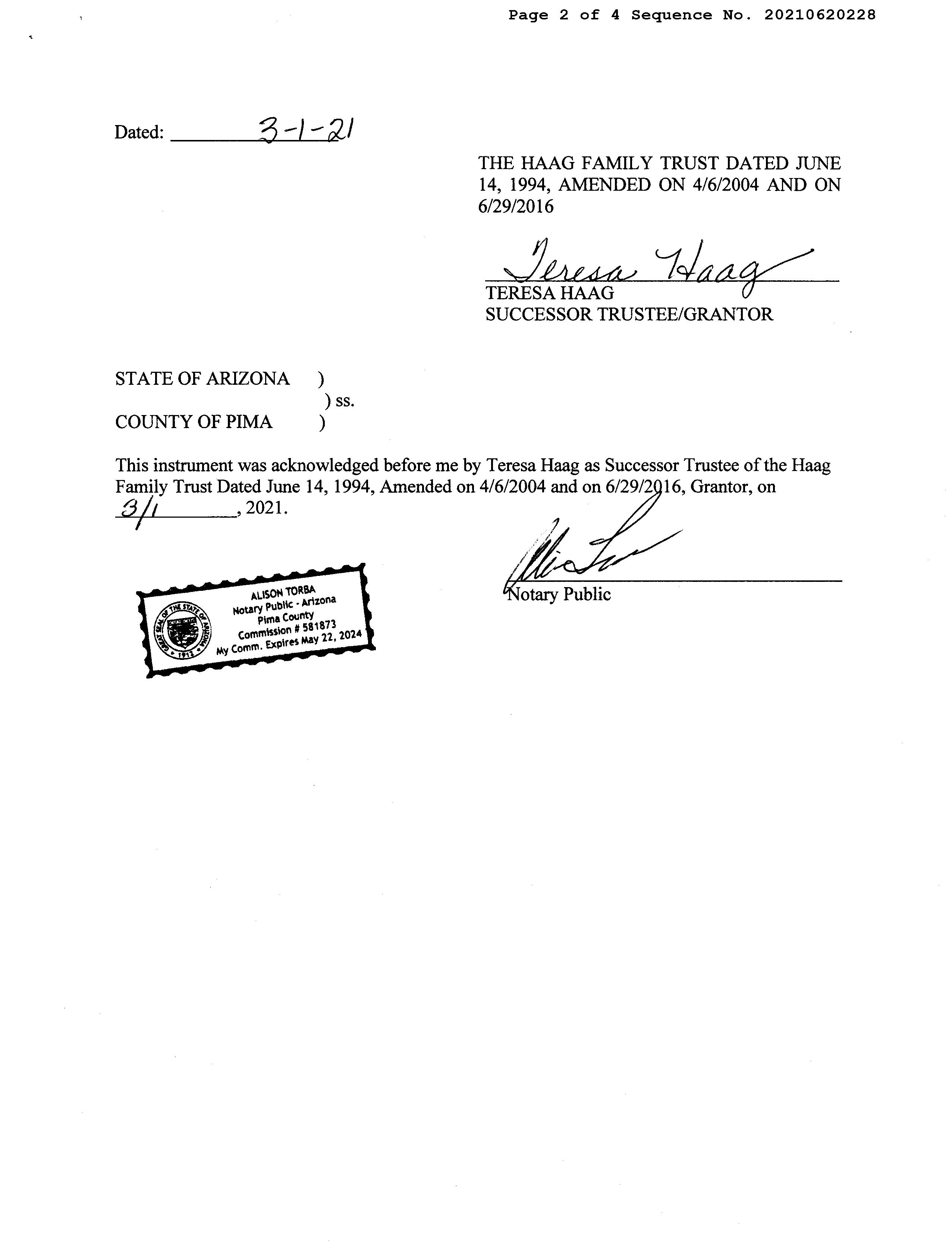 Subject Property : 3301 E Dawson Rd Sahuarita AZ 85629 Owner Information Owner Name : Zee & Gigi Mailing Address : 630 N Palo Verde Blvd, Tucson AZ 85716-4634 C018 Vesting Codes : / / Trust Owner OccupiedIndicator : A Location Information Legal Description : Ctrl Ptn Nw4 6.00 Ac Sec 21-17-14 County : Pima, Az APN : 303-63-050J Census Tract / Block : 41.27 / 3 Map Reference : 21-17S-14E Township-Range- Sect : 17S-14E-21 Owner Transfer Information Recording/Sale Date : Year / Property Information Land Use : Sfr Lot Acres : 5.96 State Use : Sfr Imp-on Acres/rural5+ County Use : Sfr Imp-on Acres/rural5+ Lot Size : 259,630 Tax Information Assessed Year : 2021 Current YearValue :Total $11,749 Current YearValue :Land $50 Current AssessedYear : 2023 Current ImprovementYearValue : $11,699 Customer Name : Jeremiah Stiffler Customer Company Name : First American Prepared On : 08/30/2022 © 2022 CoreLogic. All rights reserved