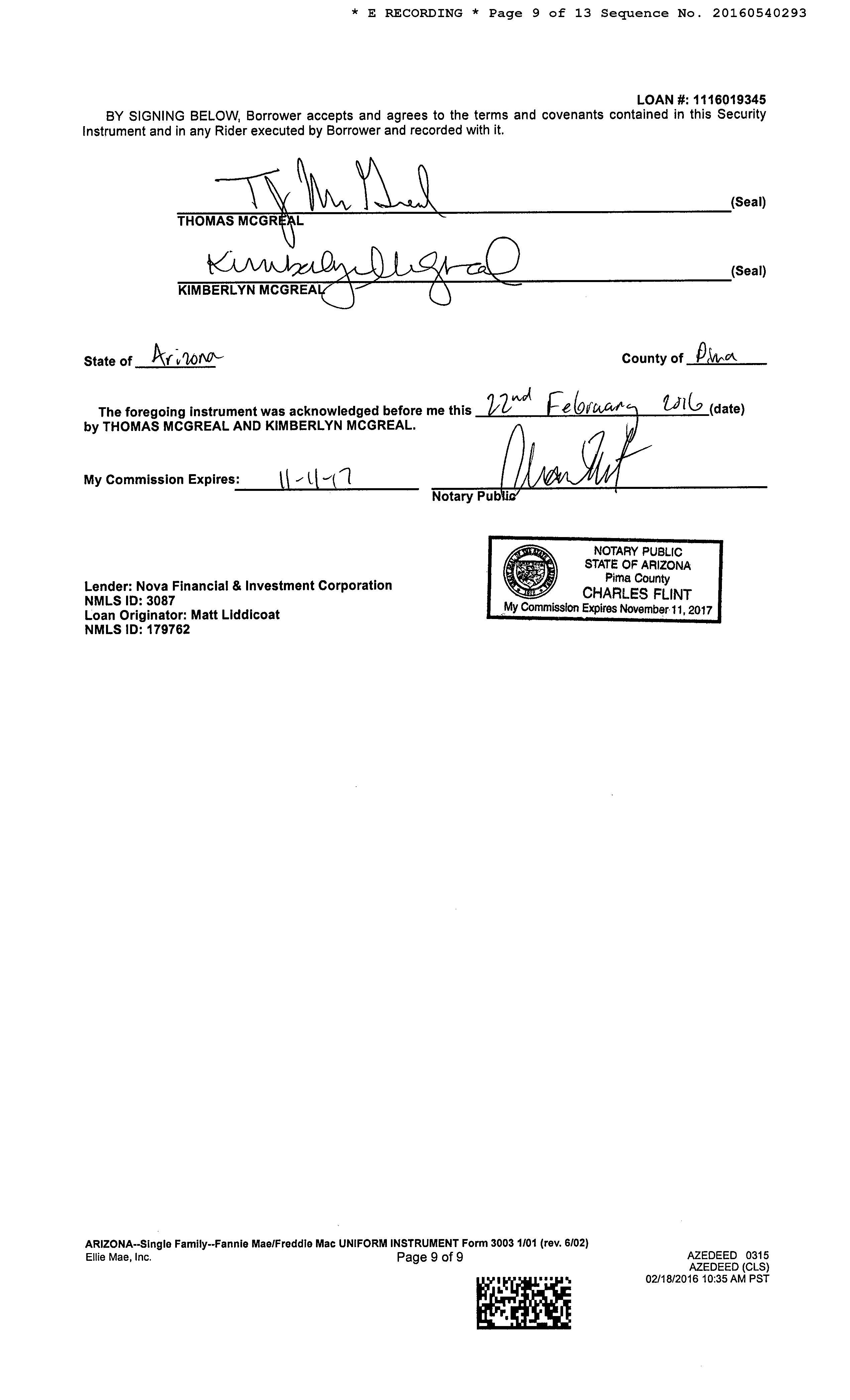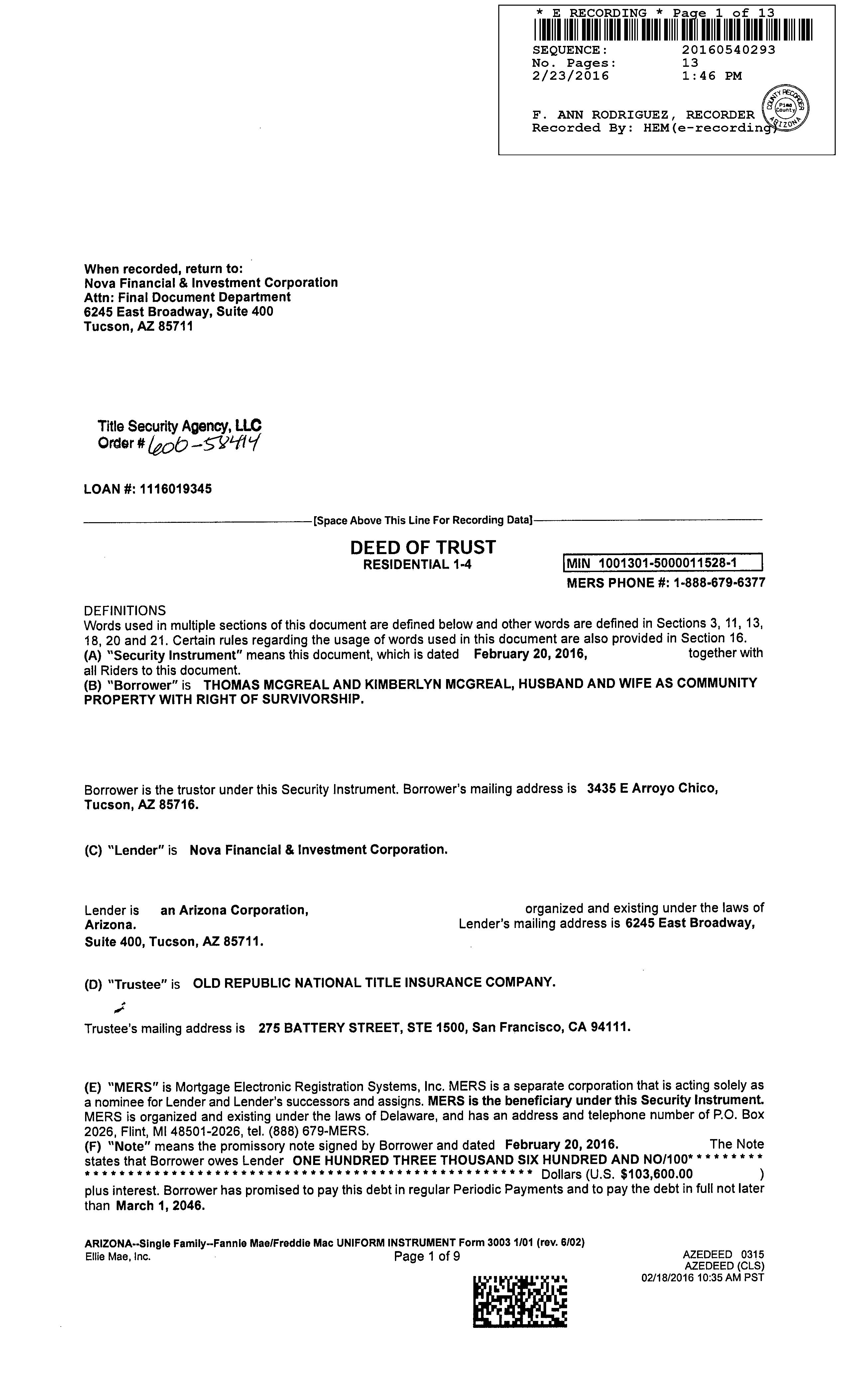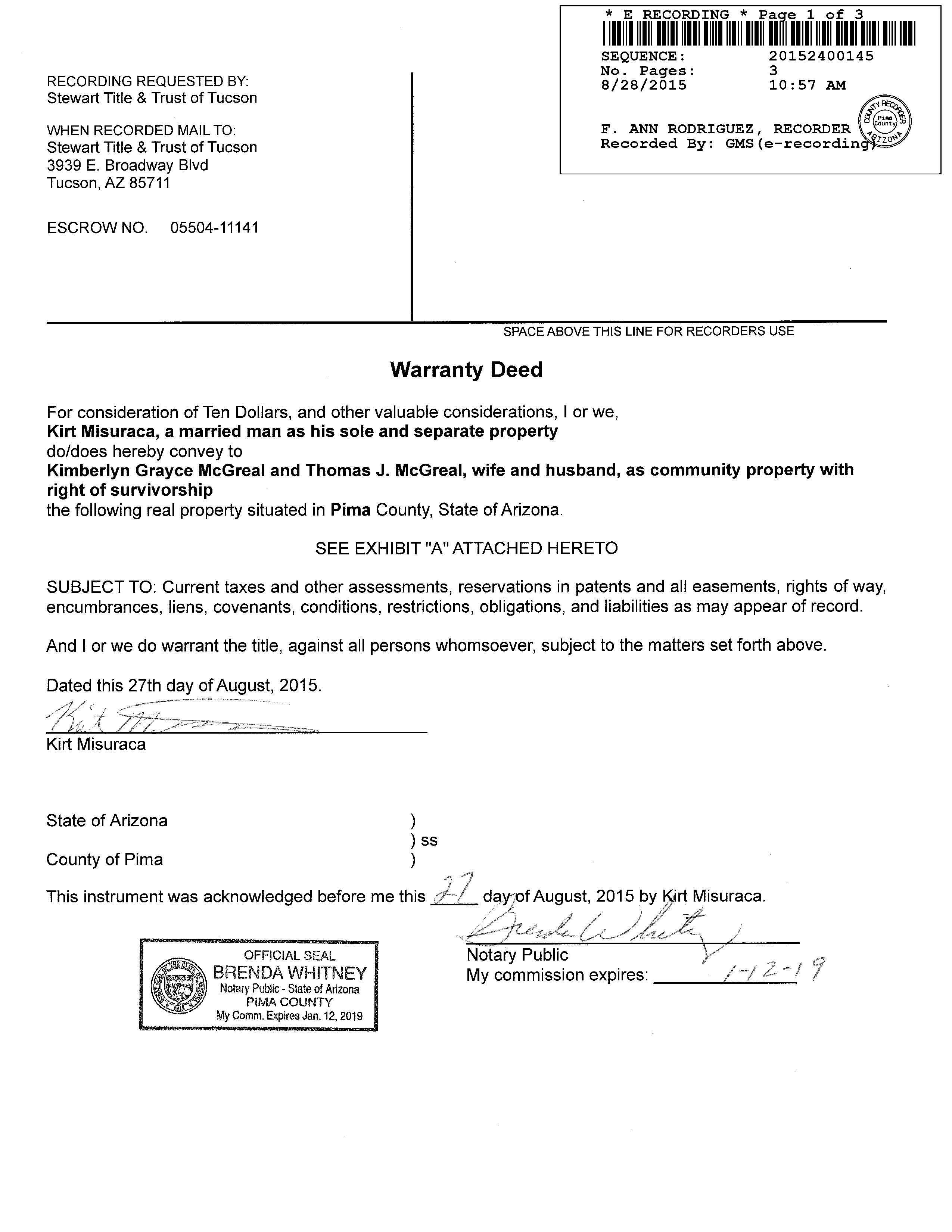 Subject Property : 3344 N Flanwill Blvd Tucson AZ 85716 Owner Information Owner Name : Mc Greal Kimberlyn Gracyce / Mc Greal Thomas J Mailing Address : 821 N Treat Ave, Tucson AZ 85716-4144 C005 Vesting Codes : / / Community Property Owner OccupiedIndicator : A Location Information Legal Description : E151.5' W676.5' S120.65' N328' Sw4 Sw4 .42 Ac Sec 28-13-14 County : Pima, Az APN : 111-03-156A Census Tract / Block : 28.01 / 1 Map Reference : 28-13S-14E Township-Range- Sect : 13S-14E-28 School District : Tucson Unified Market Area : 40 Munic/Township : Tucson Unified Last Market Sale Information Recording/Sale Date : 08/28/2015 / 08/27/2015 Deed Type : Warranty Deed Sale Price : $105,900 Price Per SqFt : $104.96 Document # : 2400145 Title Company : Stewart Title & Tr/tucson Seller Name : Misuraca Kirt Prior Sale Information Prior Rec/Sale Date : 11/05/1993 / 10/00/1993 Prior Deed Type : Warranty Deed Prior Sale Price : $95,000 Prior 1st Mtg Amt/Type : $94,000 / Conv Prior Doc Number : 9663-83 Property Characteristics Gross Area : 1,009 Parking Type : None Patio Type : Covered Patio Living Area : 1,009 Roof Material : Metal Air Cond : Refrigeration Total Rooms : 5 Heat Type : Forced Air Quality : Fair Year Built / Eff : 1950 Cooling Type : Forced Air Condition : Average # of Stories : 1 Exterior wall : Stucco Bath Fixtures : 3 Customer Name : Jeremiah Stiffler Customer Company Name : First American Prepared On : 08/30/2022 © 2022 CoreLogic. All rights reserved