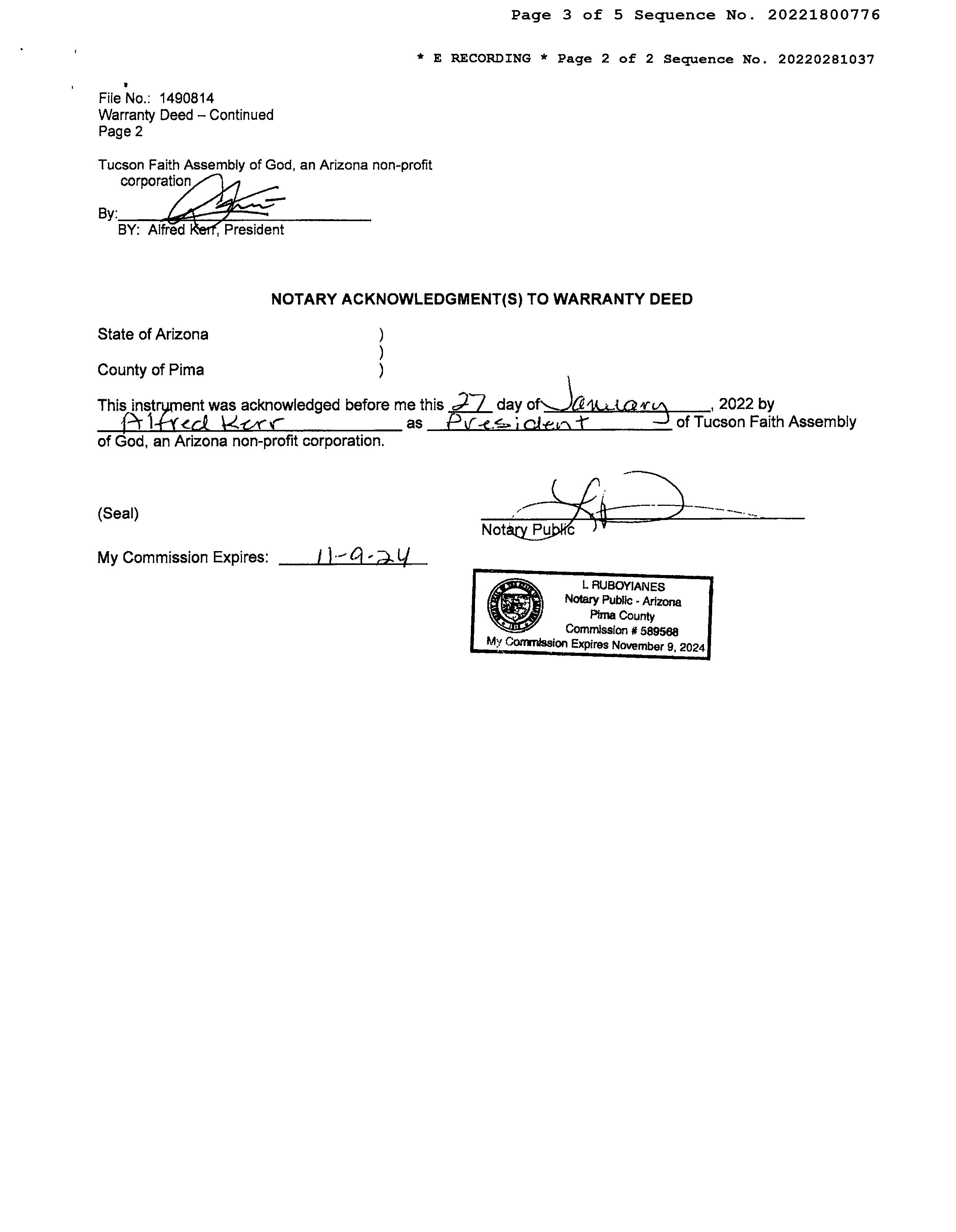 SALES SALE DATE SALE AMOUNT INSTRUMENT TYPE SELLER NAME VALIDITY 01/28/2022 535,000    2022 1037 WD TUCSON FAITH ASSEMBLY OF G M ADDITIONAL PROPERTY INFORMATION STANDARD LAND USE: COMMERCIAL (NEC) END SEARCH