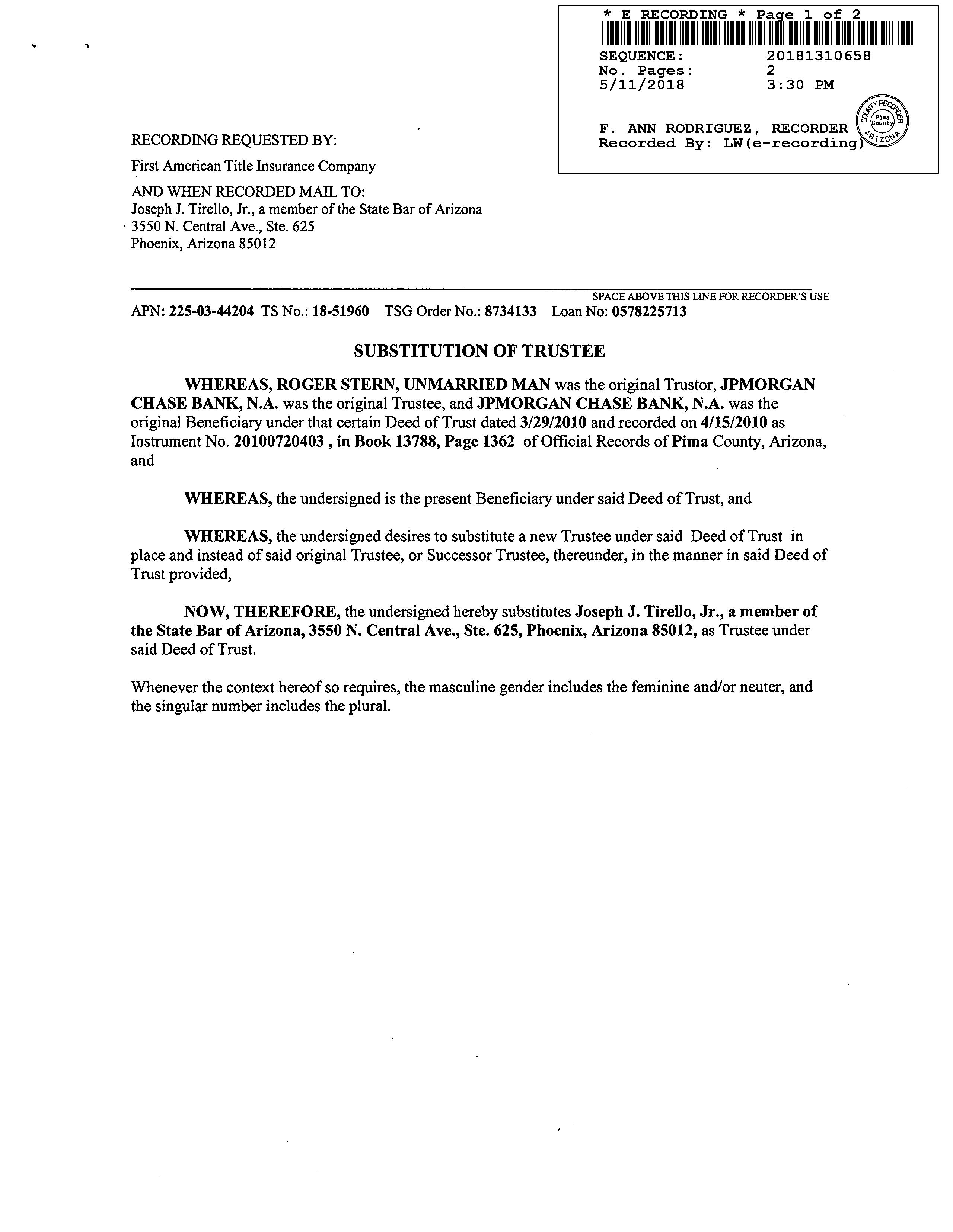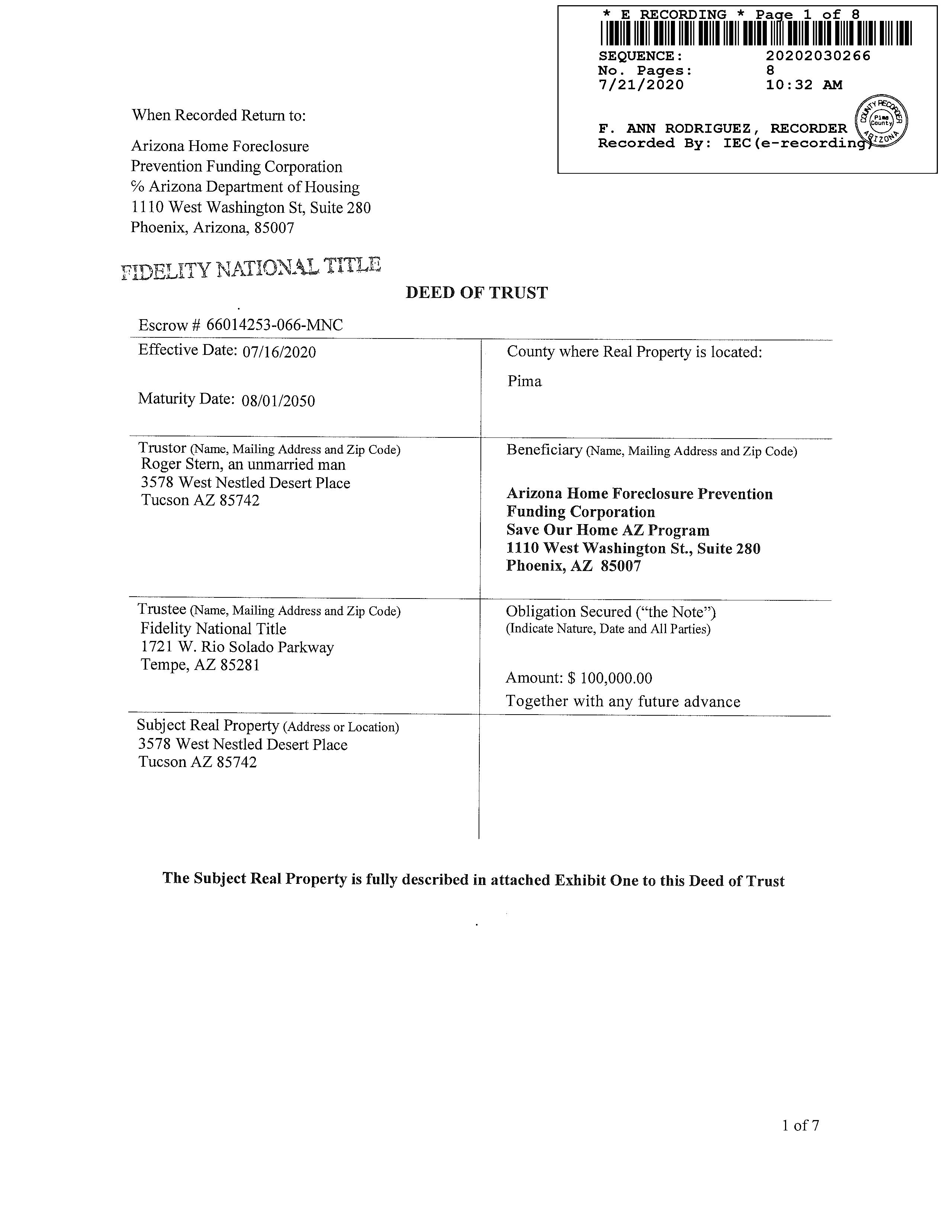 Owner Name: Stern Roger Vesting: Unmarried Man Mailing Address: 3578 W Nestled Desert Pl, Tucson, AZ 85742-8638